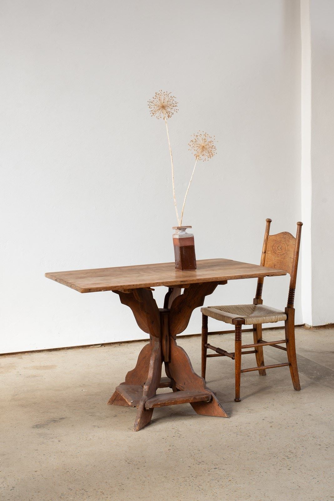 A 19th-century Swedish Stralabord table, its top constructed from wide pine planks, which show some light remnants of the original pinkish-red painted surface.  The central pillar is hand-carved in a typical rustic folk art style and has been historically stained a deeper tone to contrast with the top.