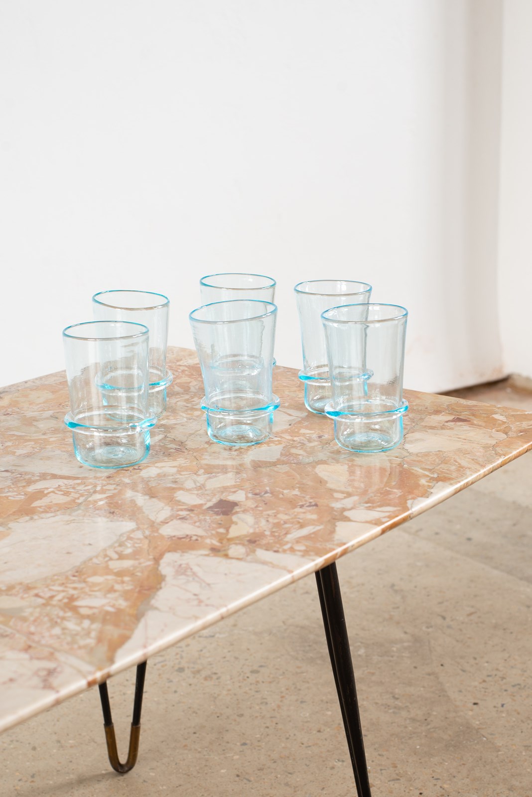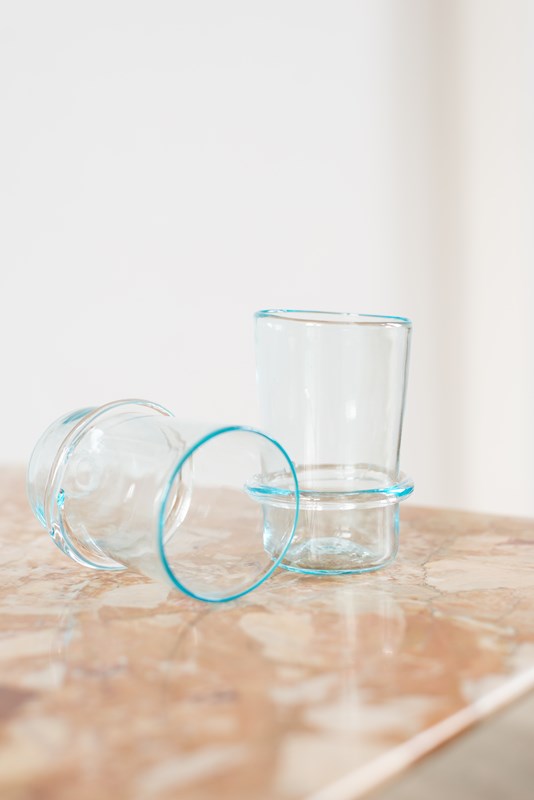 We have a small collection of soft blue hand-blown glasses from Murano, Italy C1960. Each piece has its own character, with the size, shape and finish not uniform, and they are all the more beautiful for it. Blown with a finesse befitting the skill of these world-renowned glass masters. Price is per pair.