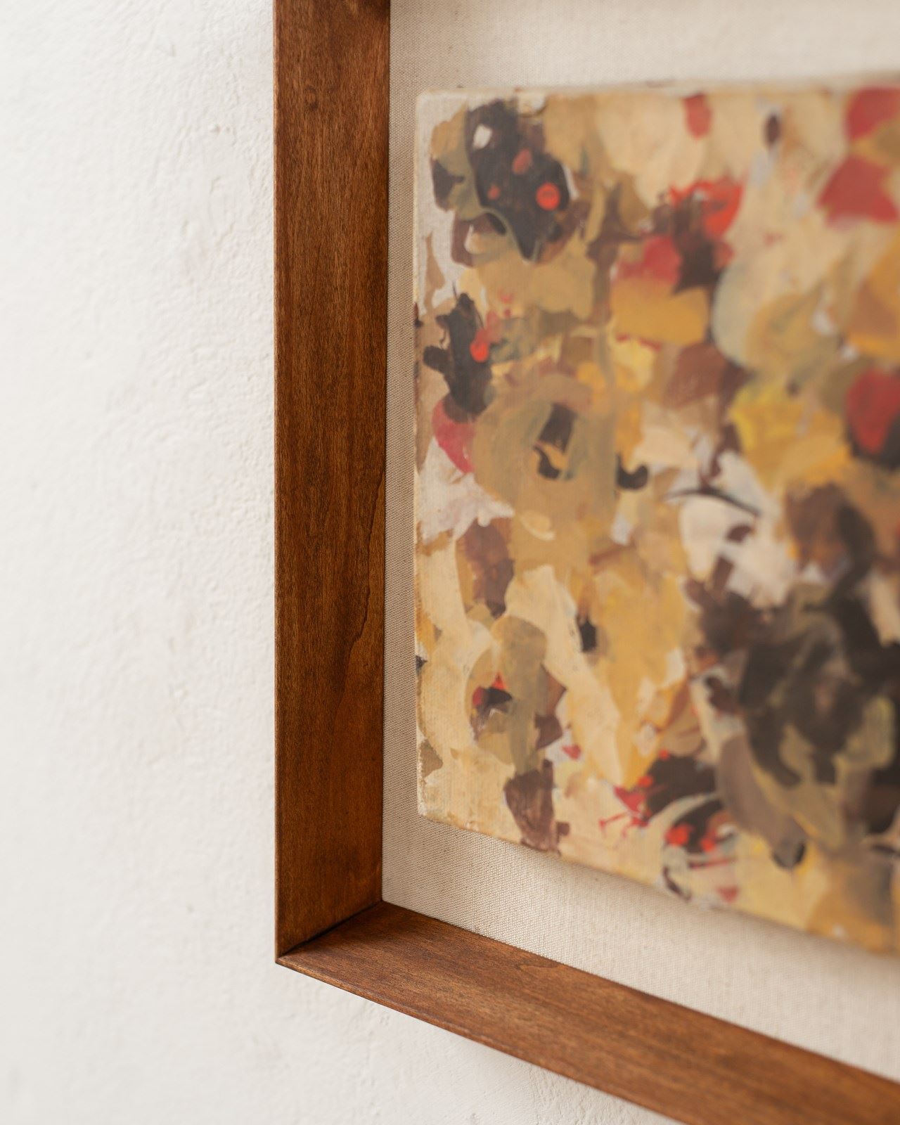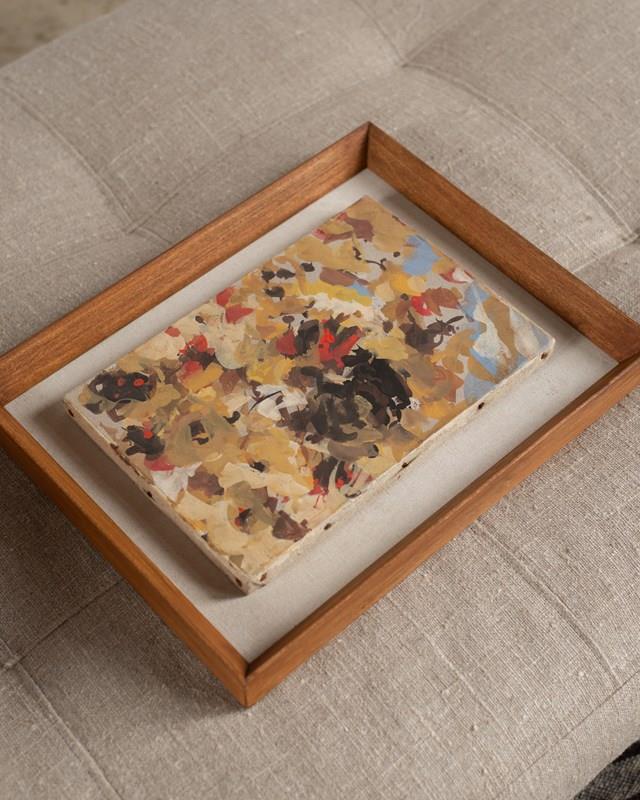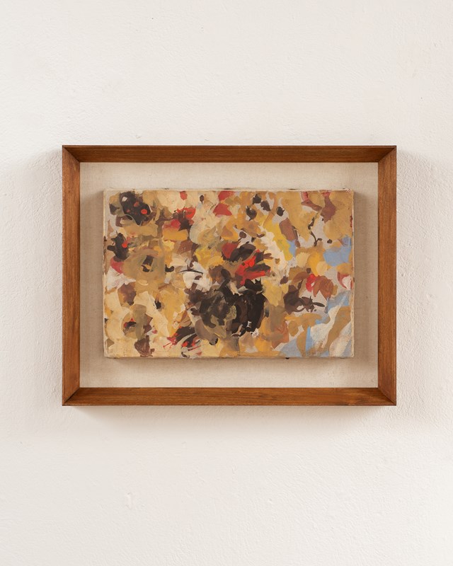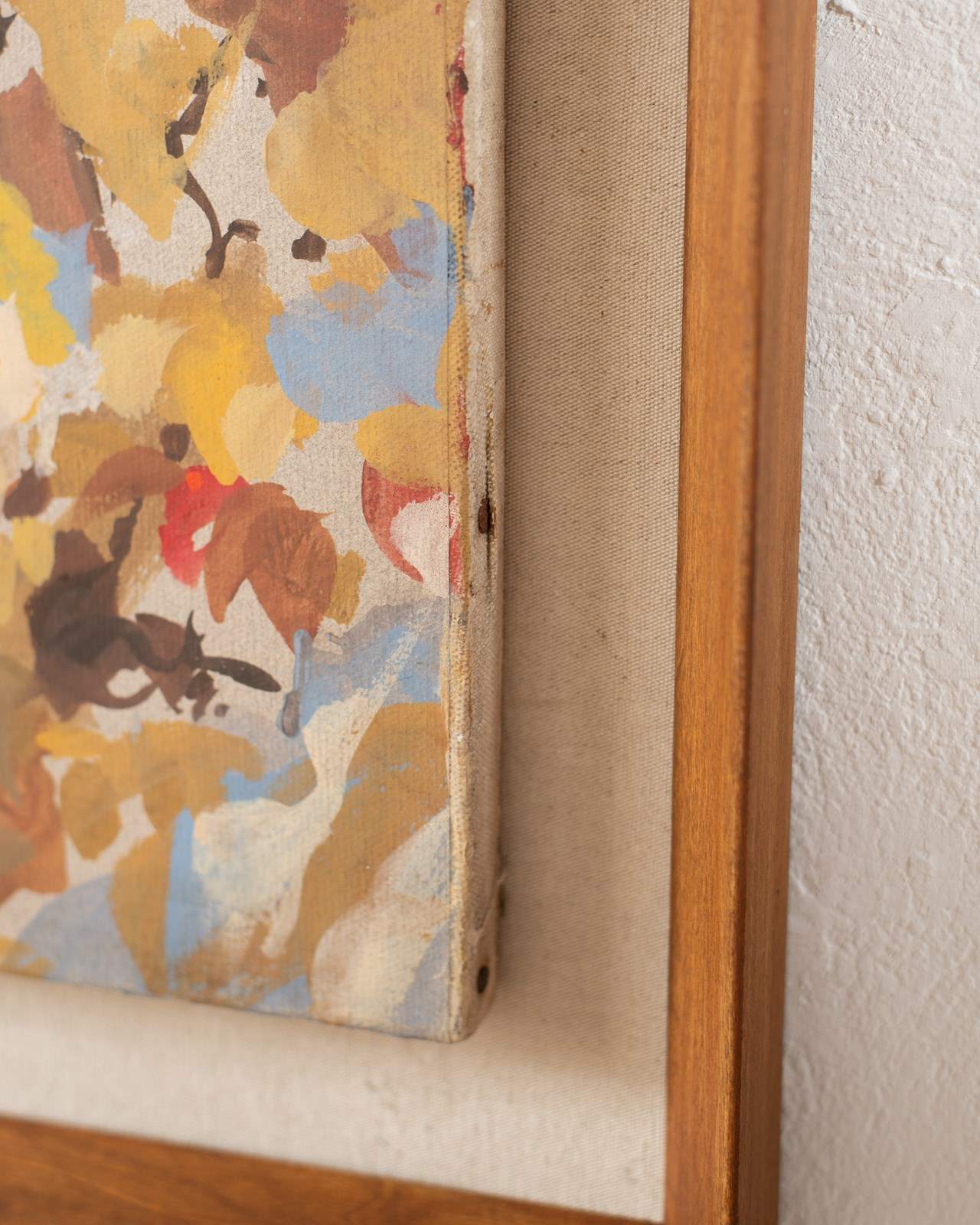 An abstract expressionist work in acrylic on canvas from France, dating from the second half of the 20th century.   There is a feeling of flowers and foliage amidst the strokes of tan, brown, caramel and sky blue, punctuated with an orange-toned red.  The work is presented within a hand-stained wooden tray frame and set on natural antique French linen.