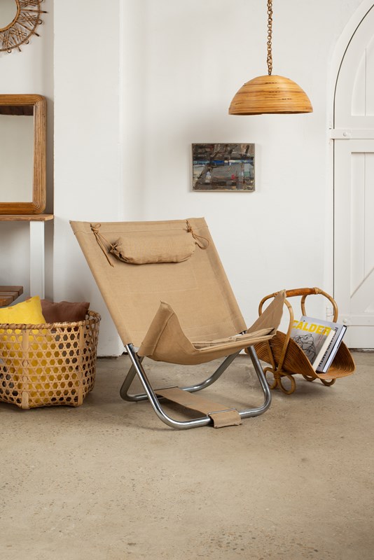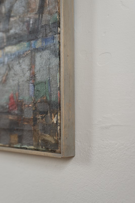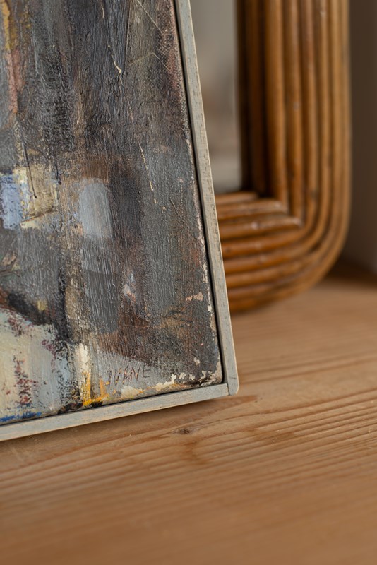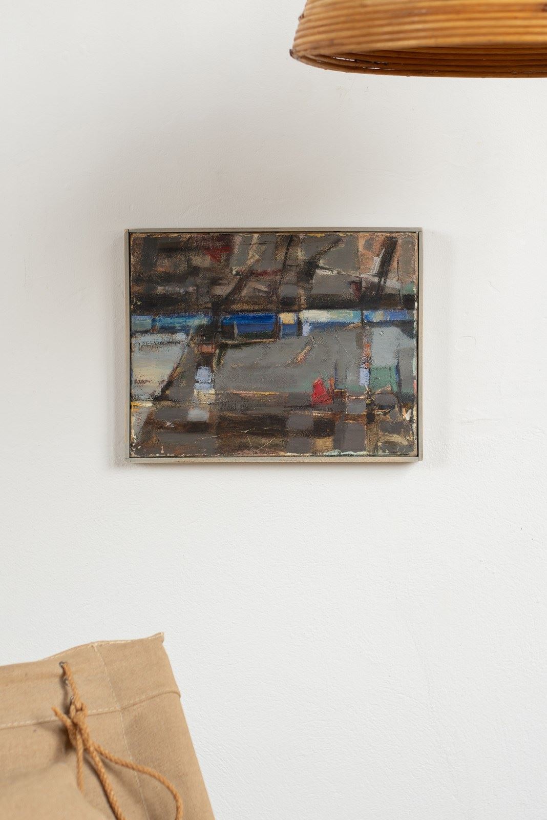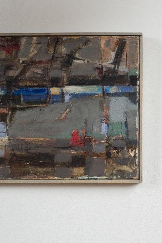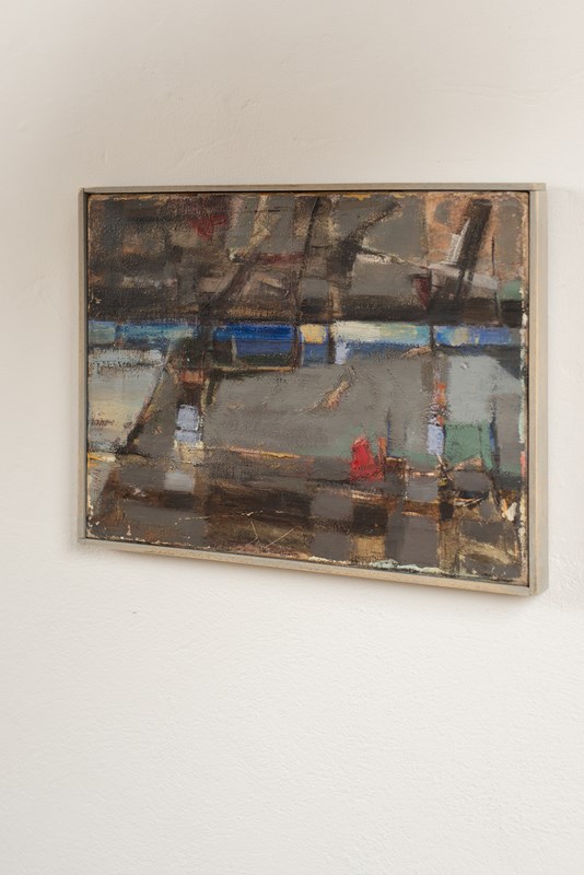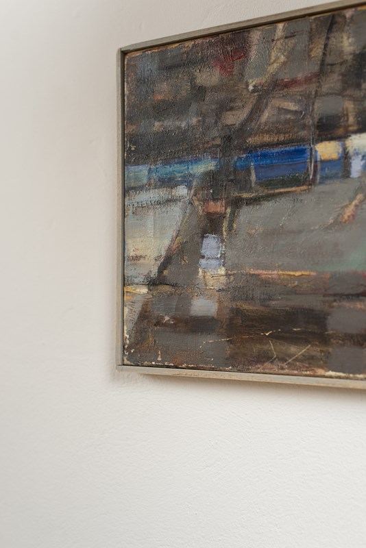 An abstract vintage work in oil on canvas depicting a waterside.  Painted in a palette of tonal blues and greys, with a brief interjection of primary red.  The piece is presented in a simplistic, soft grey hand-painted studio frame.  Anon and undated.