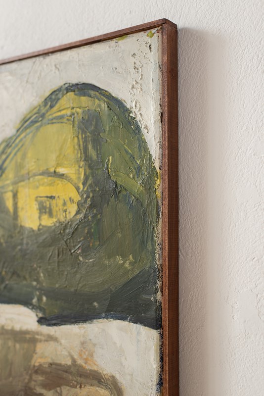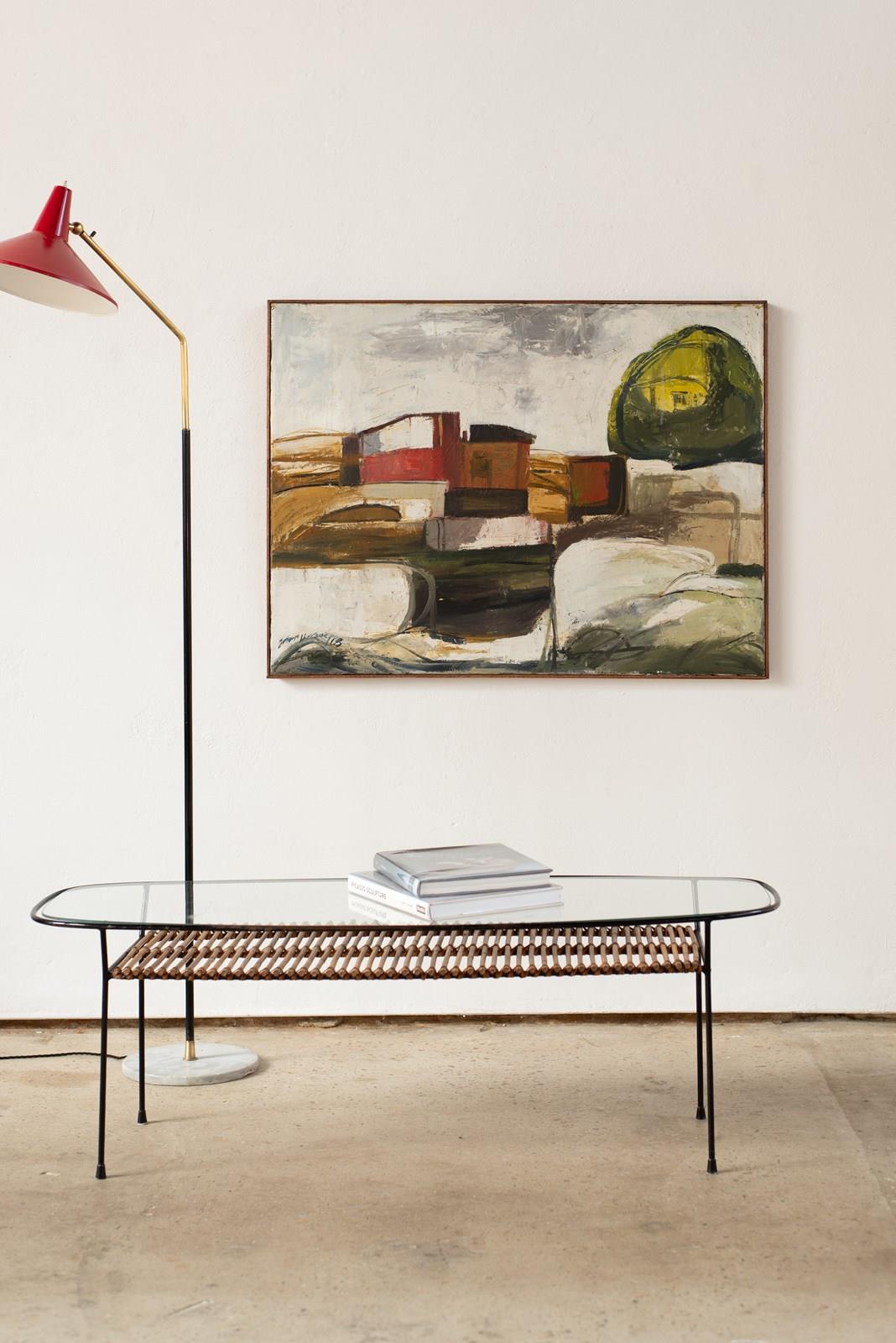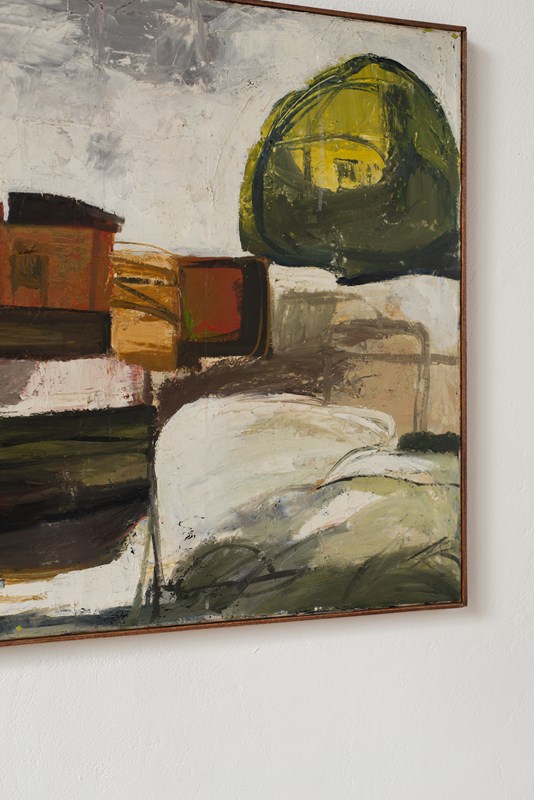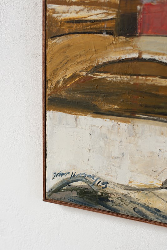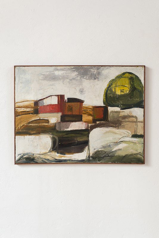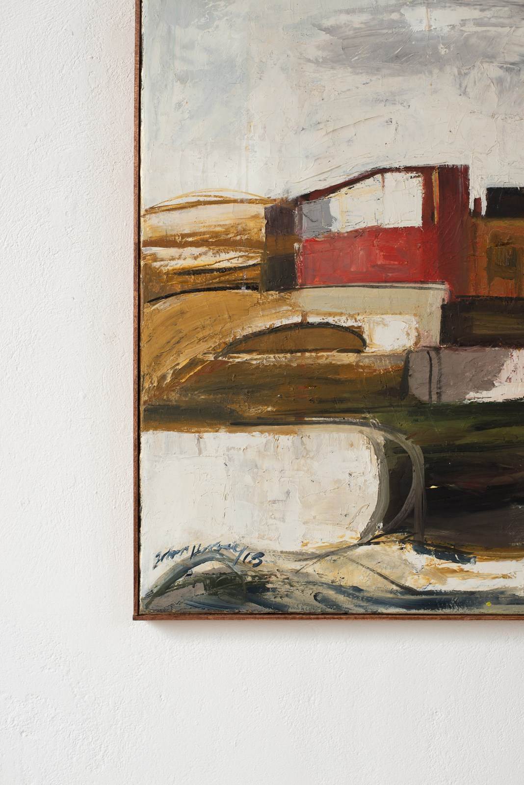 A large-scale abstract landscape in acrylic on canvas, by artist John Harvey, signed and dated 1963.   With a textural soft-white backdrop, punctuated with subdued tones of green, brown and coral-red. Presented in a hand-stained wooden artist's frame.