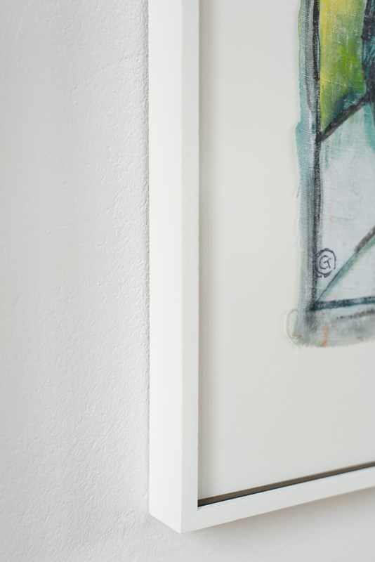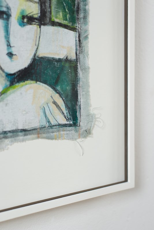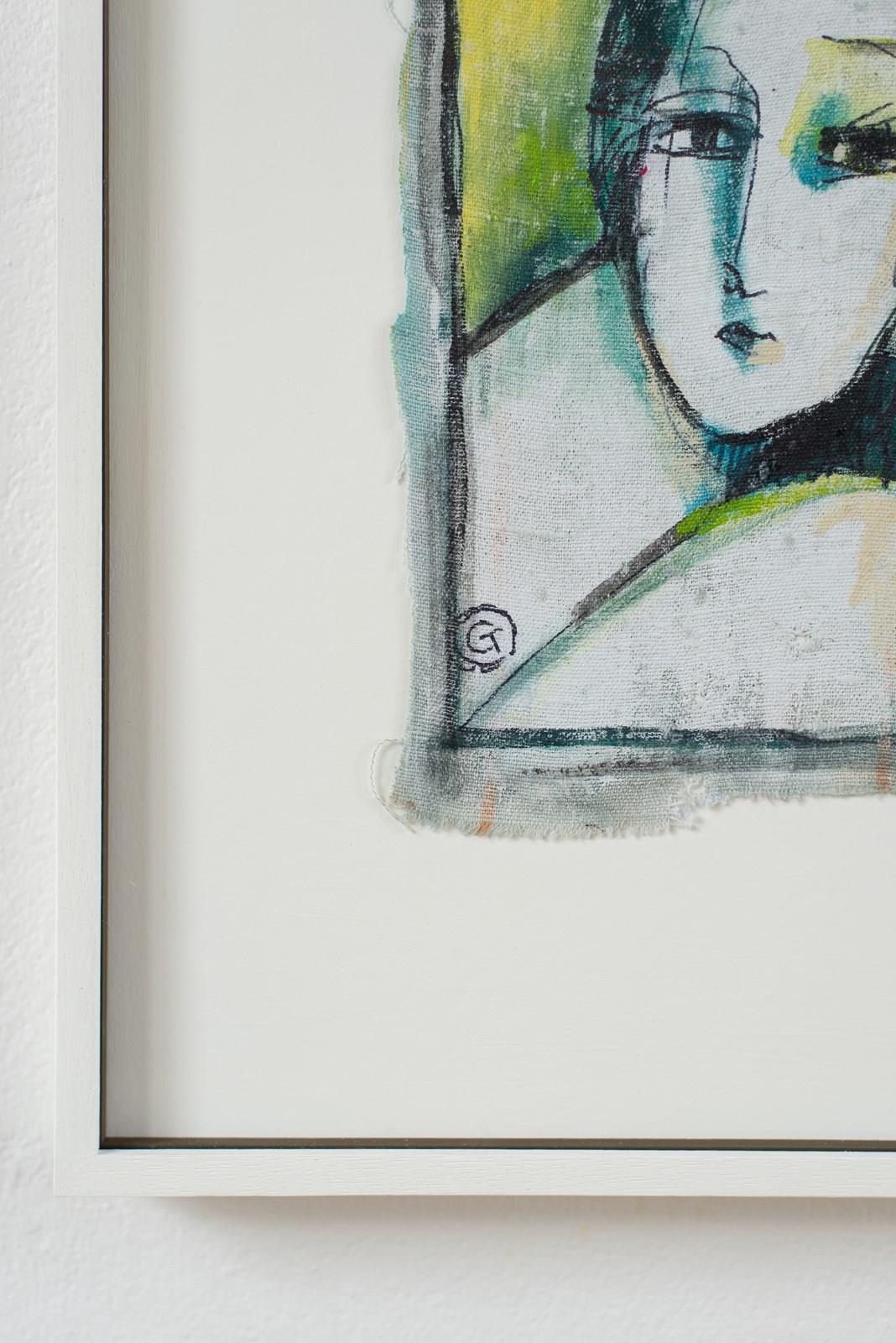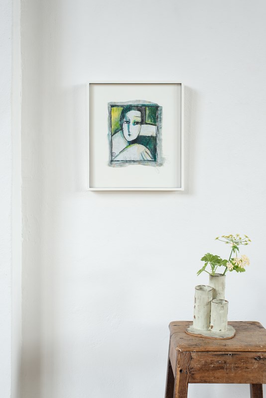A Florentine abstract portrait in acrylic on canvas, signed by the artist, C1980.  The artist uses bold colour in tones of green and a few confident brushstrokes to define the sitter.  The artwork is presented in a hand-painted frame with contrast-painted fillet and gallery-grade glass.