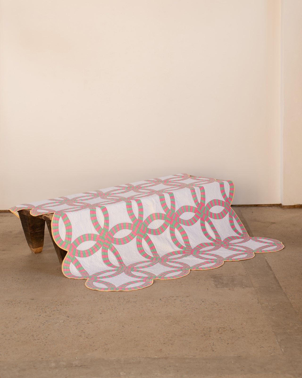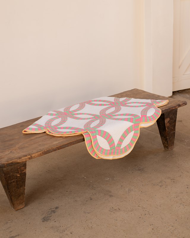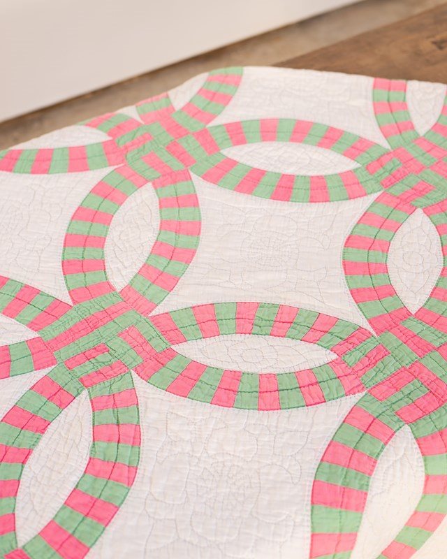 This American patchwork quilt is in beautiful condition. The patch design is called “Double striped Wedding rings. It is made up of a bright white cotton backing and Green and Pink striped rings. The edging has been done in a soft yellow and is also handstitched. The back is a solid white cotton and it has cotton batting. The “rings” continue to the edge which creates a huge scalloped edge. It is hand stitched at 7 stitches per inch. The colour is vibrant for a quilt of this age