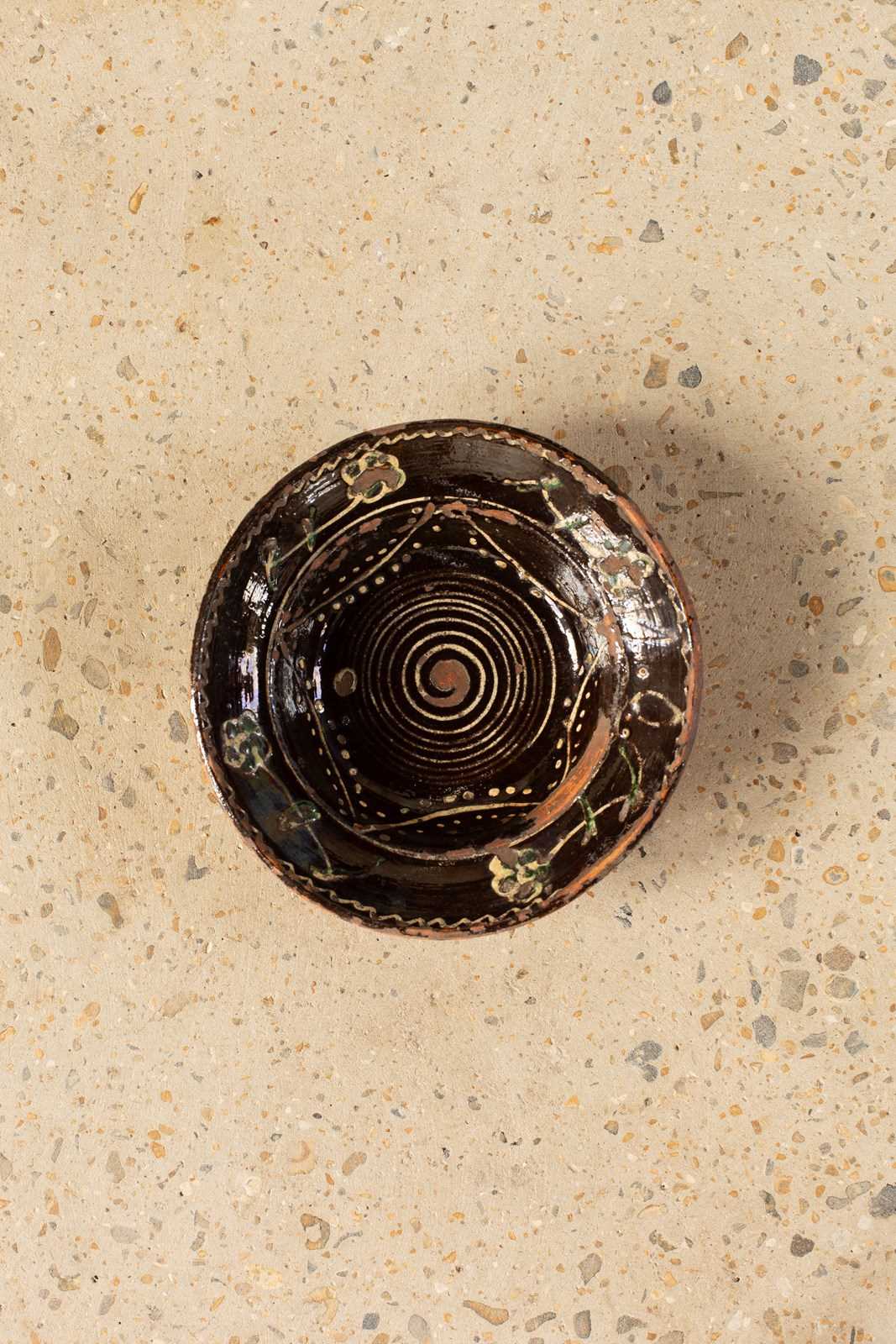 Handmade folk art pottery bowls, glazed with simplistic decorative patterns of flowers, lines and letters, in cream and green on a rich, chocolate glazed base.  Dated from the early 20th century, they have individual character with some wear to the glaze, but without any cracks or chips to the body of each piece.