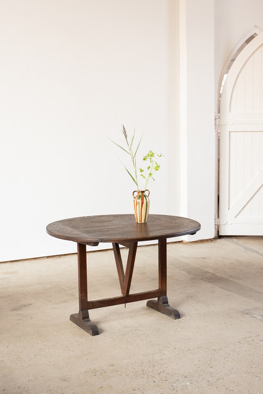 A stained pine antique French vendage table.  Traditionally used during the wine harvest, this piece has come from the Chablis region of France.   It is in good antique condition.