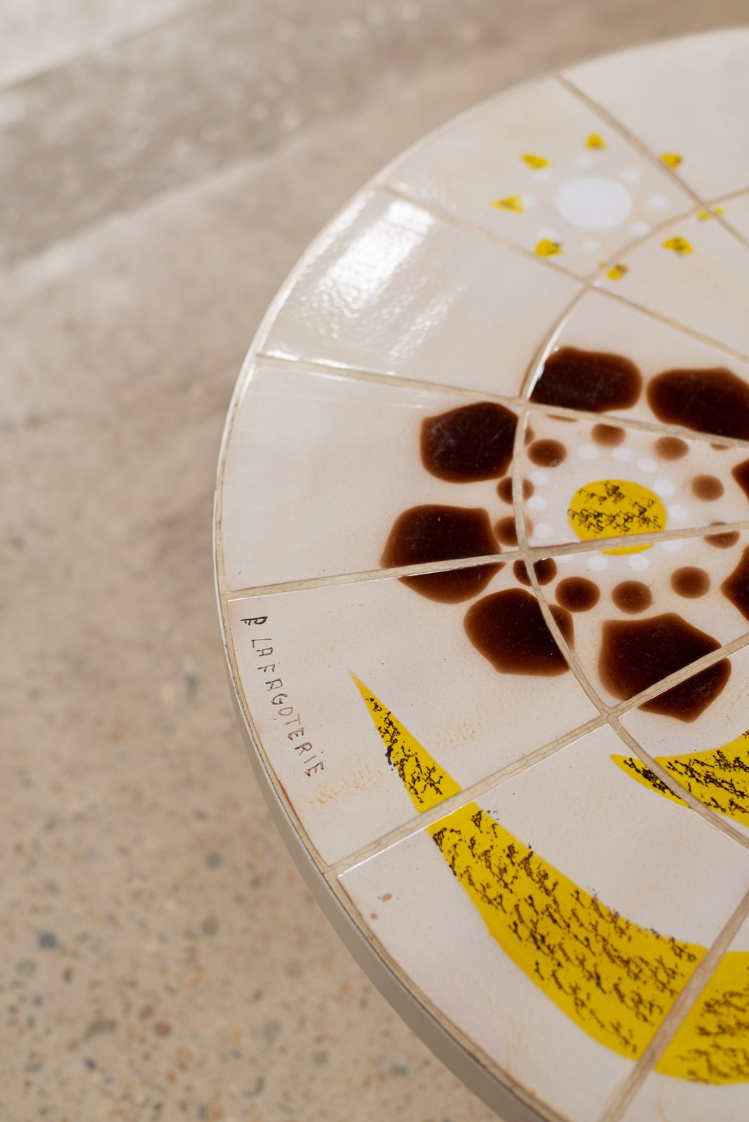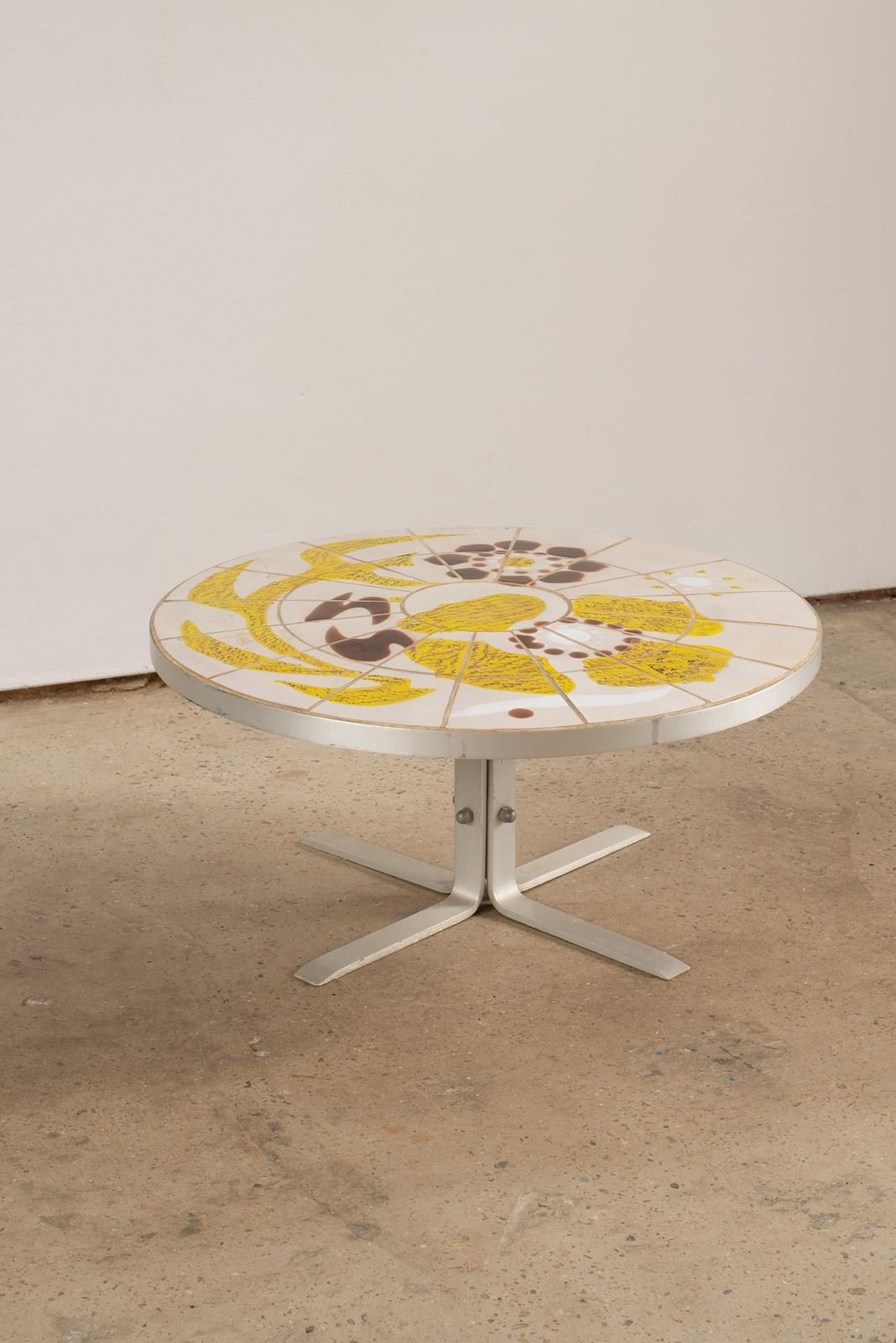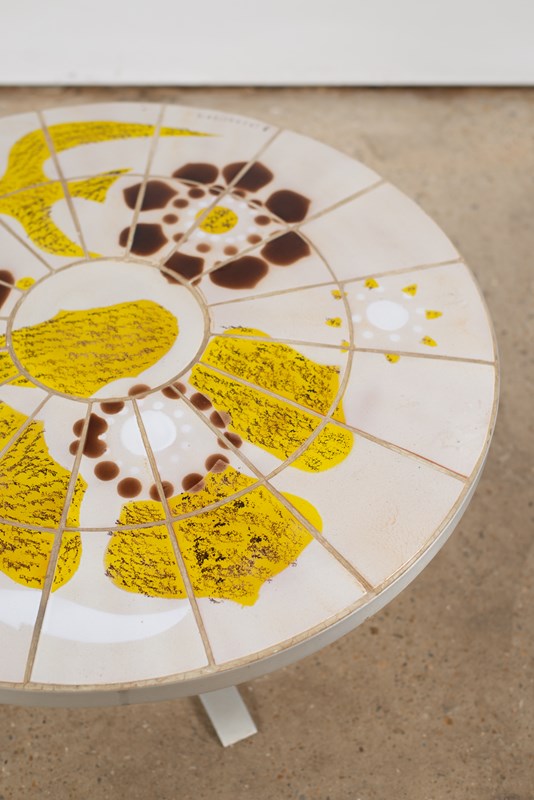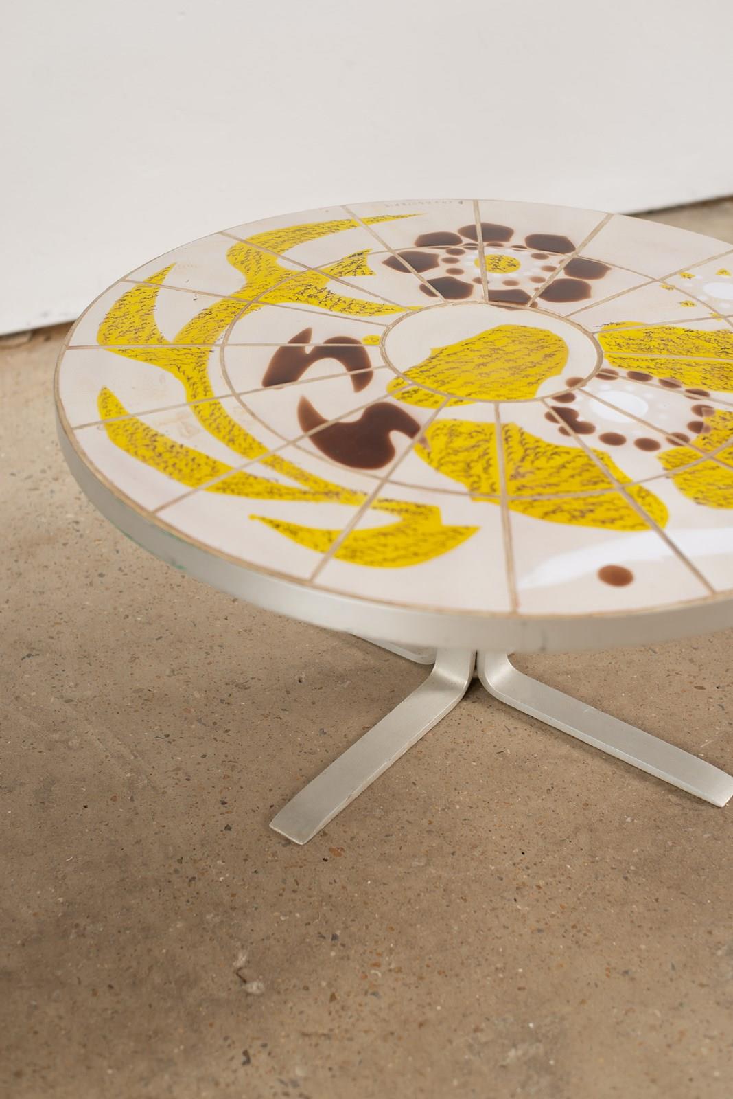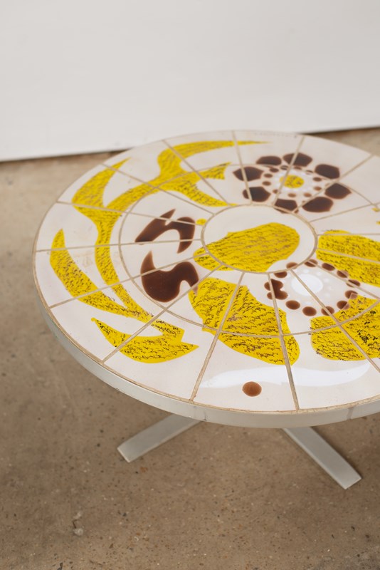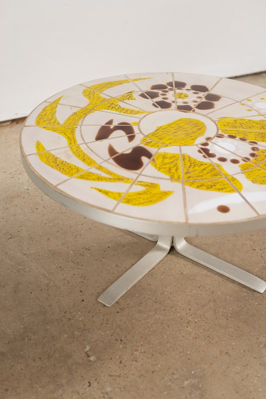 A circular table in brushed steel, with an artist-painted tiled top, C1970.  From the La Fagoterie studio in the internationally renowned pottery centre of Vallauris, France.  The piece is signed within the work, and is in very good condition.