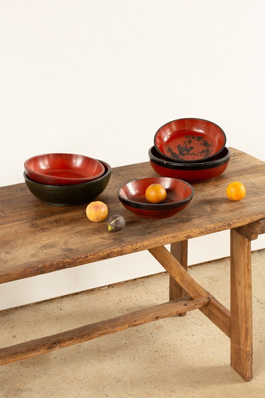We have a collection of Japanese wooden dough bowls, with the traditional urushi laquer finish, C1900. They are available separately, with each piece individual in colour and patina.