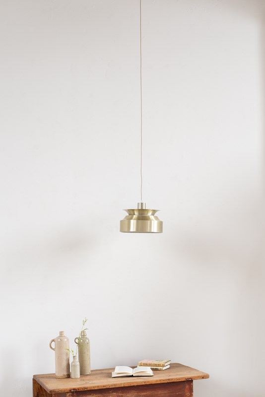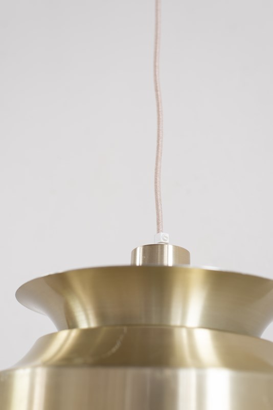 A brushed aluminium ceiling pendant from Denmark, C1960/70.  The colour is a very soft golden-silver tone, which is softened further by the brushed finish.  This piece is in very good vintage condition and has been professionally rewired using a hessian cord.