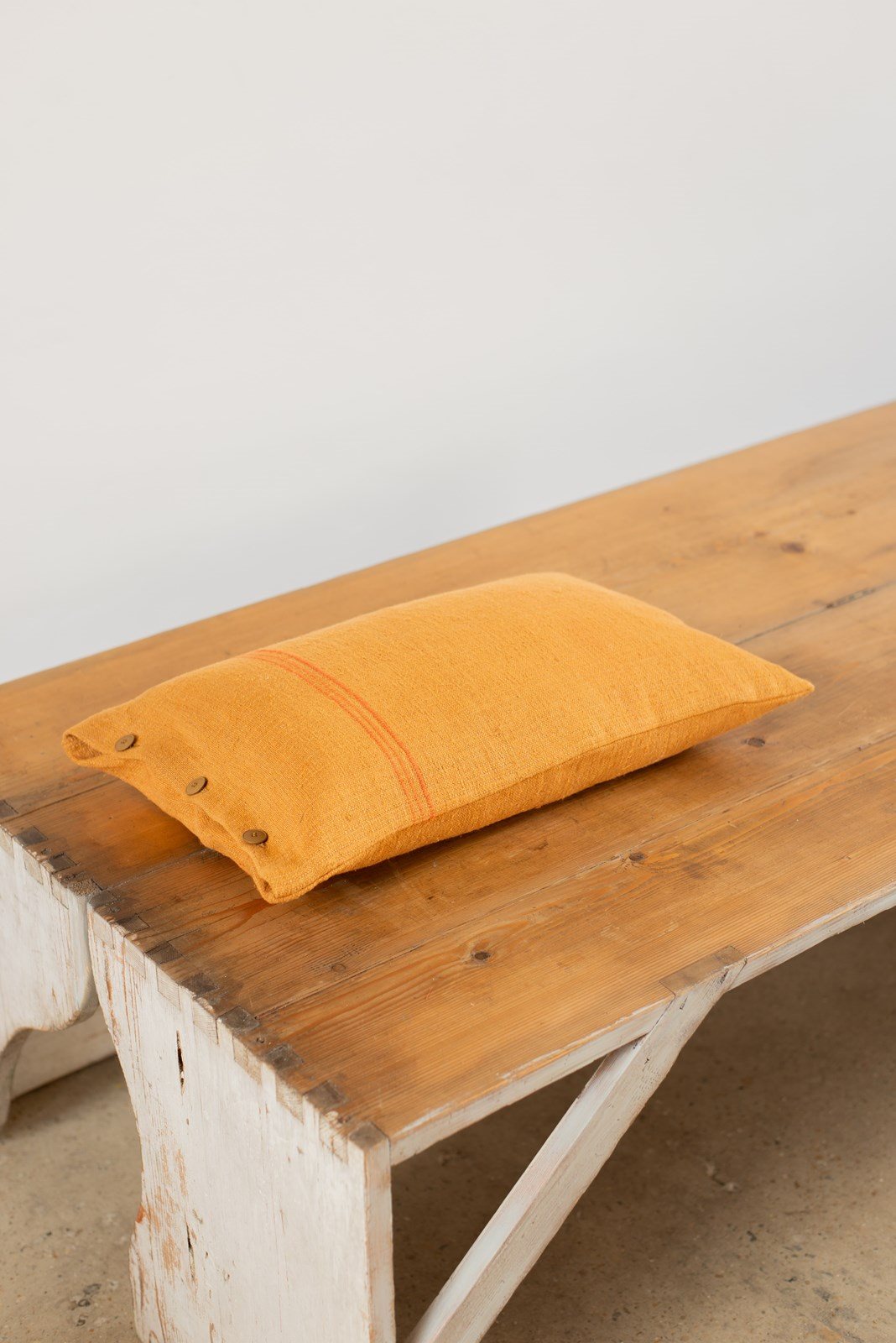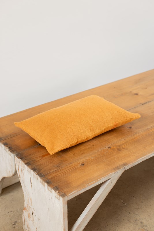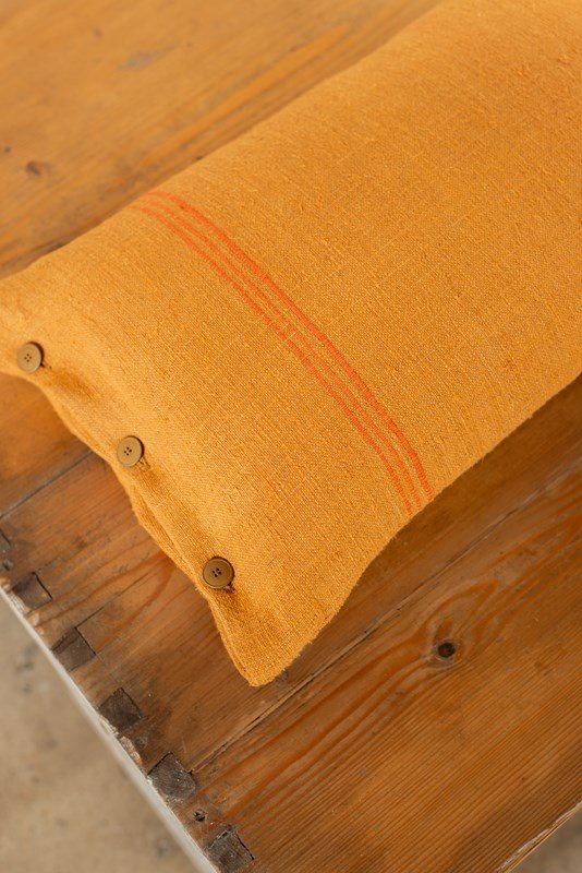 A cushion made using handspun and handwoven antique hemp, which has been dyed a soft ginger.  Filled with a Sussex-sourced feather pad, and finished with hemp buttons from Merchant and Mills.