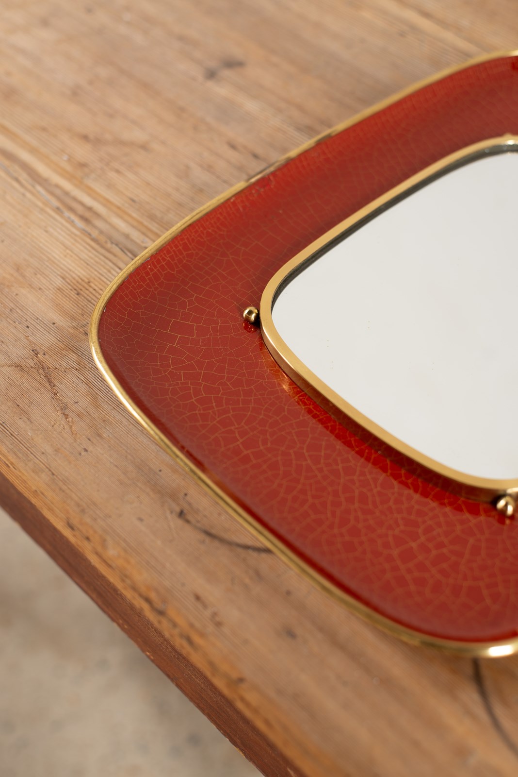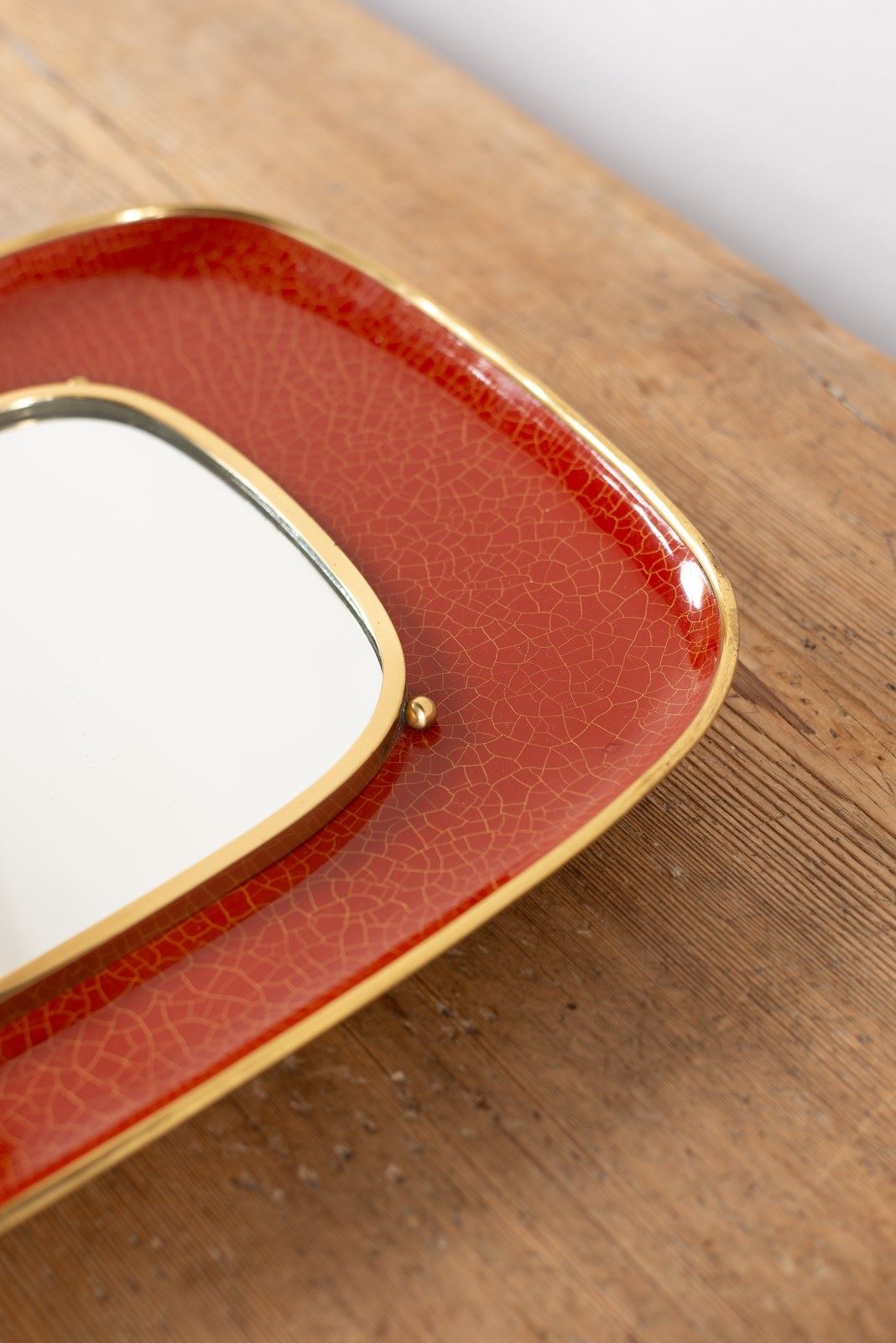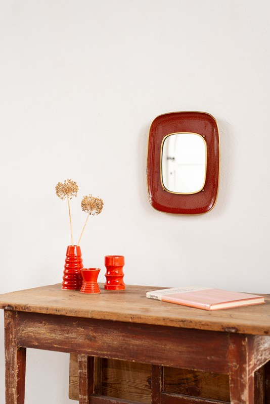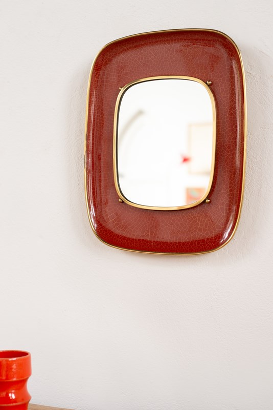 A decorative mirror in brass and orange-red crackle-glazed enamel.   Made in Munich, Germany C1950, and in good vintage condition, with a hanging hook verso, and original notice of care instructions.  A rare to find piece from the middle of the 20th century. Also Signed.