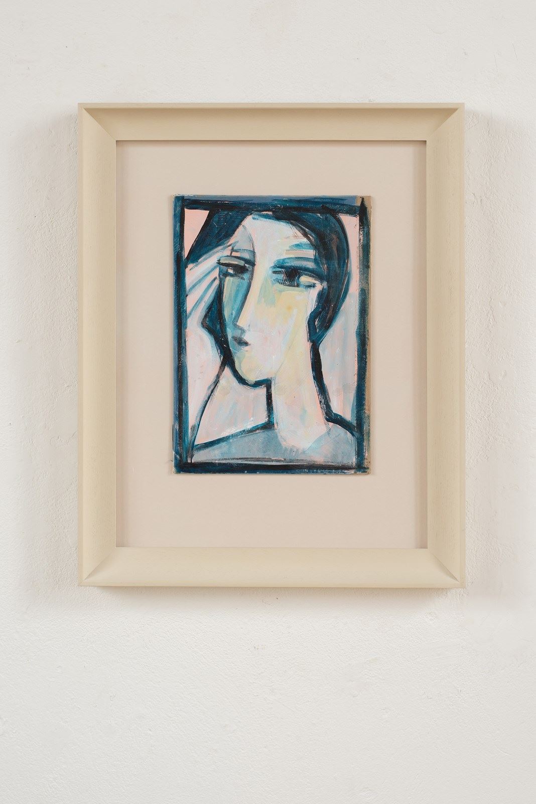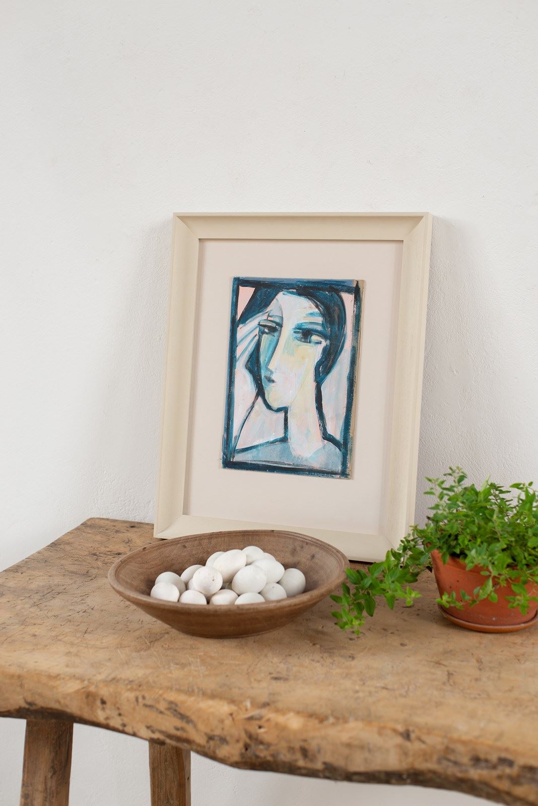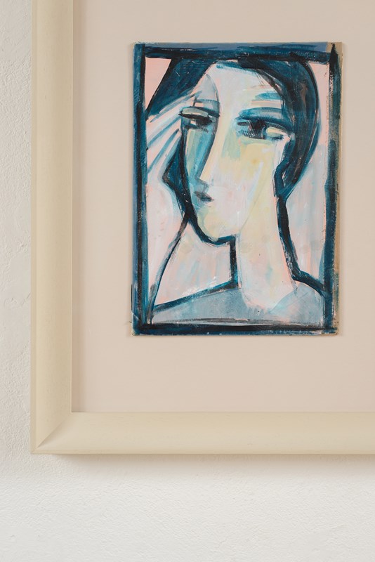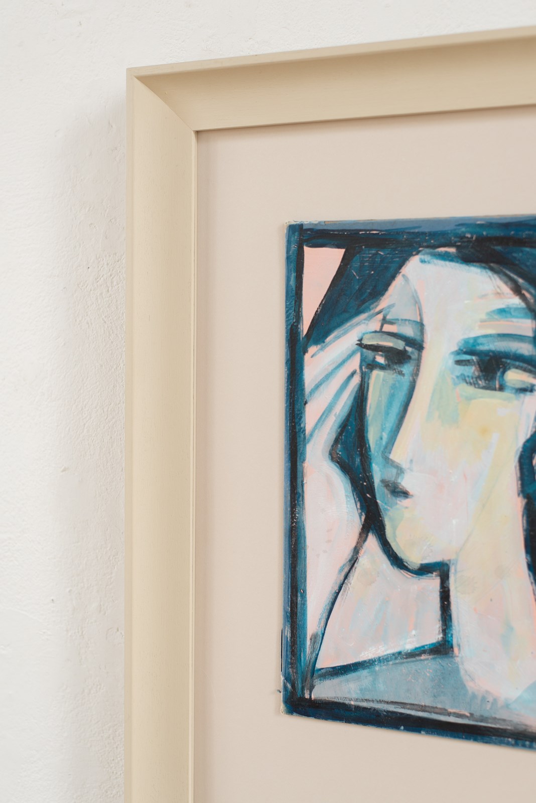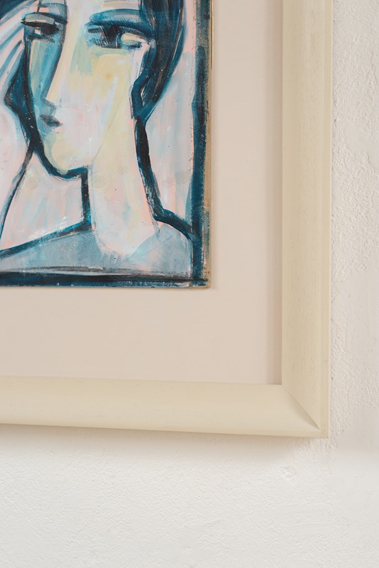 A striking Florentine school portrait in gouache on board, C1980.  Painted in a palette of soft pink and tonal blues, in bold, curved strokes, in an expressionist style.  Presented in a hand-painted wooden frame.