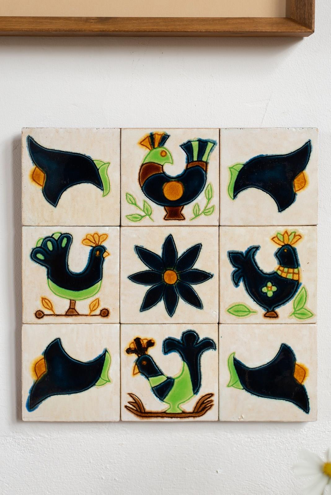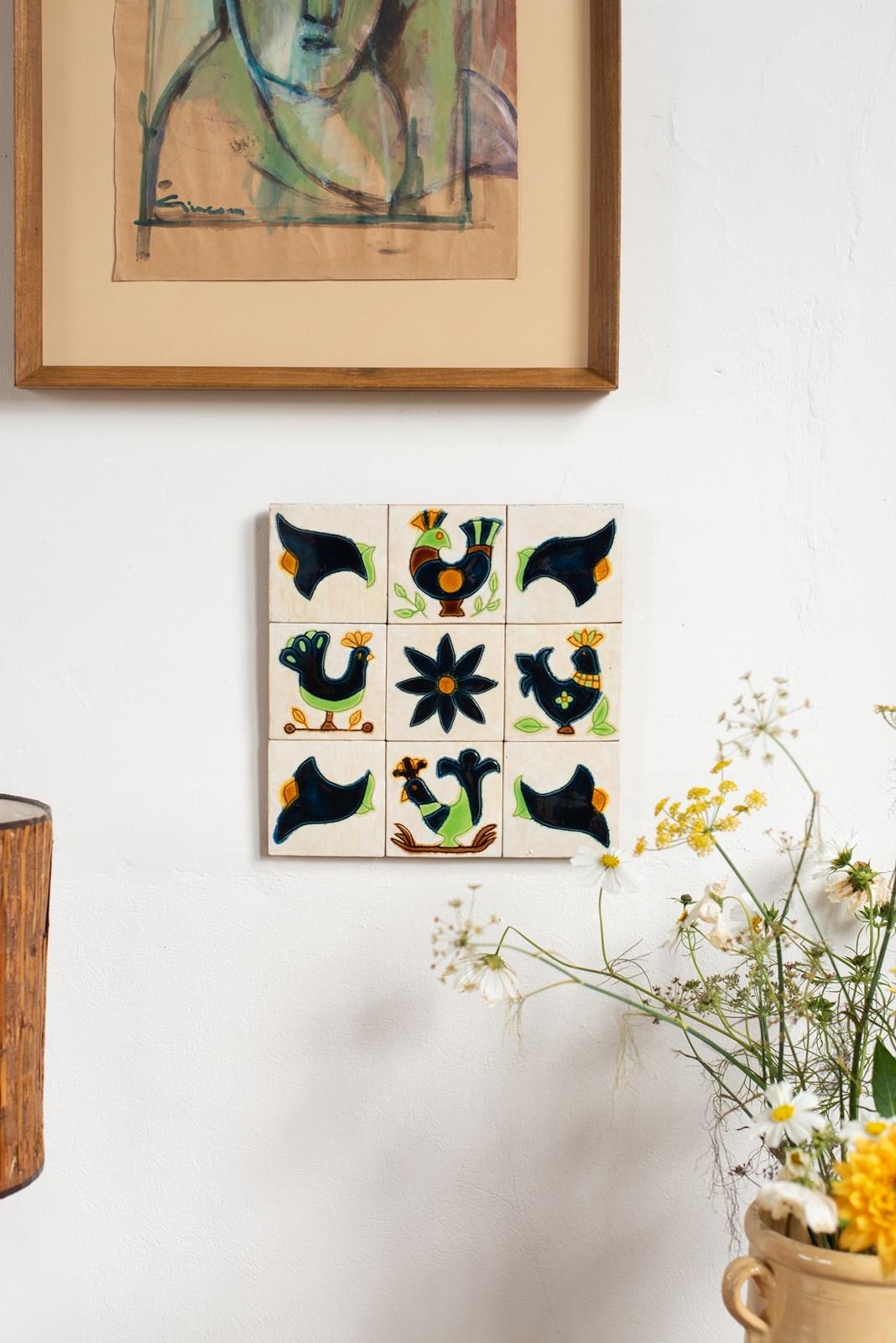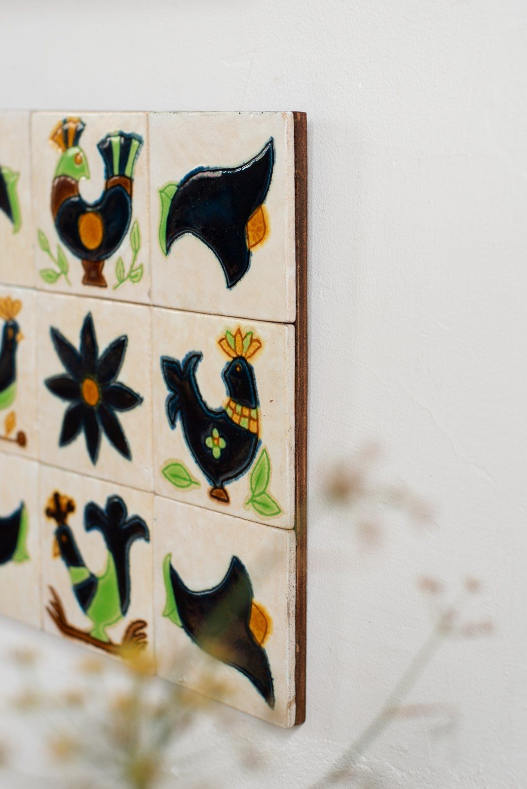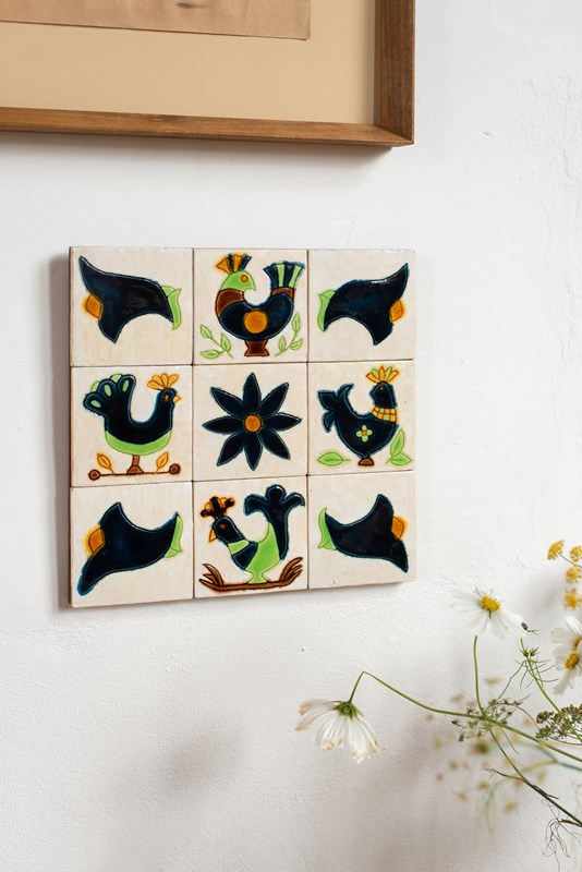 A charming French studio pottery tiled artwork of birds and flowers, C1960.  In a palette of mineral blue, green, golden yellow and chestnut set on an off-white base.  In very good vintage condition.