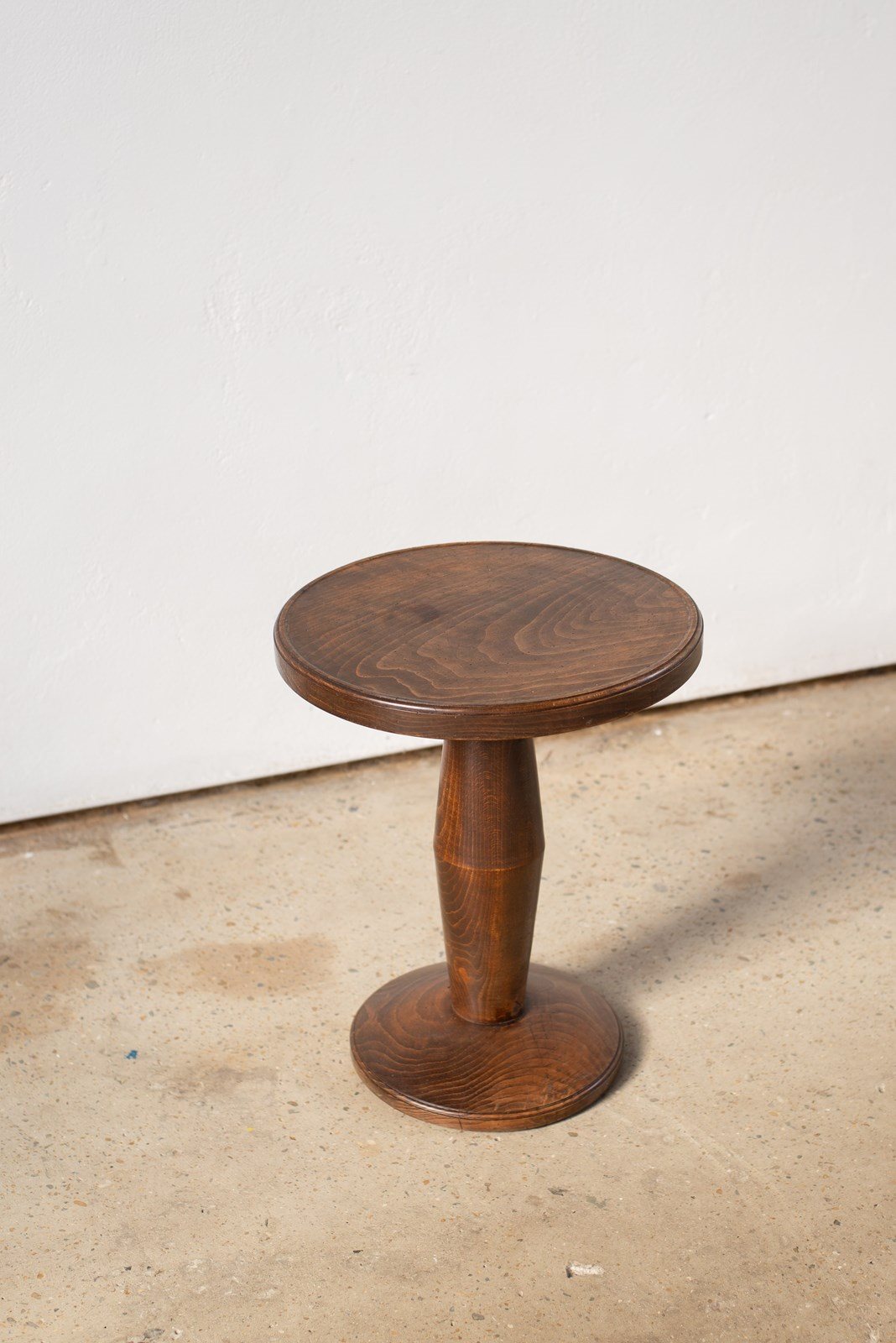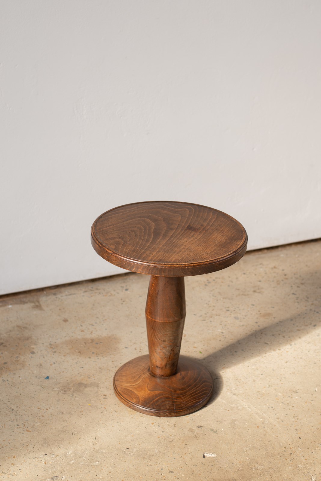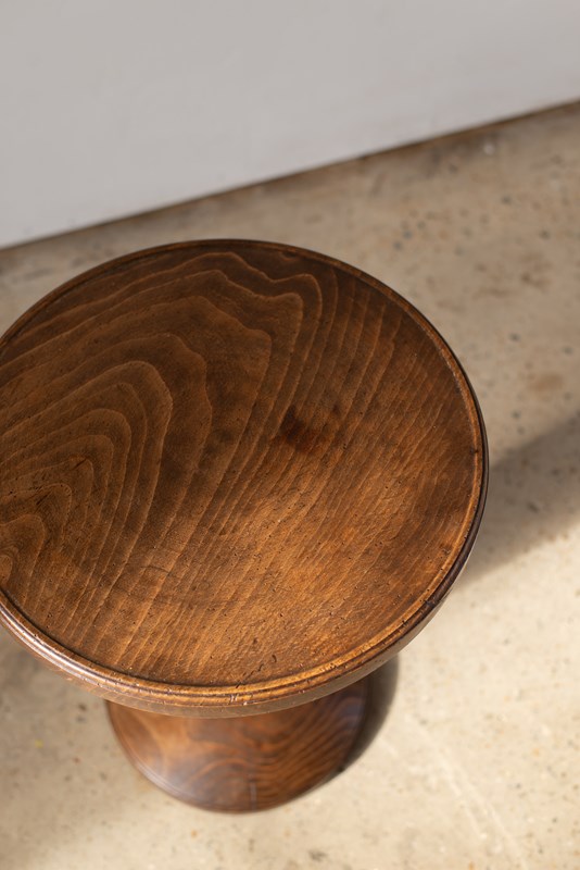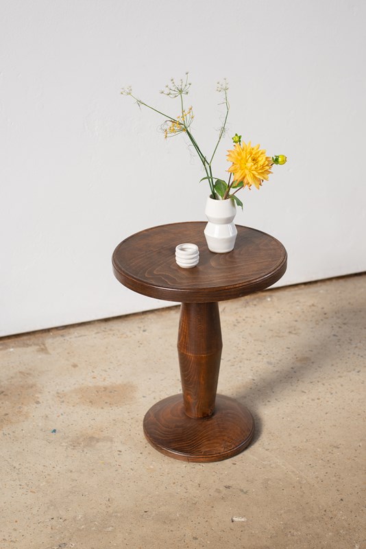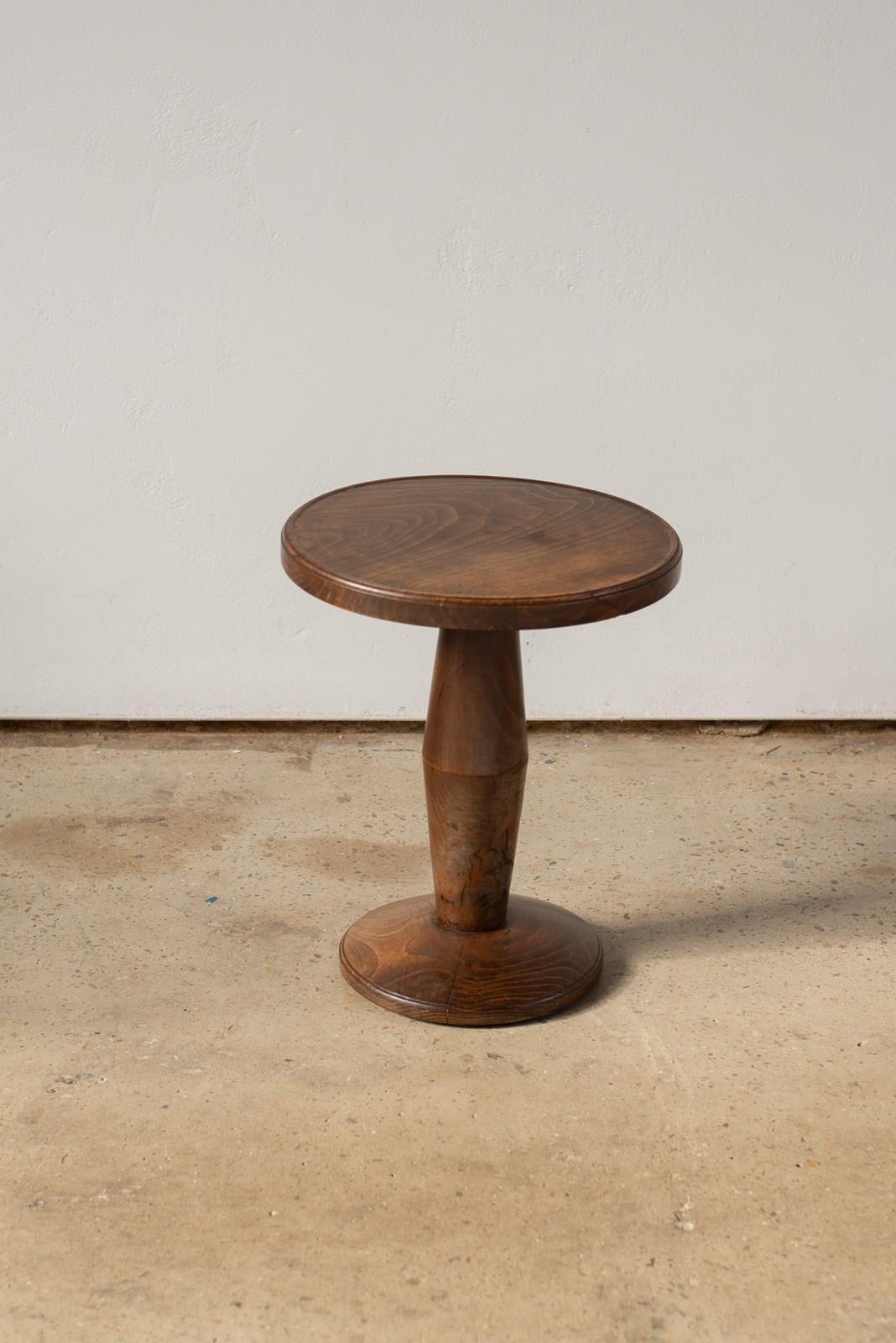 A modernist French turned, solid beech wood side table, C1940.  With a graphic Brancusi-esque shape to the pedestal, and a smooth circular top.  In very good vintage condition, with light age and character to the surface, and some dormant markings.