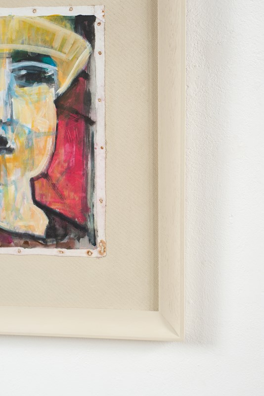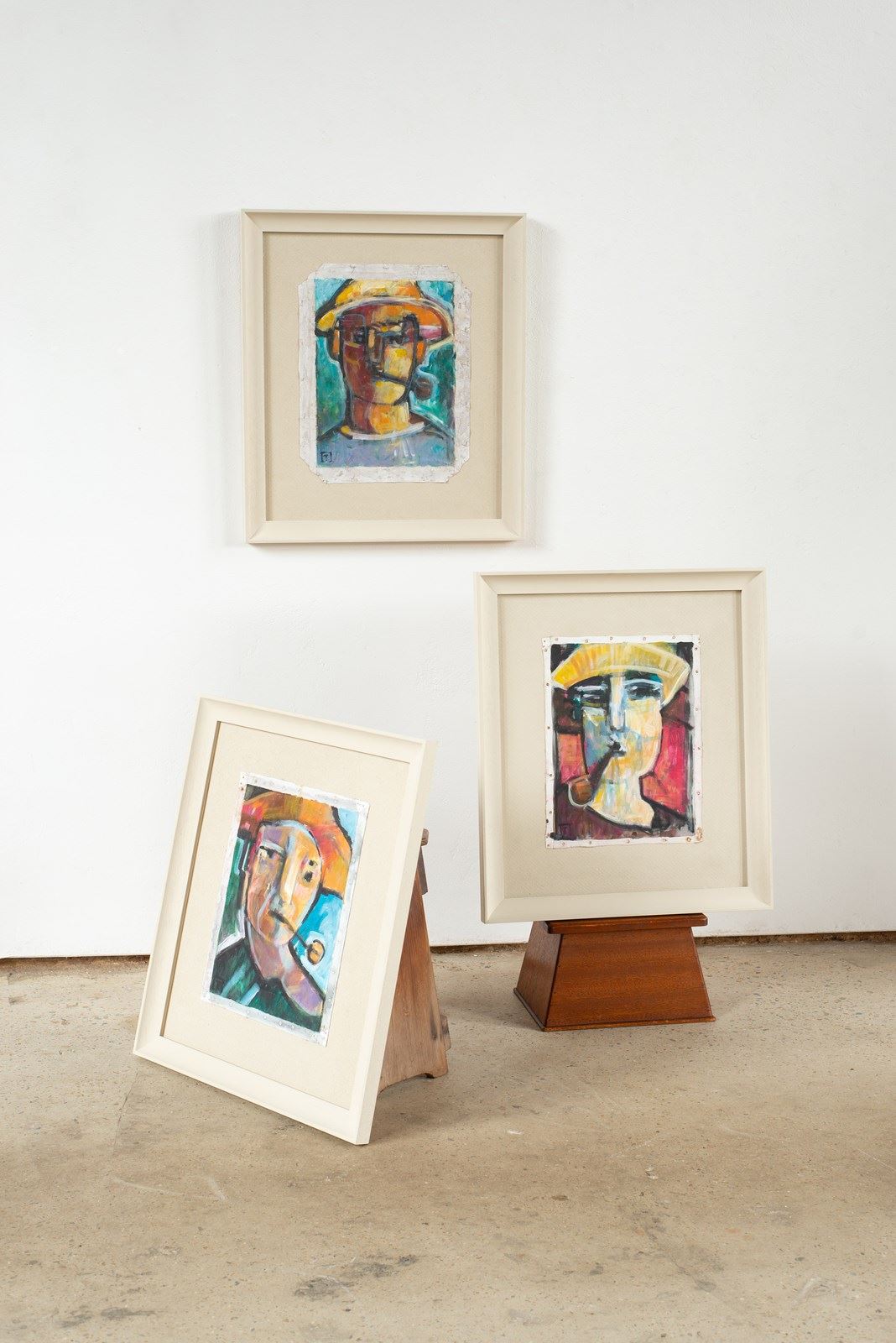 A portrait in acrylic on canvas of a Florentine 'fumatore di pipa', signed C1980.  The artist has used a broad palette of colour, within a simplistic black outline to define these characterful souls. The work is mounted on board and set within a hand-painted wooden frame.