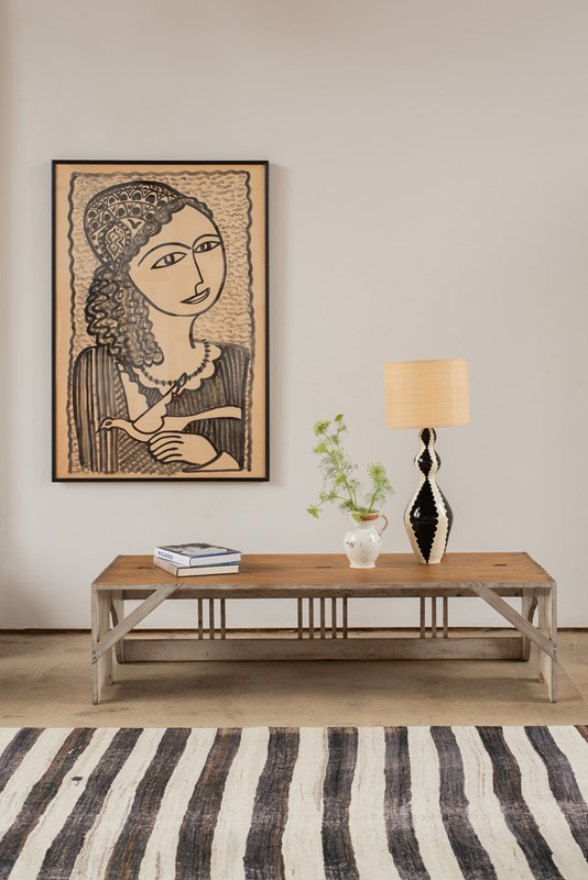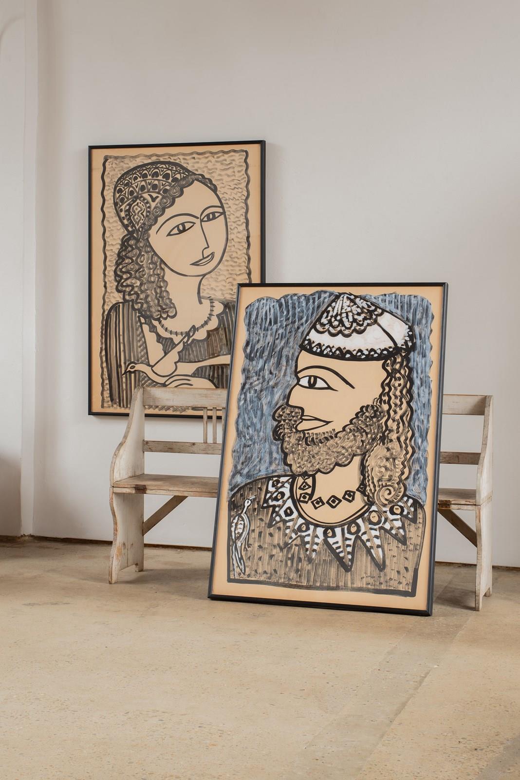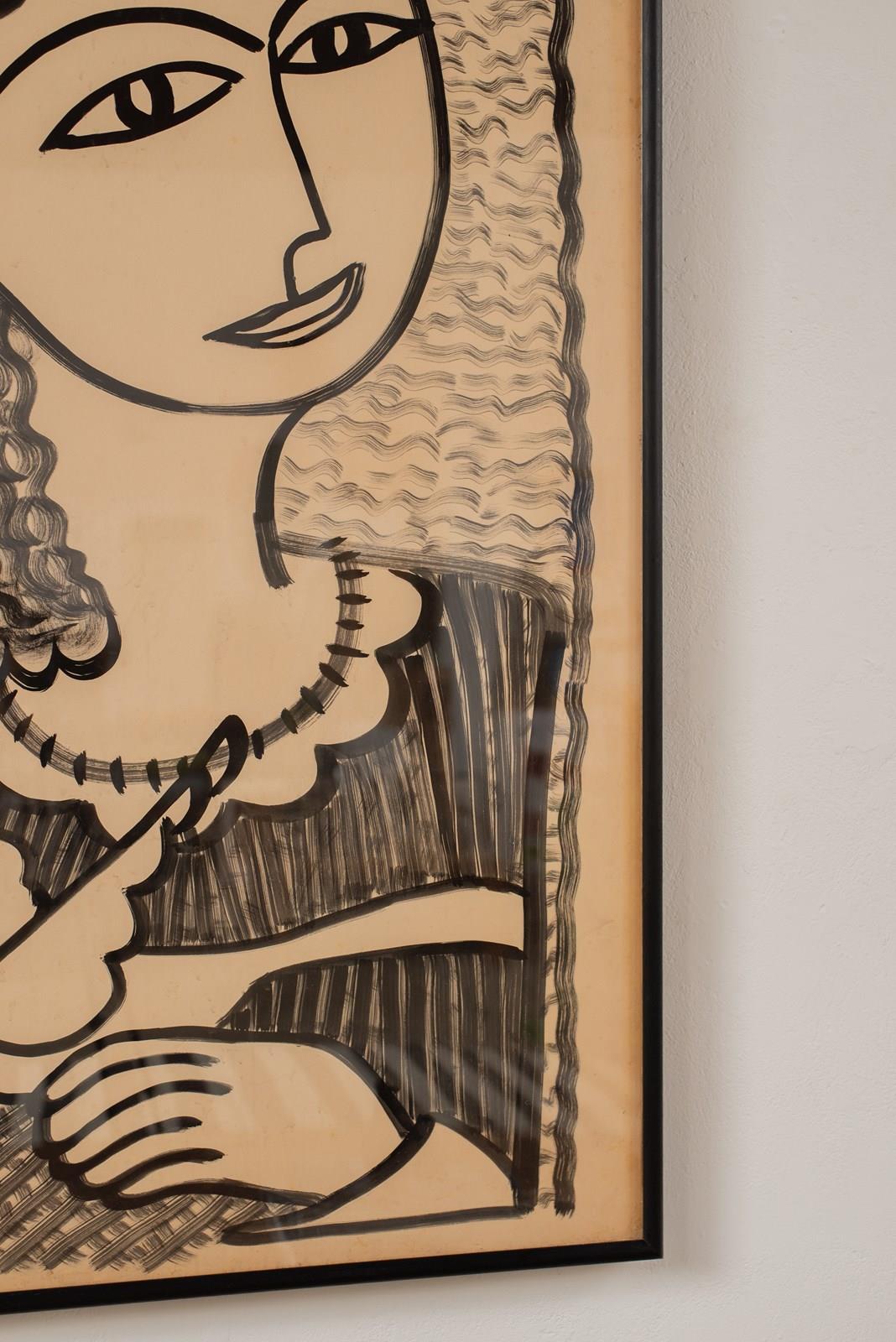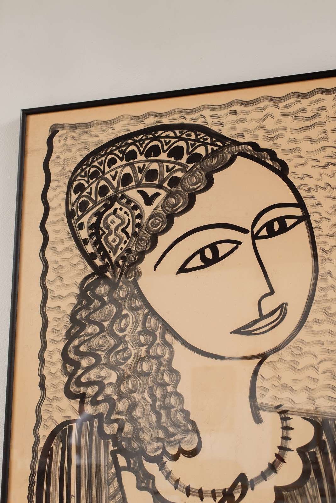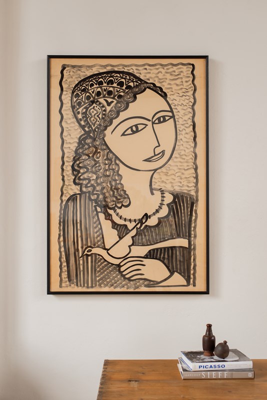 A striking, large-scale original portrait in paint on board of a woman, C1970.   Created with a bold, linear pattern in black on a buff coloured base.  The sitter is depicted holding a dove, wearing a distinctive style of highly decorative clothing.  Presented in a hand-painted wooden frame, glazed with high-grade perspex.