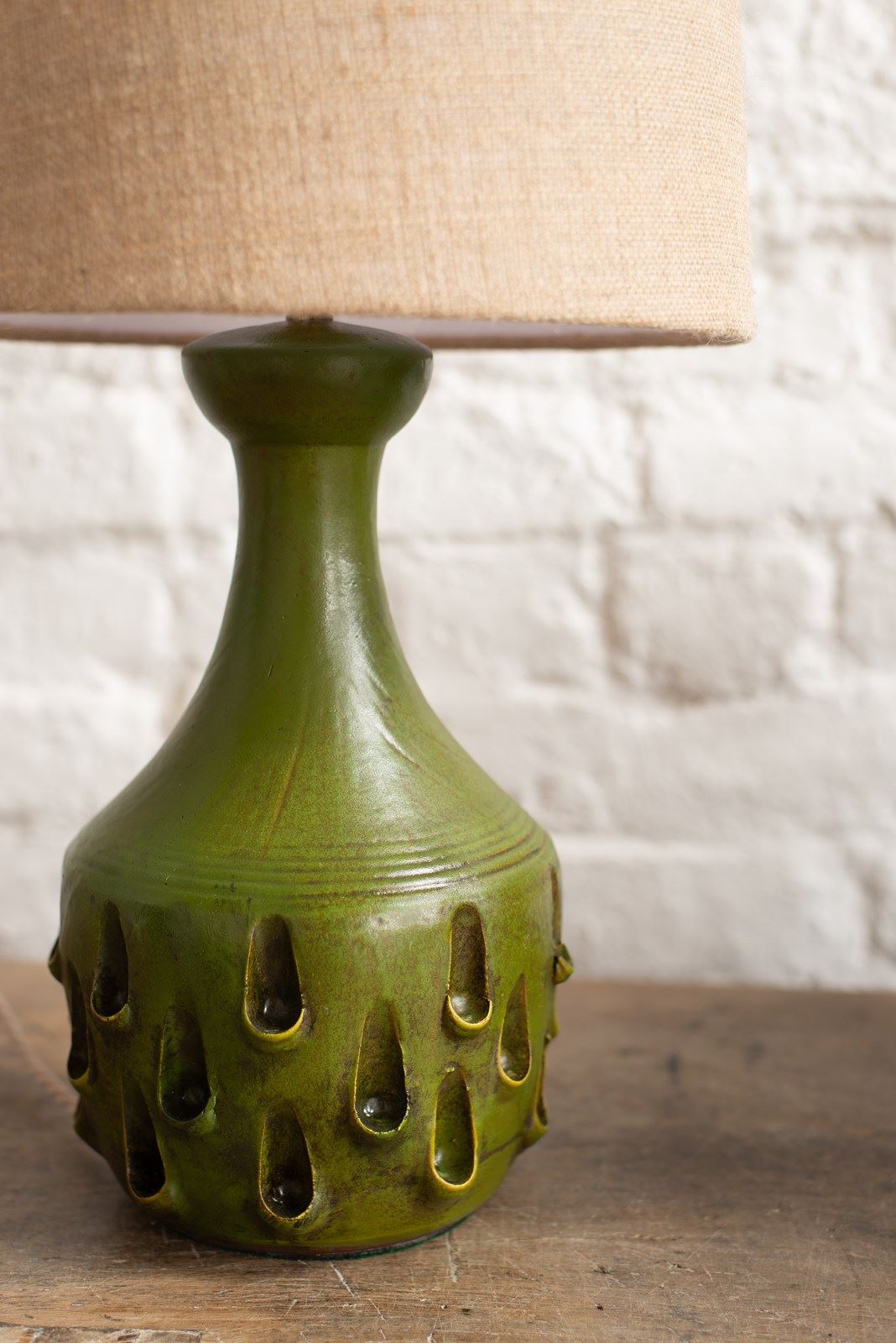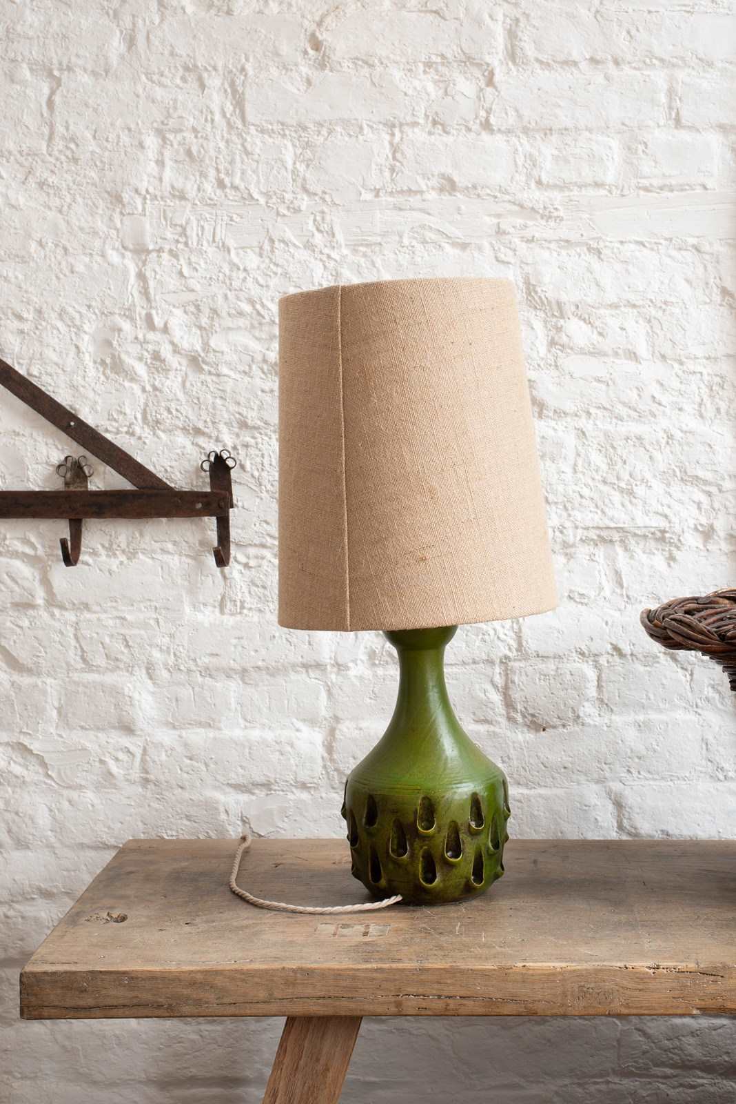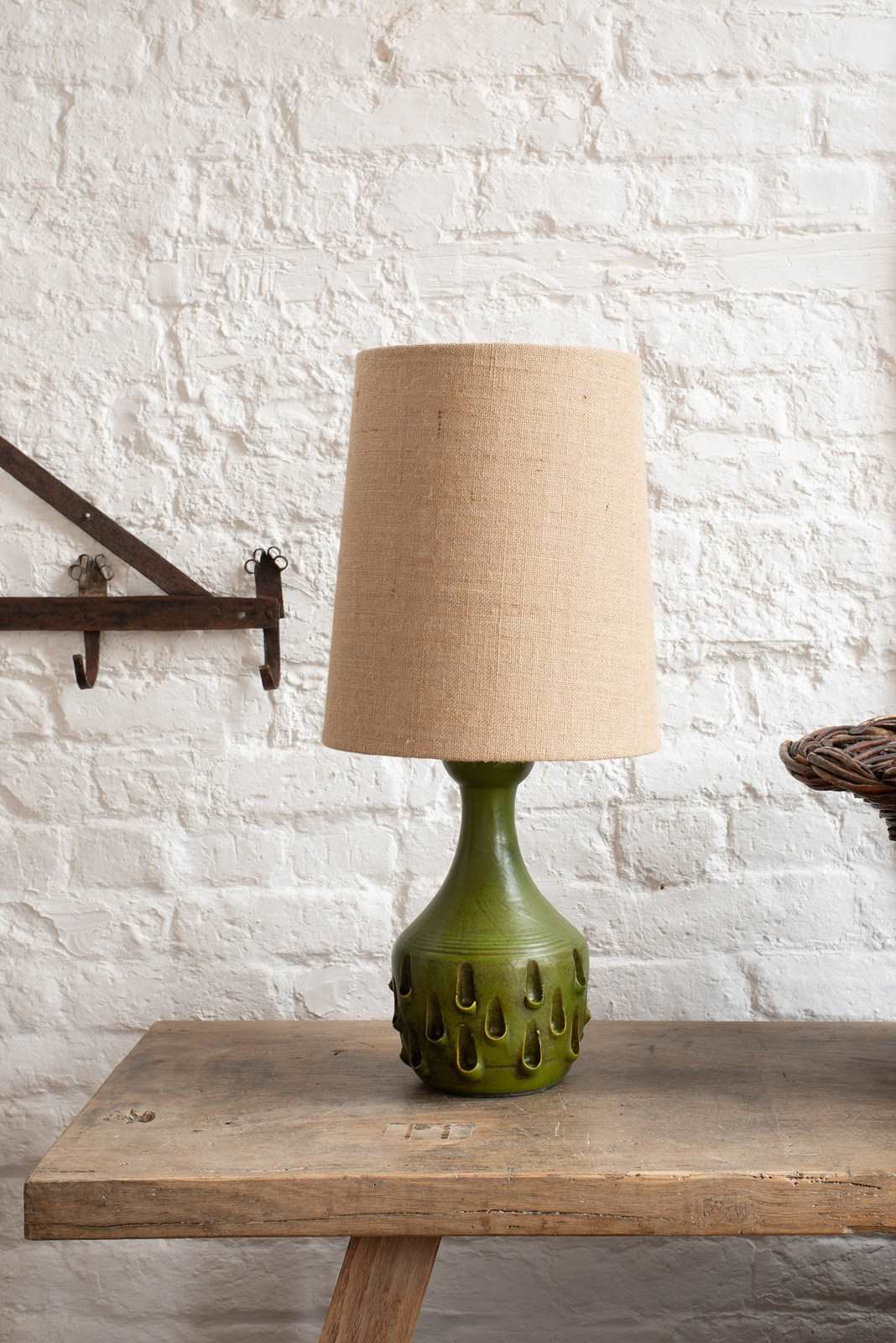 A 1960s green glazed studio pottery lamp base with a rich, textural surface.  Finished with a bespoke natural hessian shade.  In very good vintage condition, and fully rewired and PAT tested.   We have two pieces which complement one another but are not a matching pair.