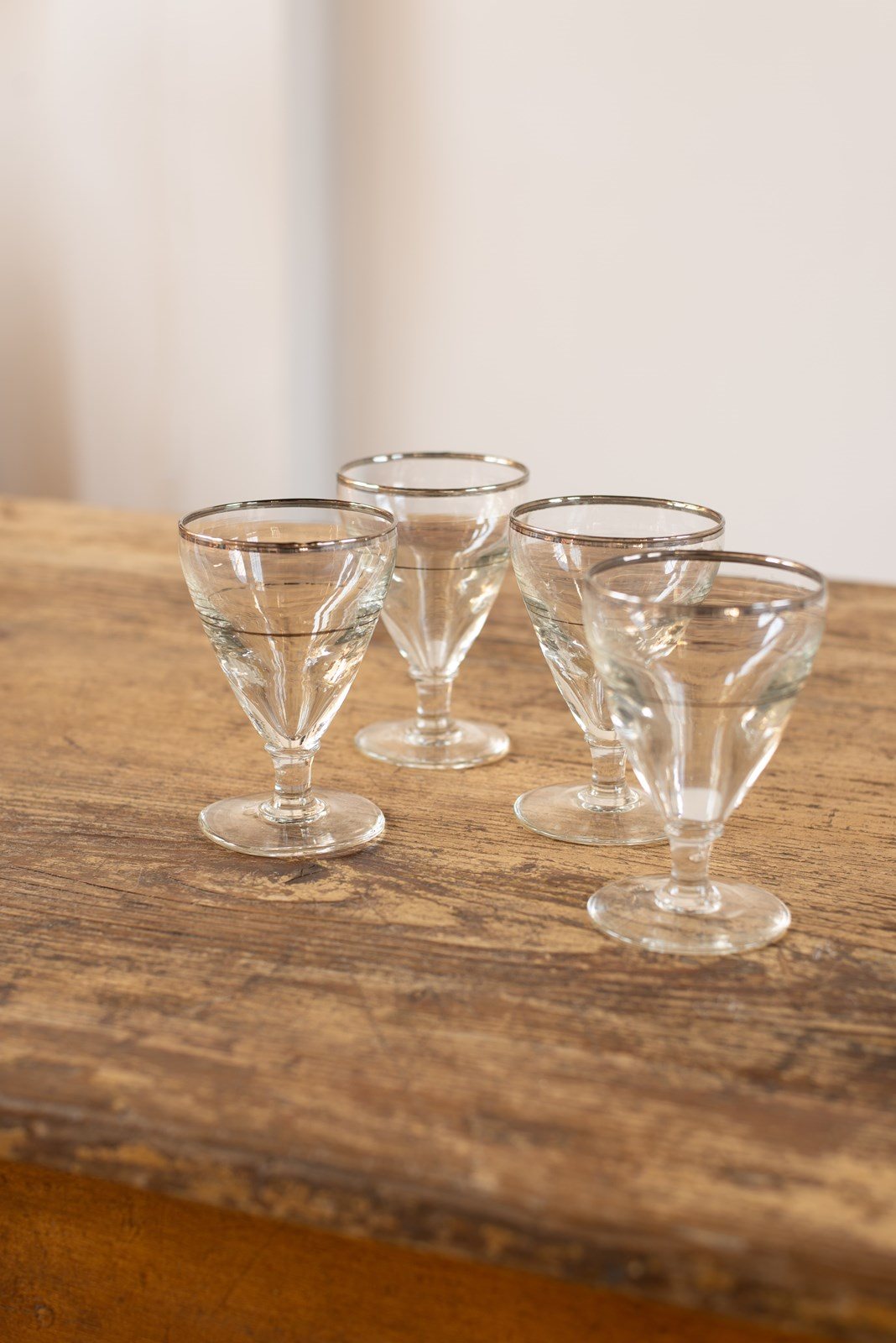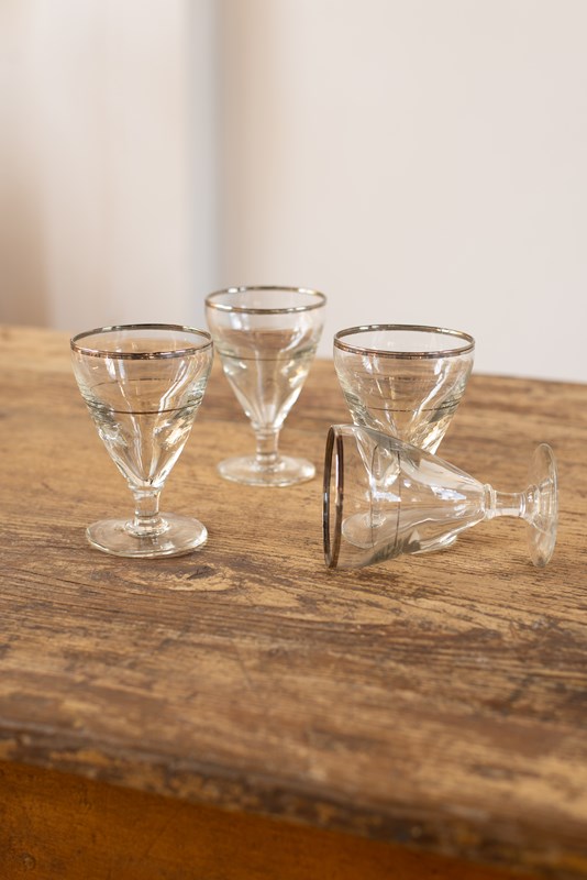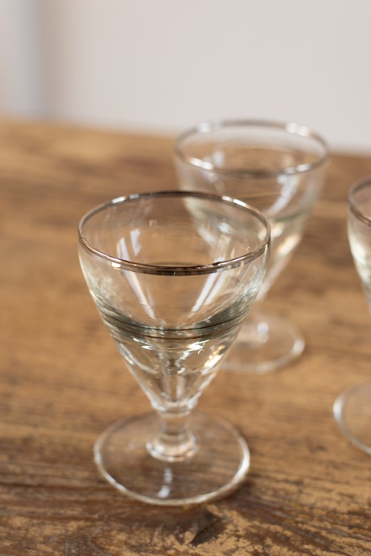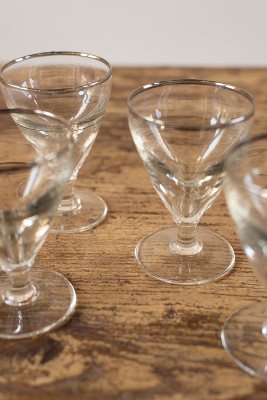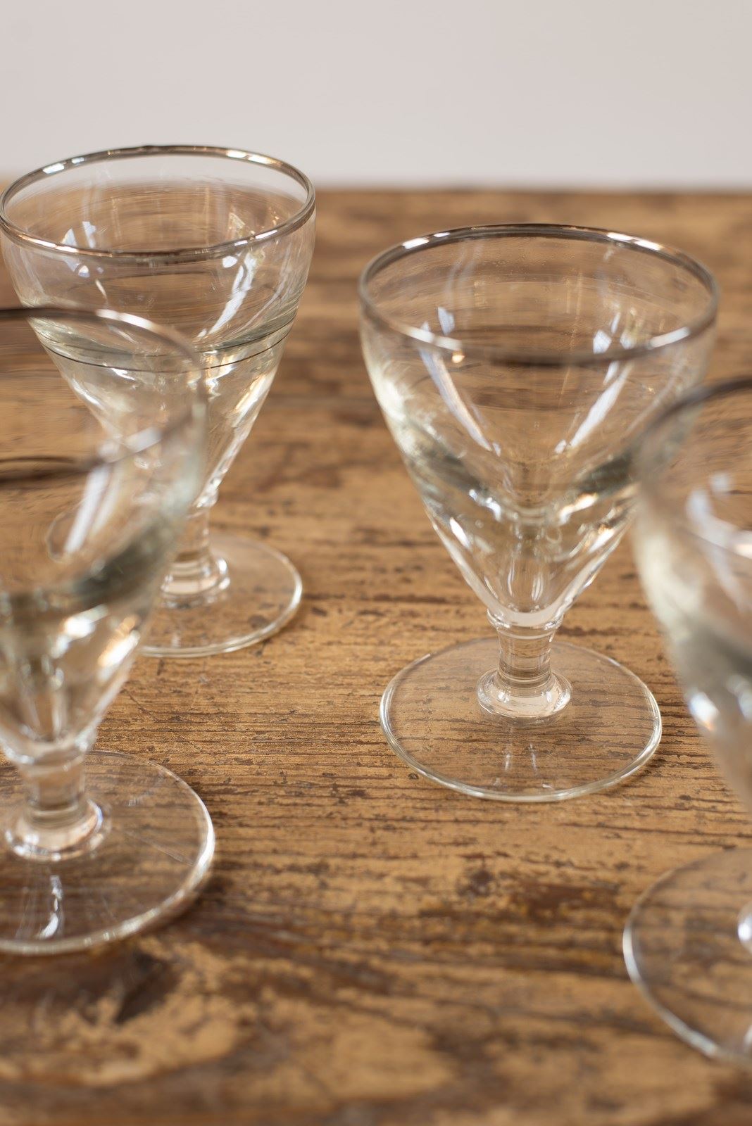 Hand blown French bistro glasses with a silver edge and measure line, C1930.  Originally make for a restaurant or café and found wrapped, having never been used.  Beautifully weighty and very elegant.