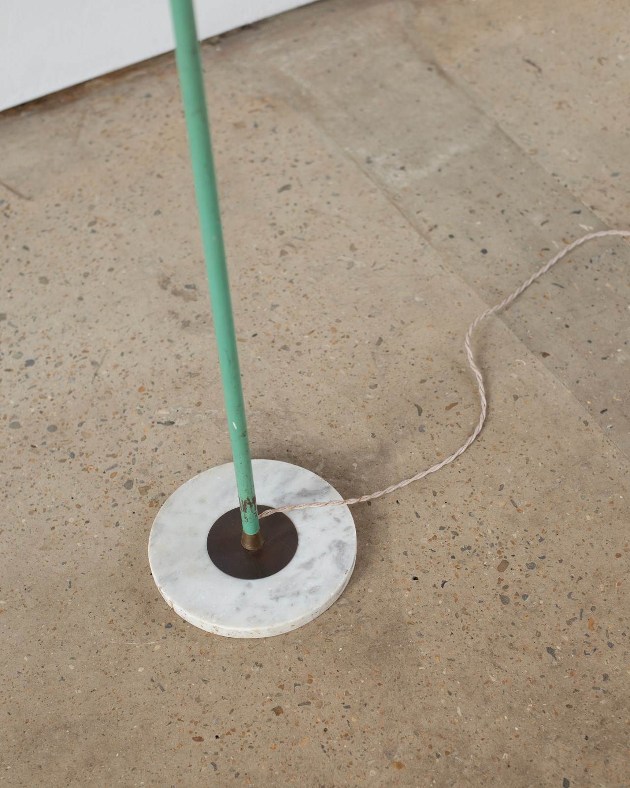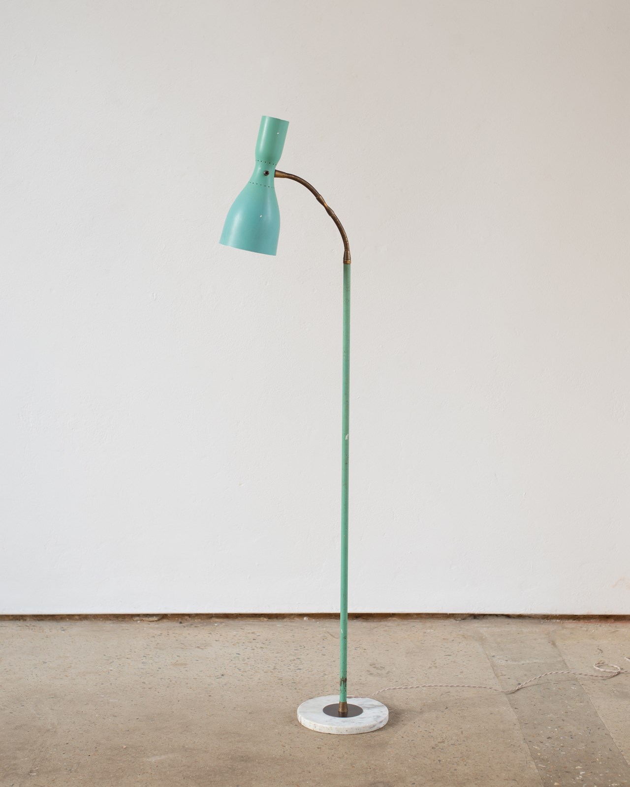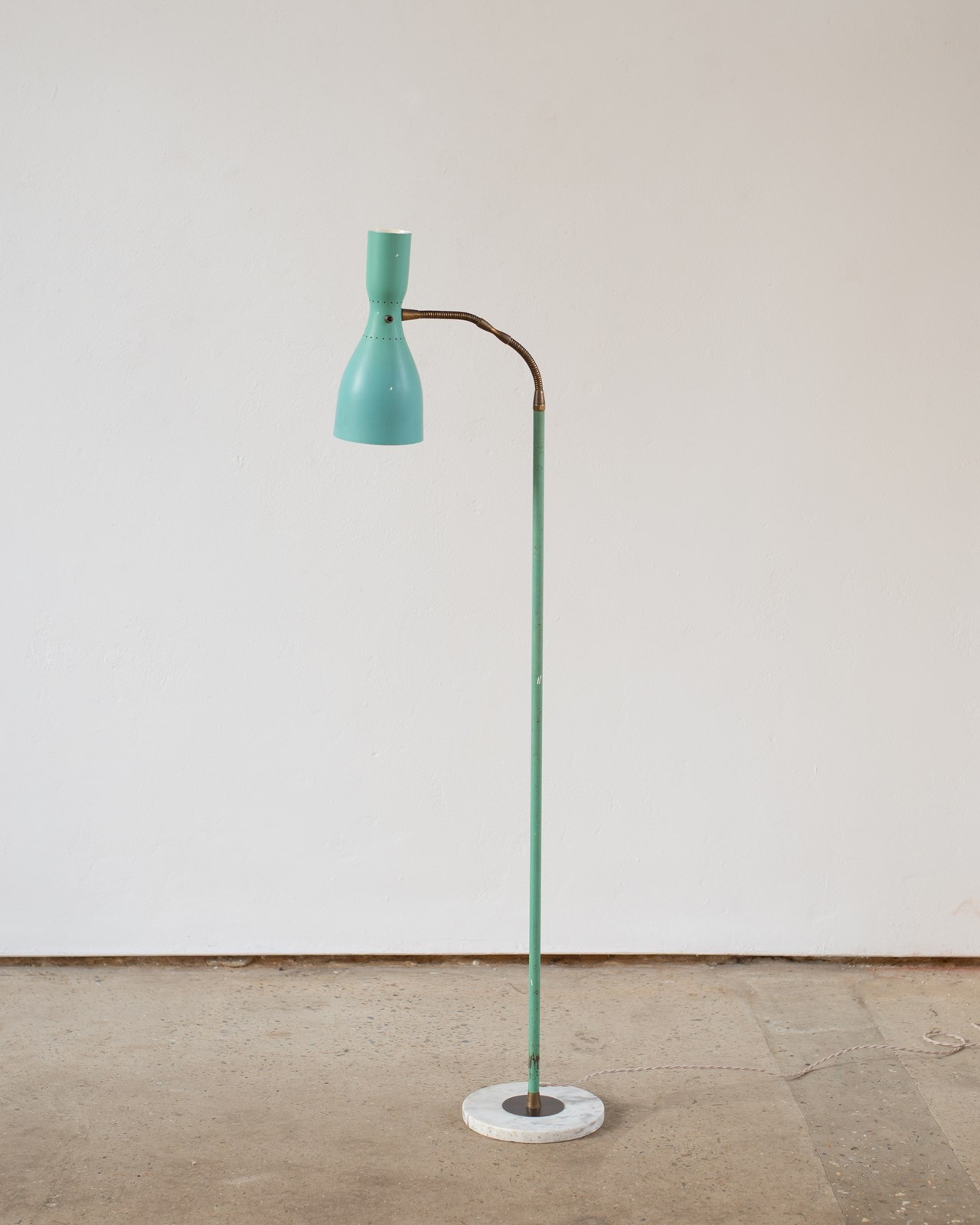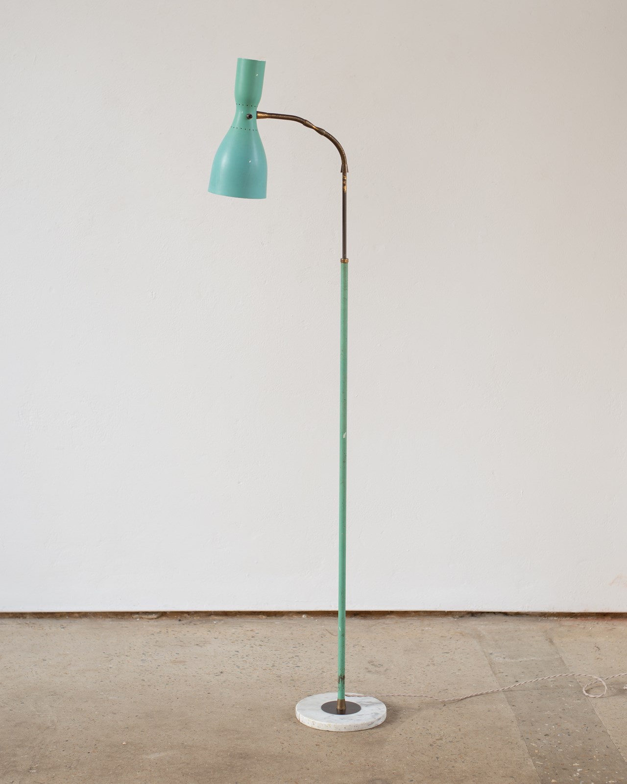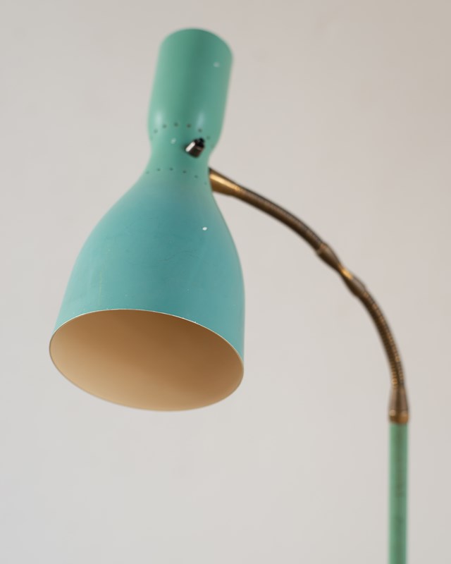 A brass and marble floor lamp, with original blue-green aluminium double-lamp shade, from Italy, C1950.  The double lamp gives both an up and down light, which can be switched on and off separately.  Adjustable along the brass pole, with a beautifully crafted goose-neck.