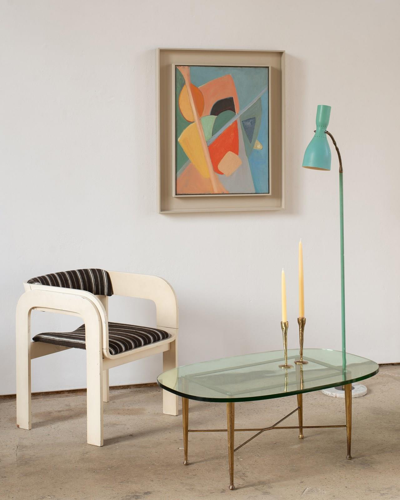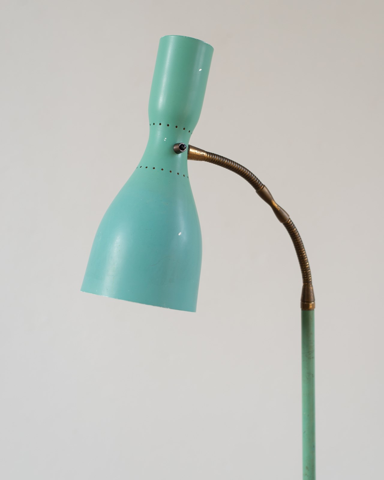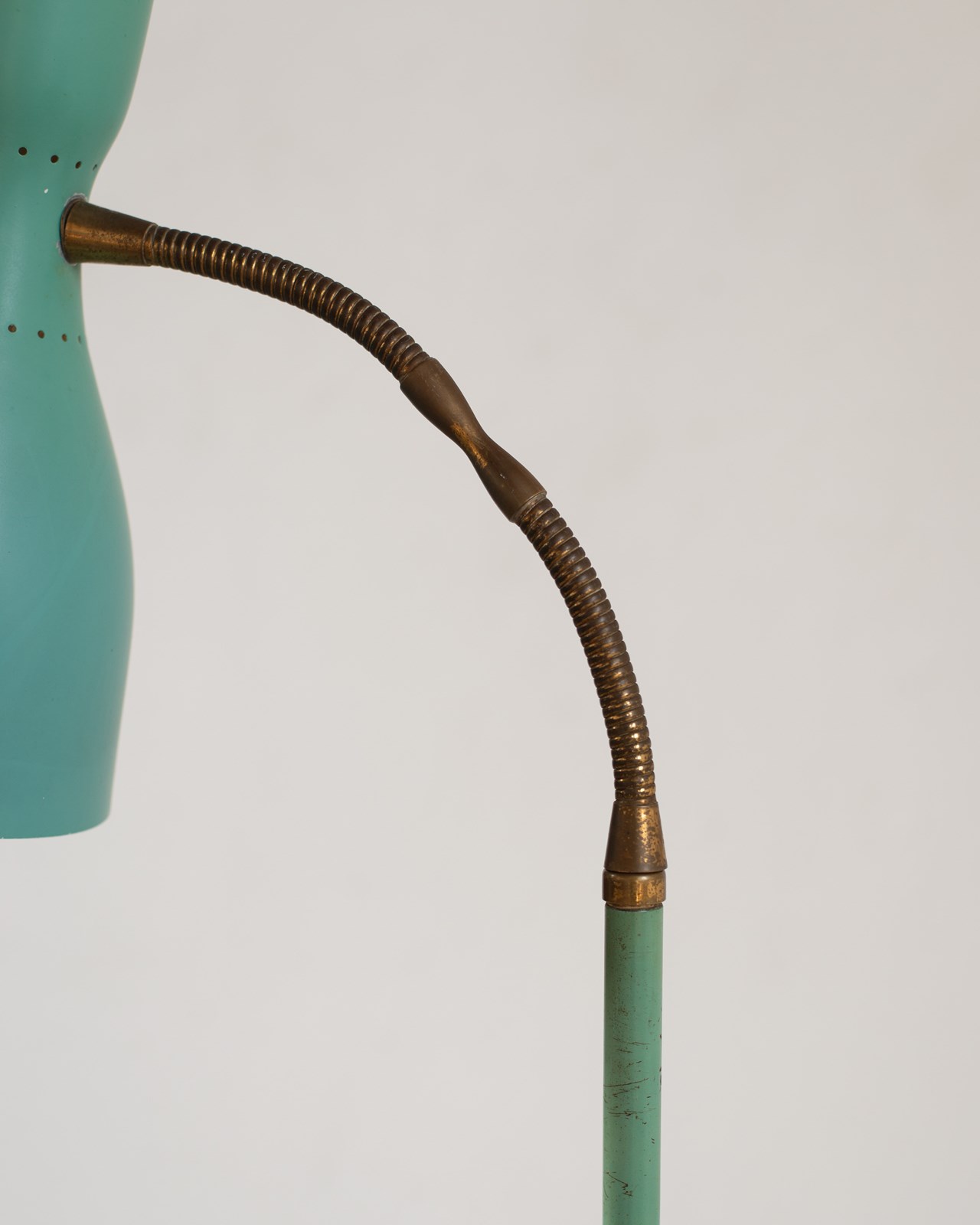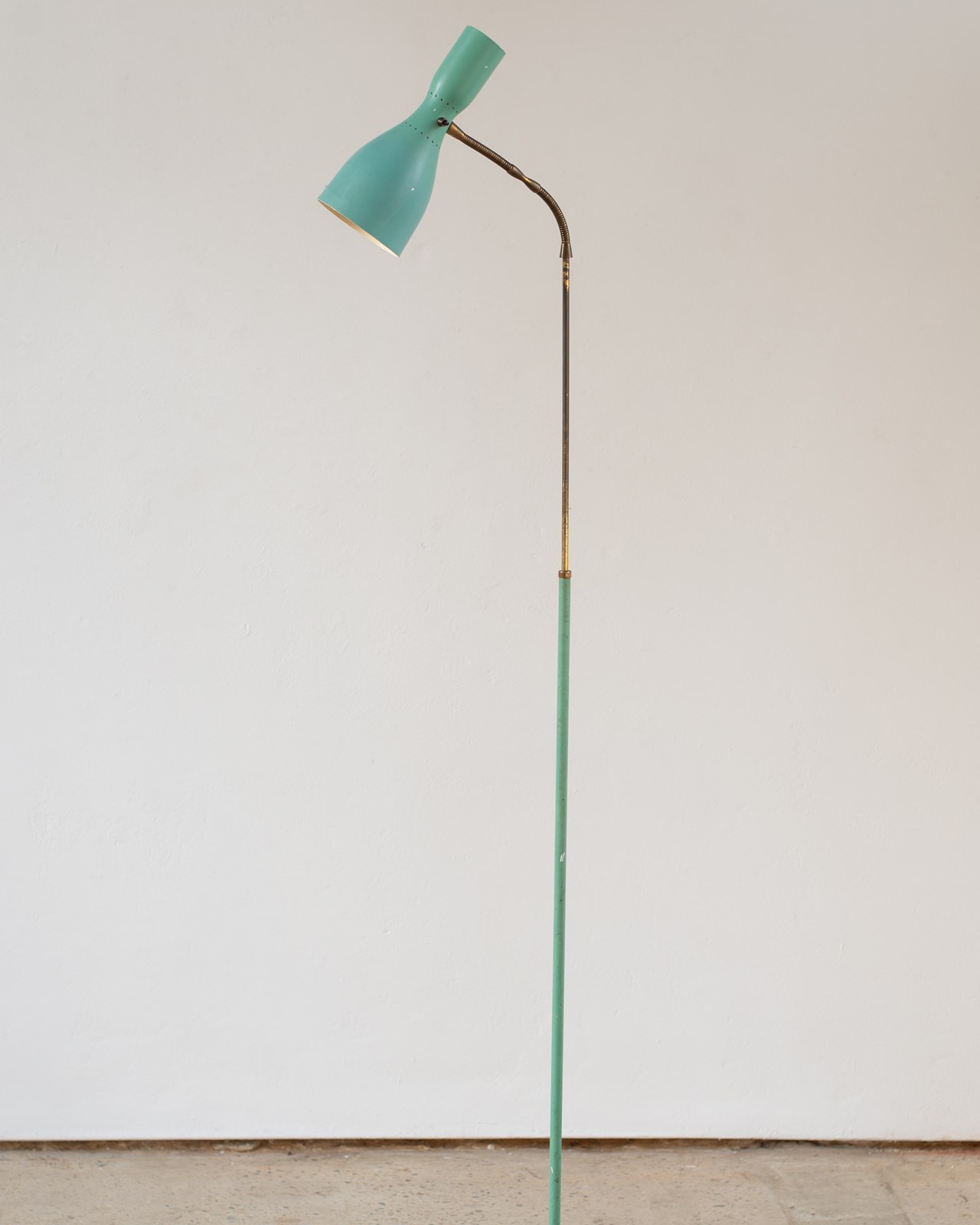 A brass and marble floor lamp, with original blue-green aluminium double-lamp shade, from Italy, C1950.  The double lamp gives both an up and down light, which can be switched on and off separately.  Adjustable along the brass pole, with a beautifully crafted goose-neck.