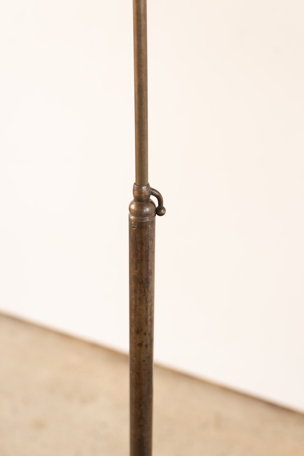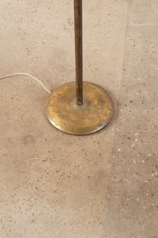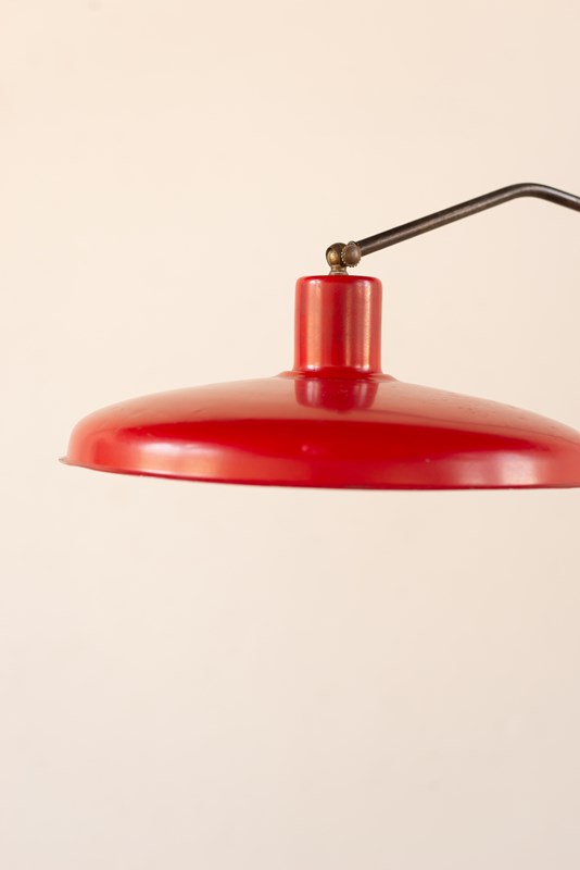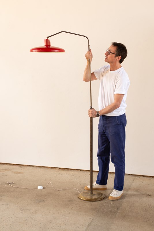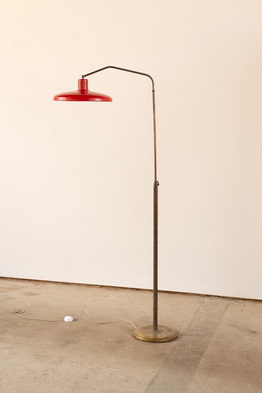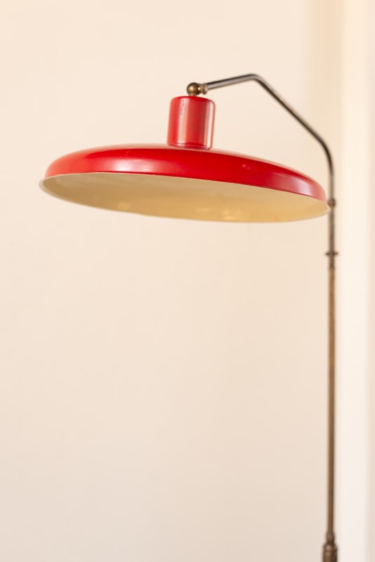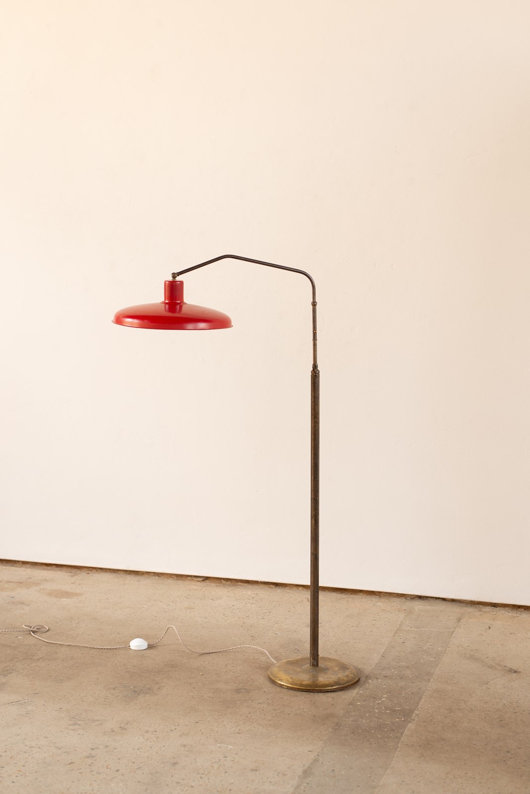 A generously proportioned floor lamp from Italy, C1950.  The brass pole can be heightened or lowered, and is angled at its head, holding a rich red spun aluminium shade.   This piece is in good vintage condition, with a beautiful patina to the brass.  There are some light indentations to the base, but nothing which detracts from its good looks.