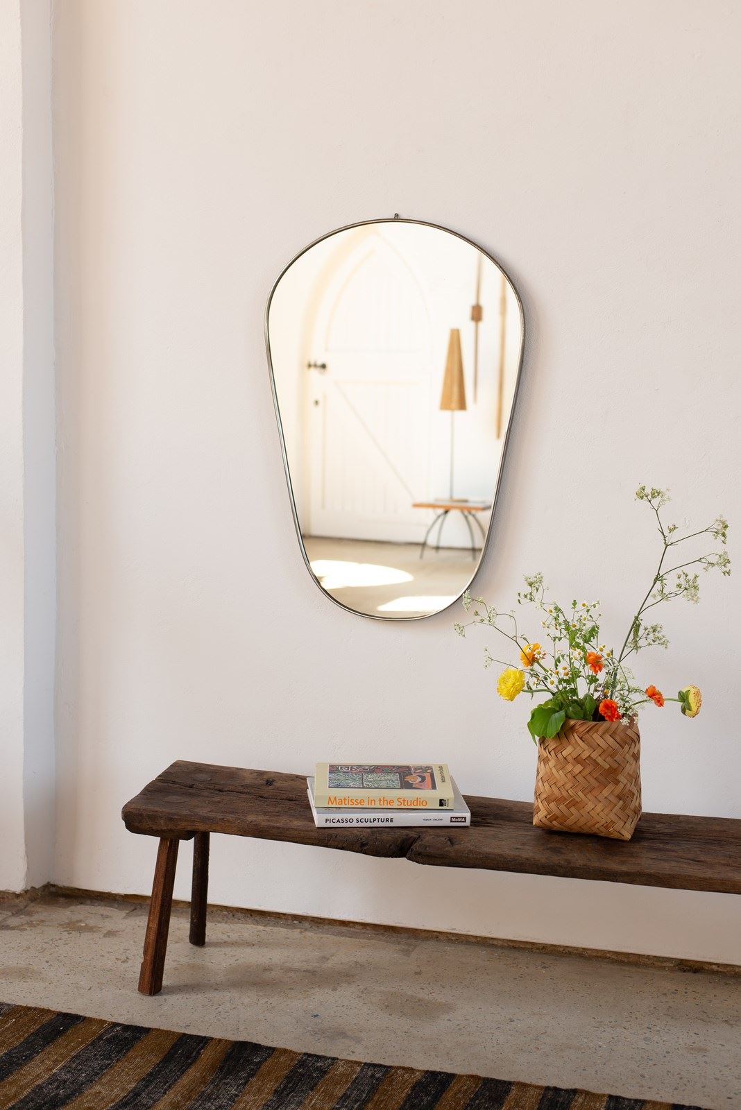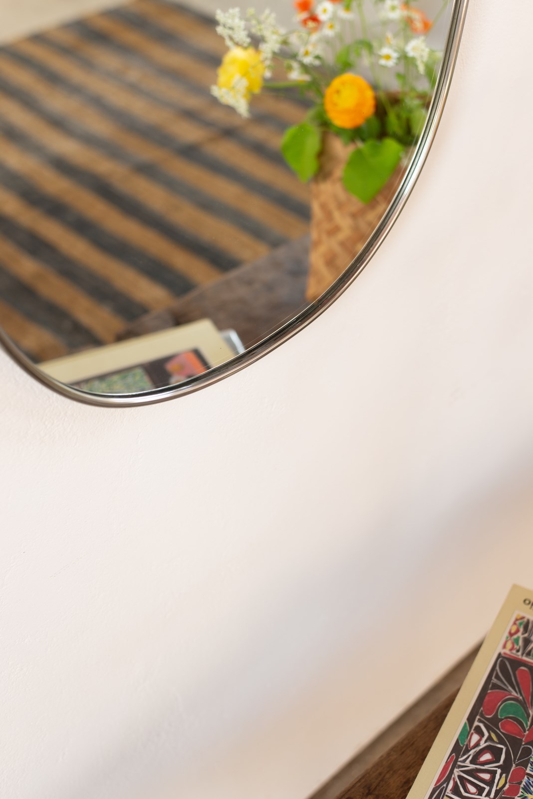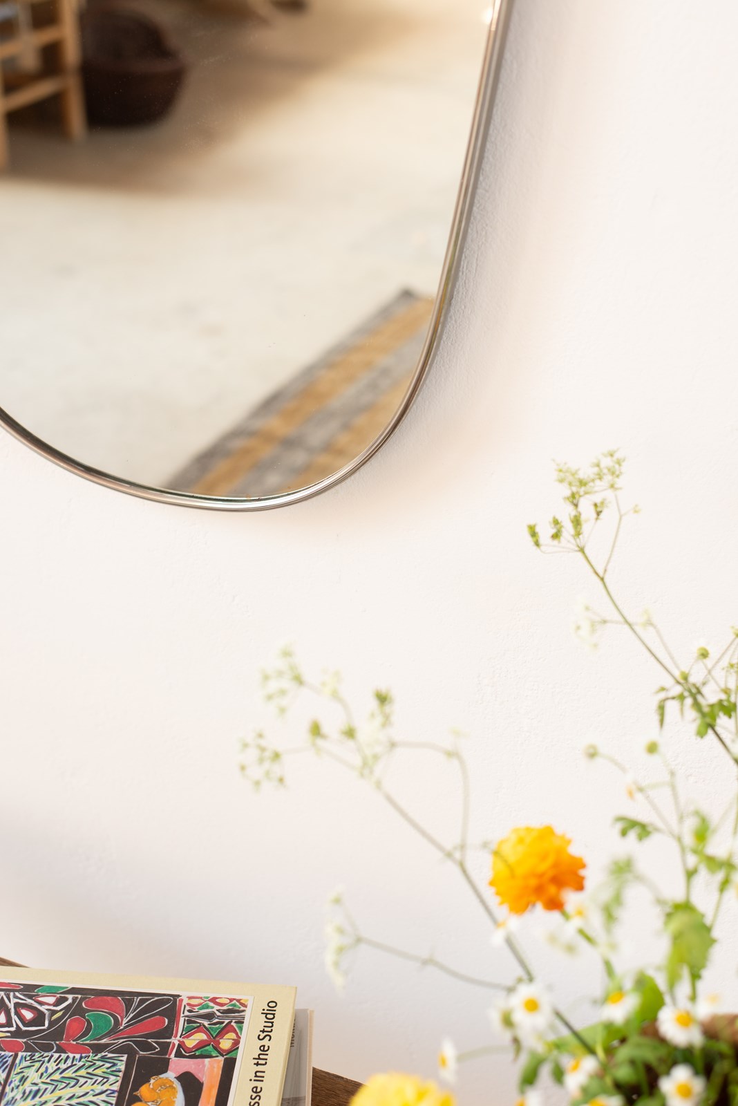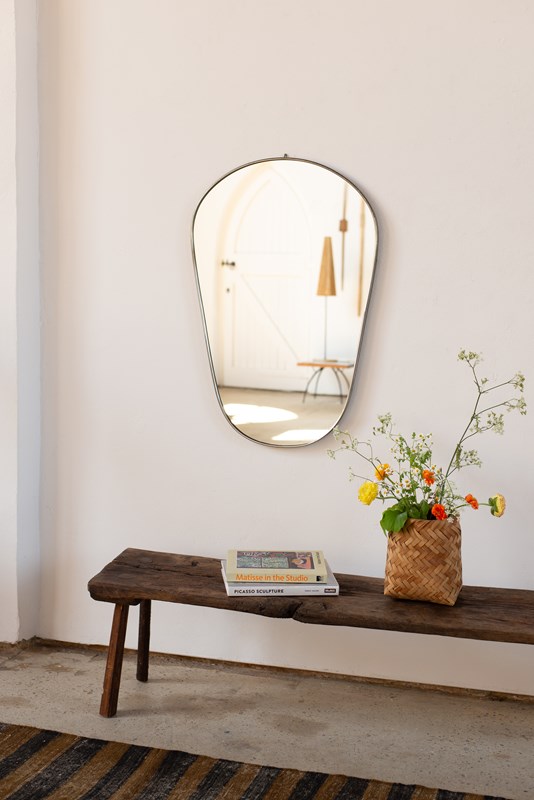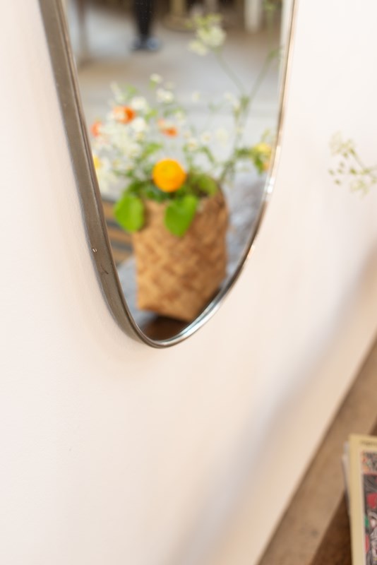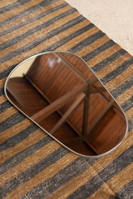 A nickel-plated mirror from Italy, C1950, with its original plate intact.   Generously proportioned and beautifully shaped, this piece is in very good vintage condition.