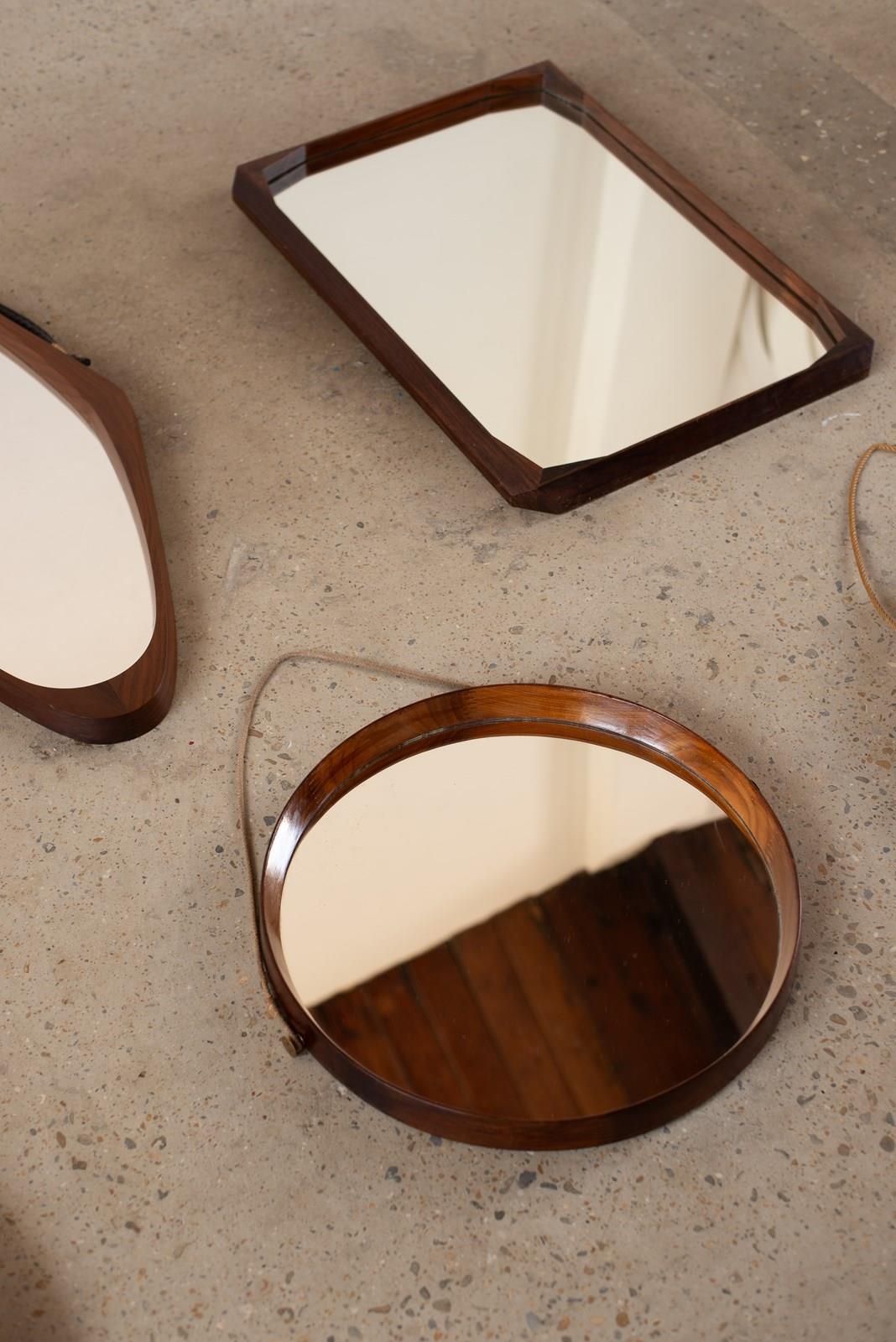 We have a collection of graphic shaped mirrors from Italy, C1960. Each frame is constructed from wood which is cut into a sleek facet. Each is individually designed to hang, either by a cord attached to either side, or more simply by a picture string or hook. They all have their original plate, and are in very good vintage condition.