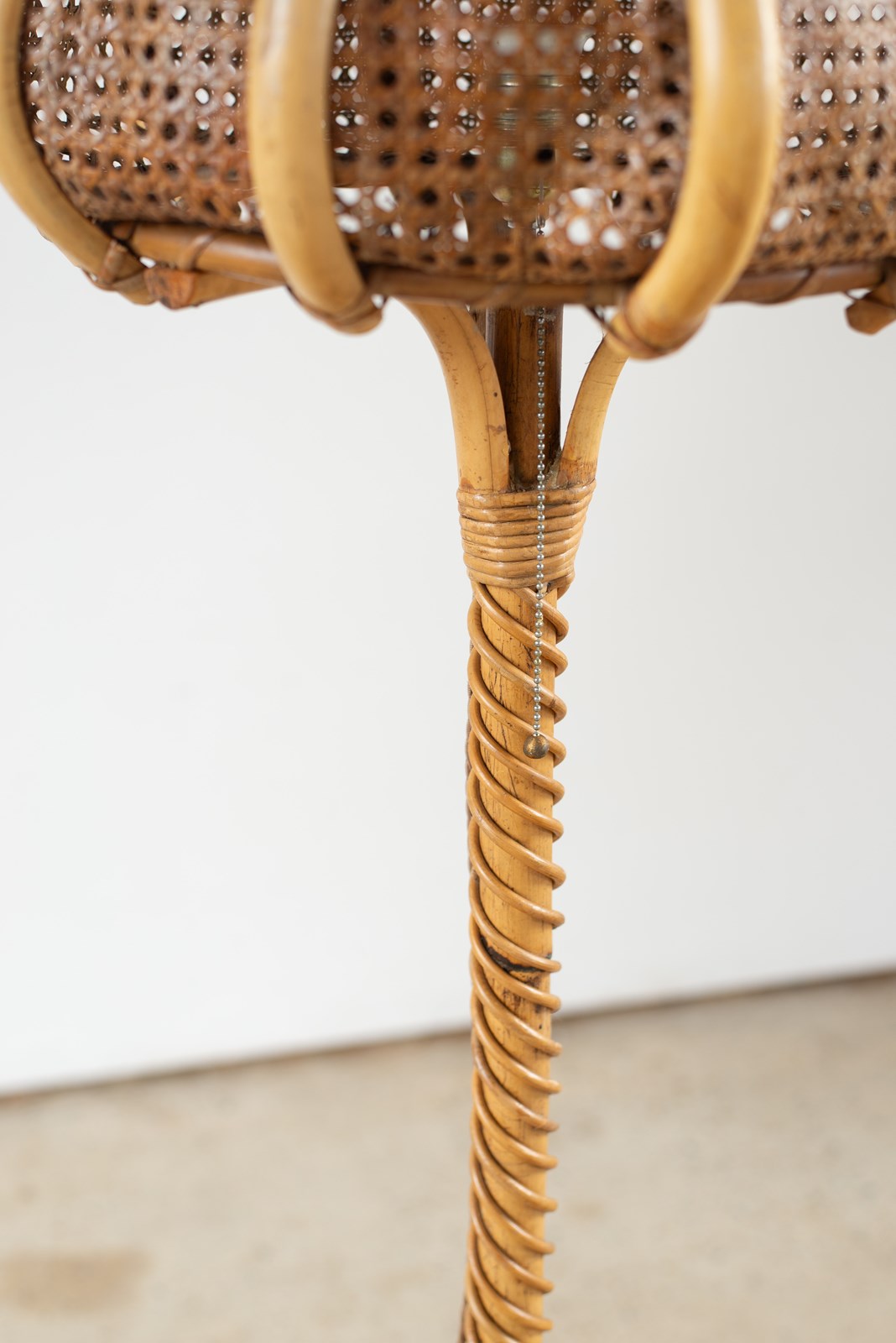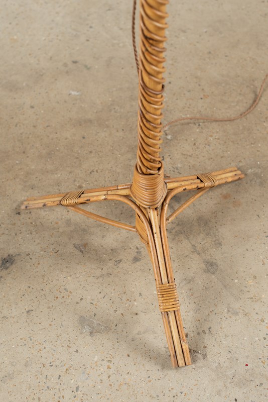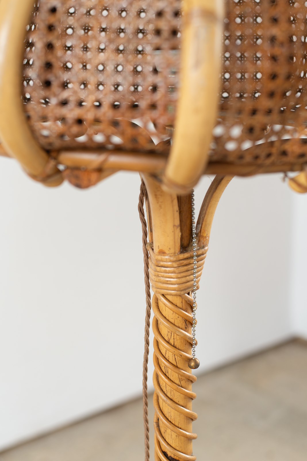 A charming floor lamp constructed from cane, with a beautiful twisted wrap around the central pole.  The shade is integral to the piece and created with curved cane arms surrounding a central rattan shade. It is in very good vintage condition.