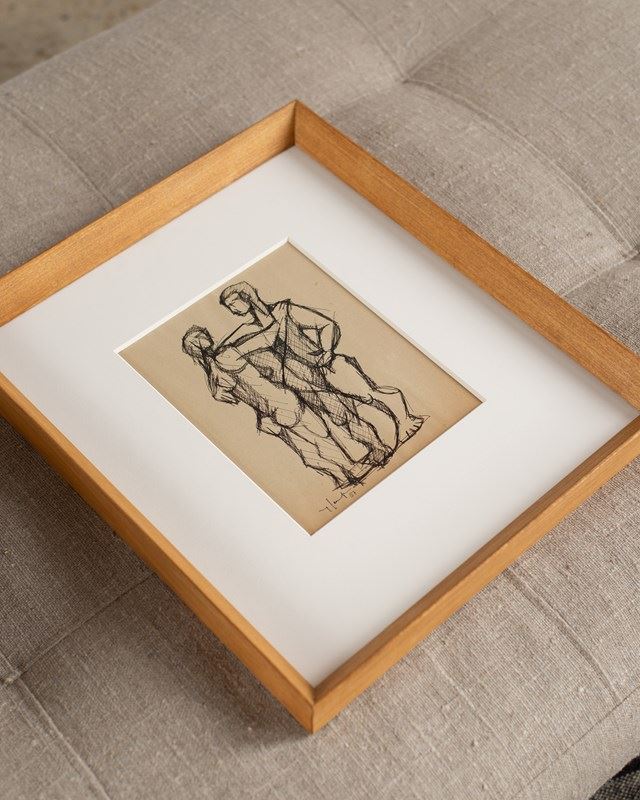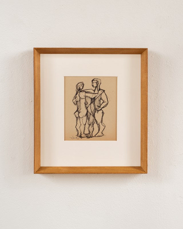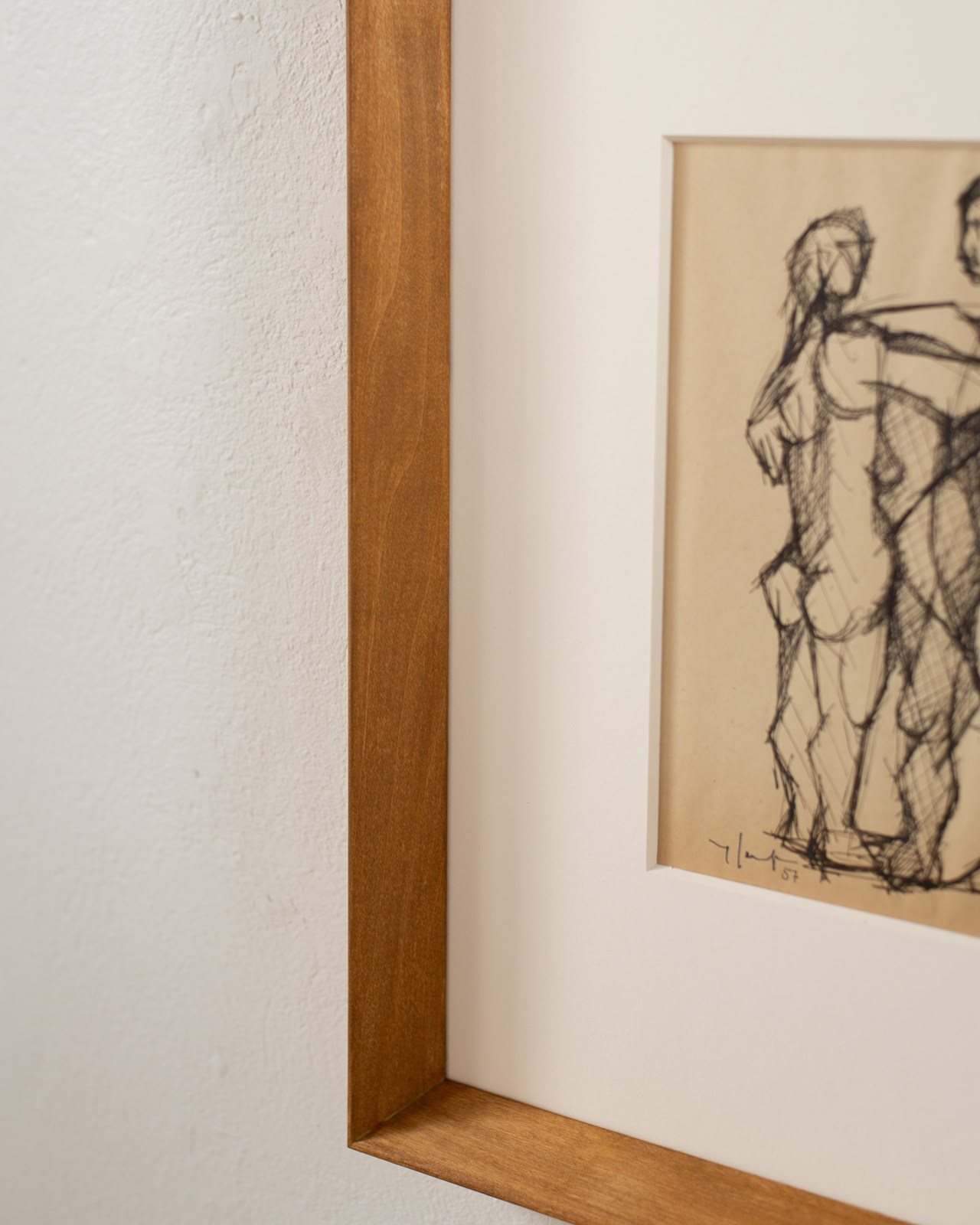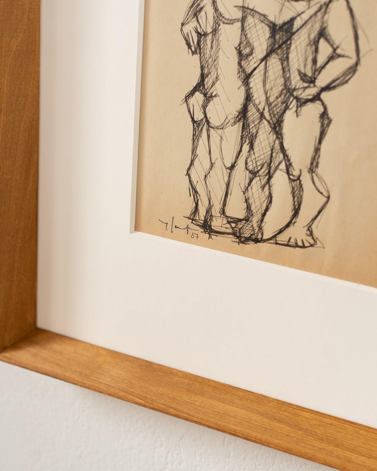A mid-century cubist drawing of figures in black ink on paper by French artist Yves Jobart, signed and dated 1957.  Presented in a hand-stained bevelled wood frame with museum-grade glass.