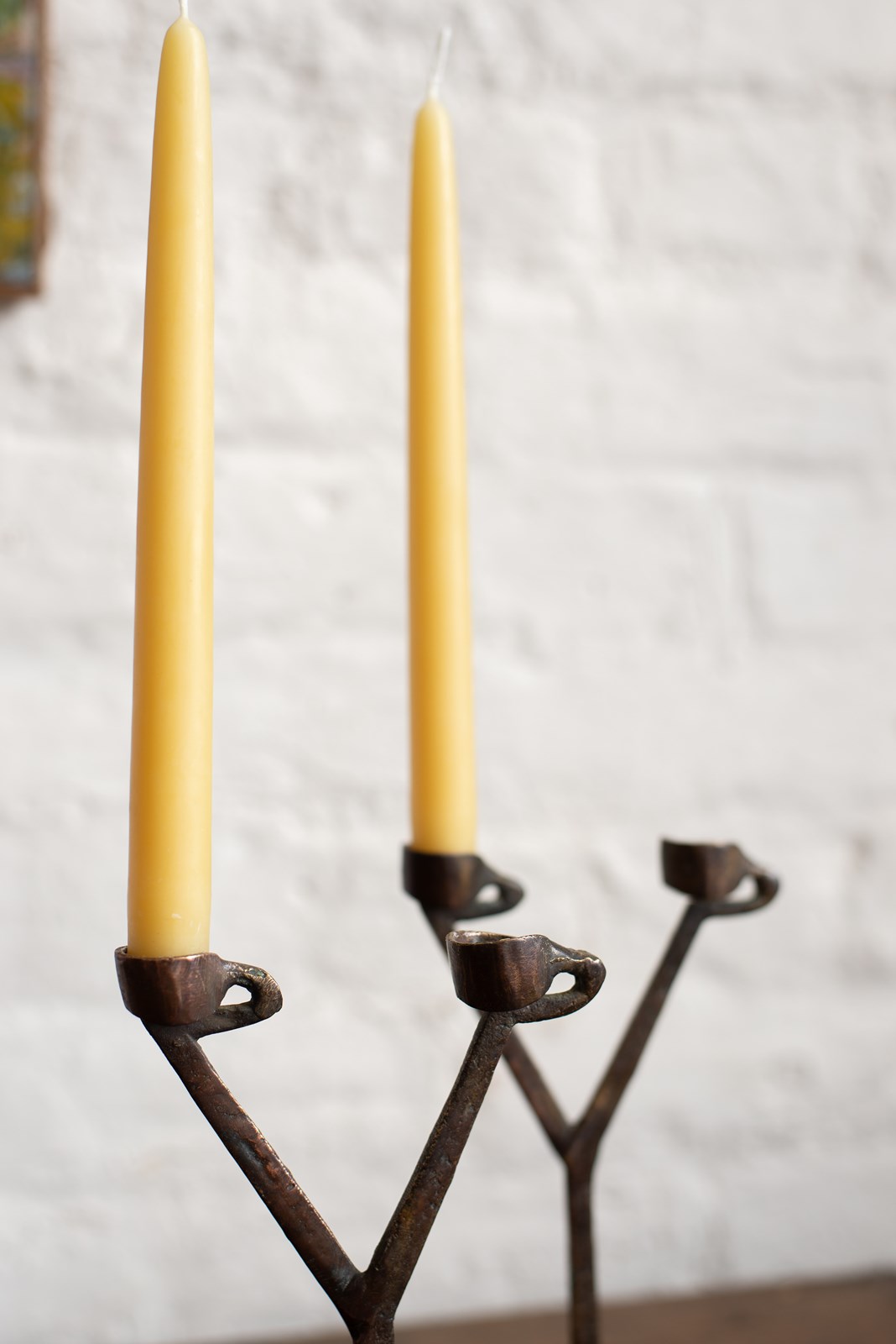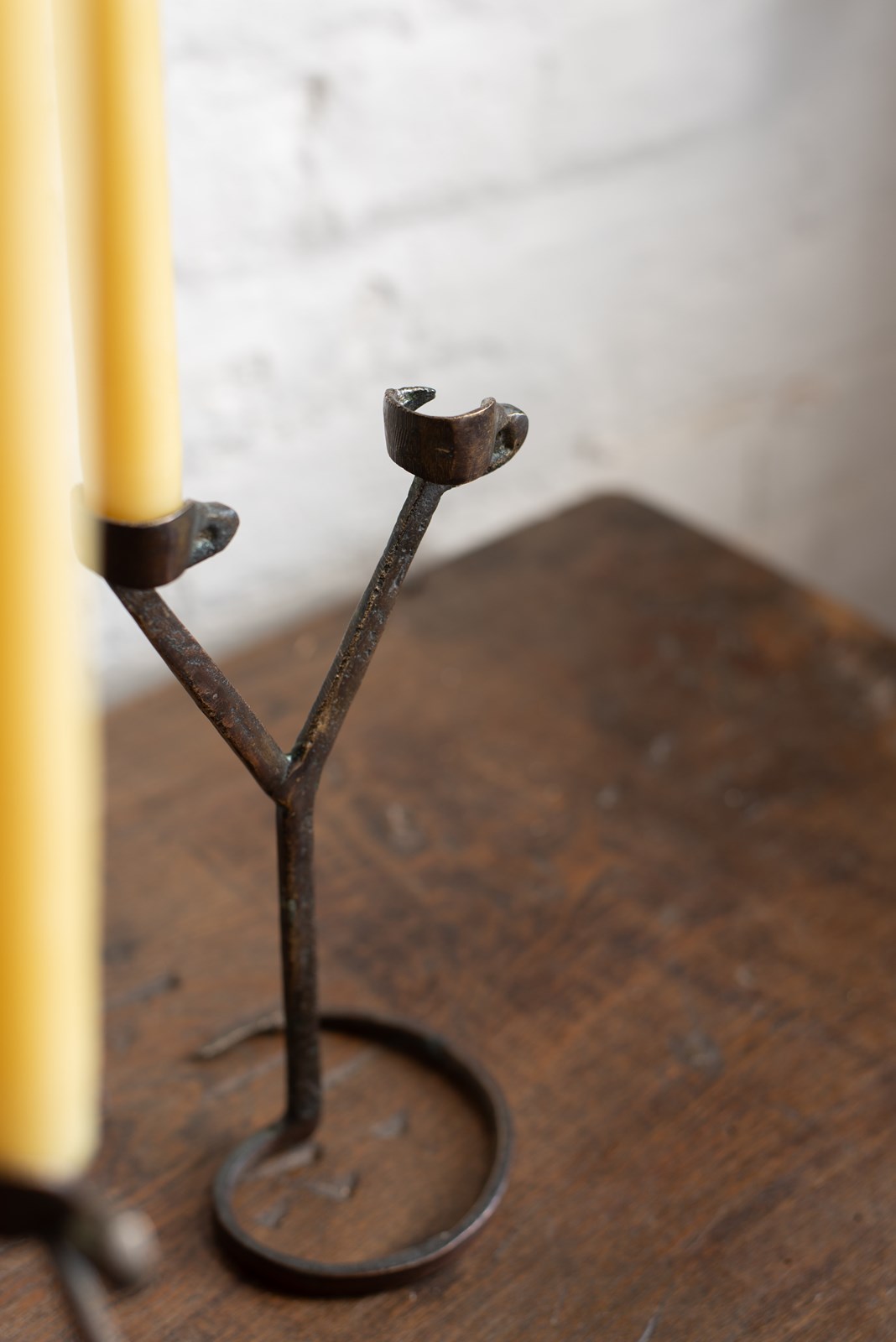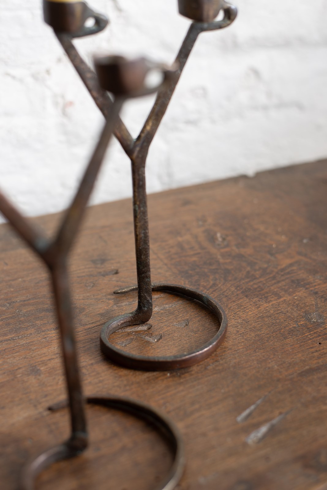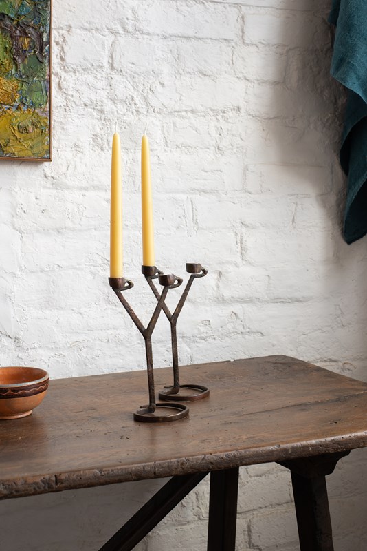 Mid-century hand forged metal double candle-holders from France, C1960. They have a wonderful patina to the surface and are in very good vintage condition.  Available individually.