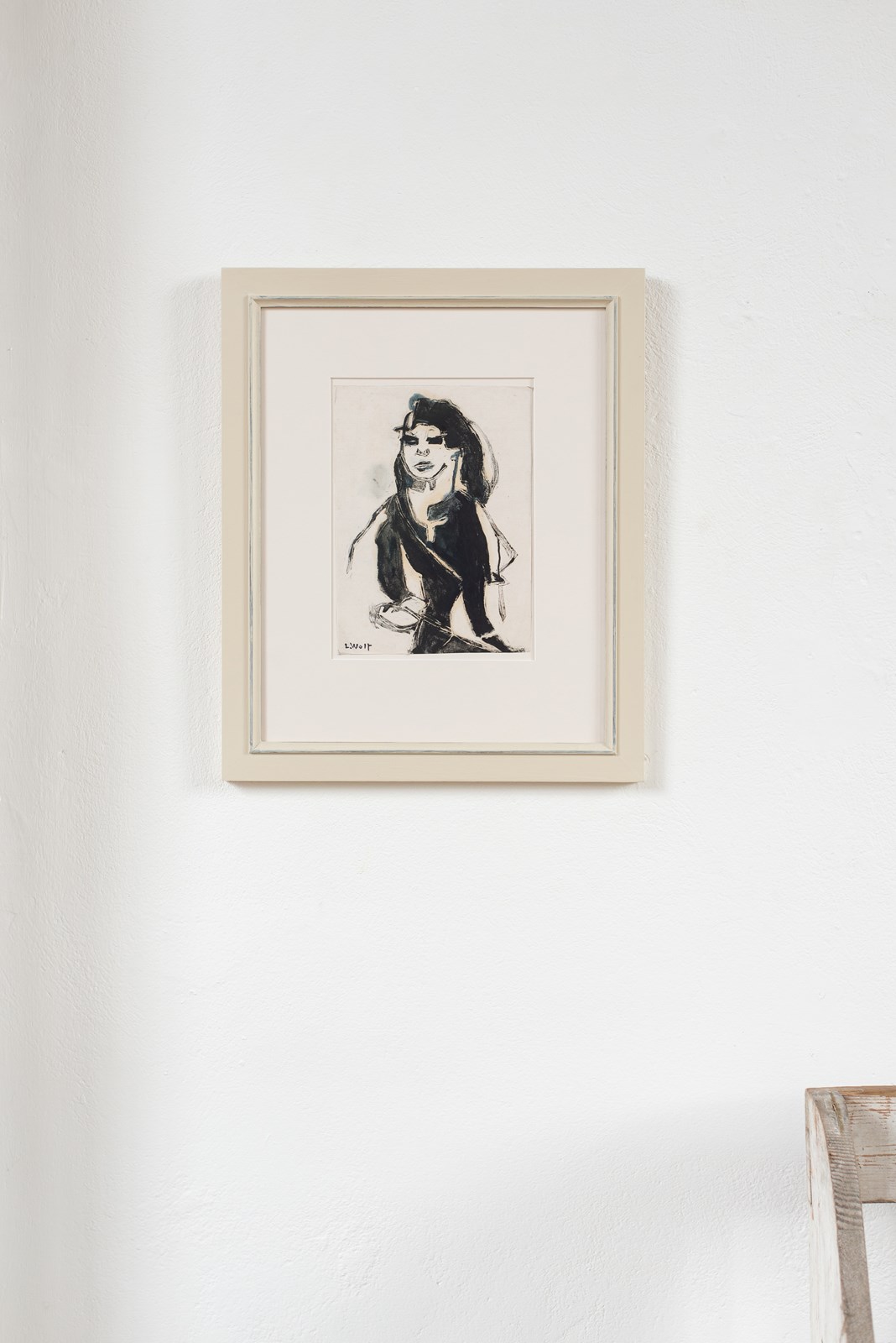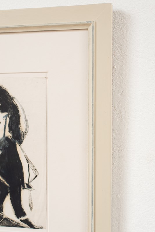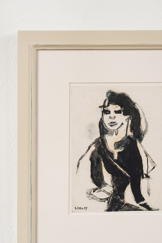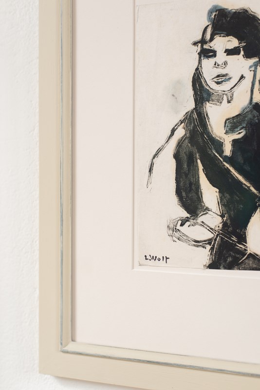 A mid-century portrait work by German artist Lotte Wolf-Koch (1909 - 1977), printed using a wood block technique and painted by hand,signed.   The work is in soft black on an off-white paper, and has been mounted in a hand-painted wooden frame.