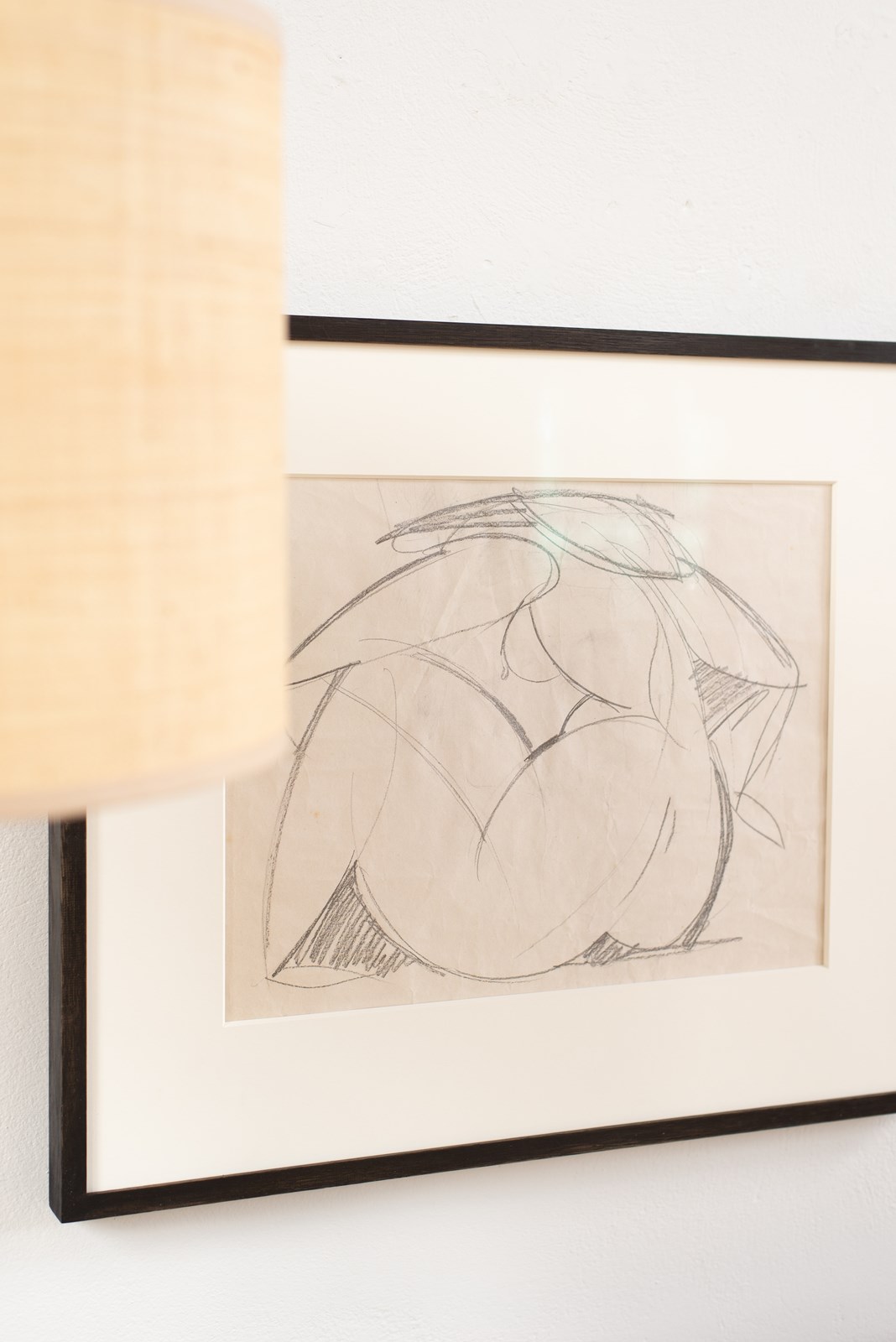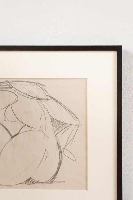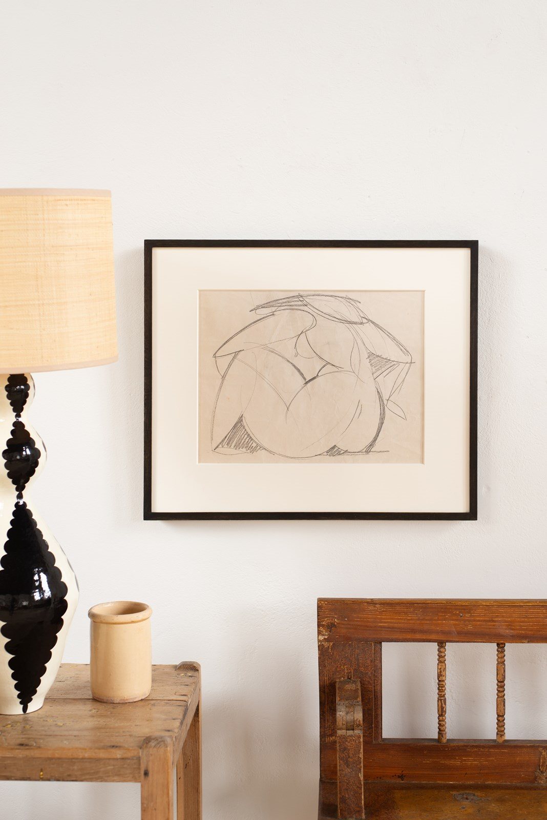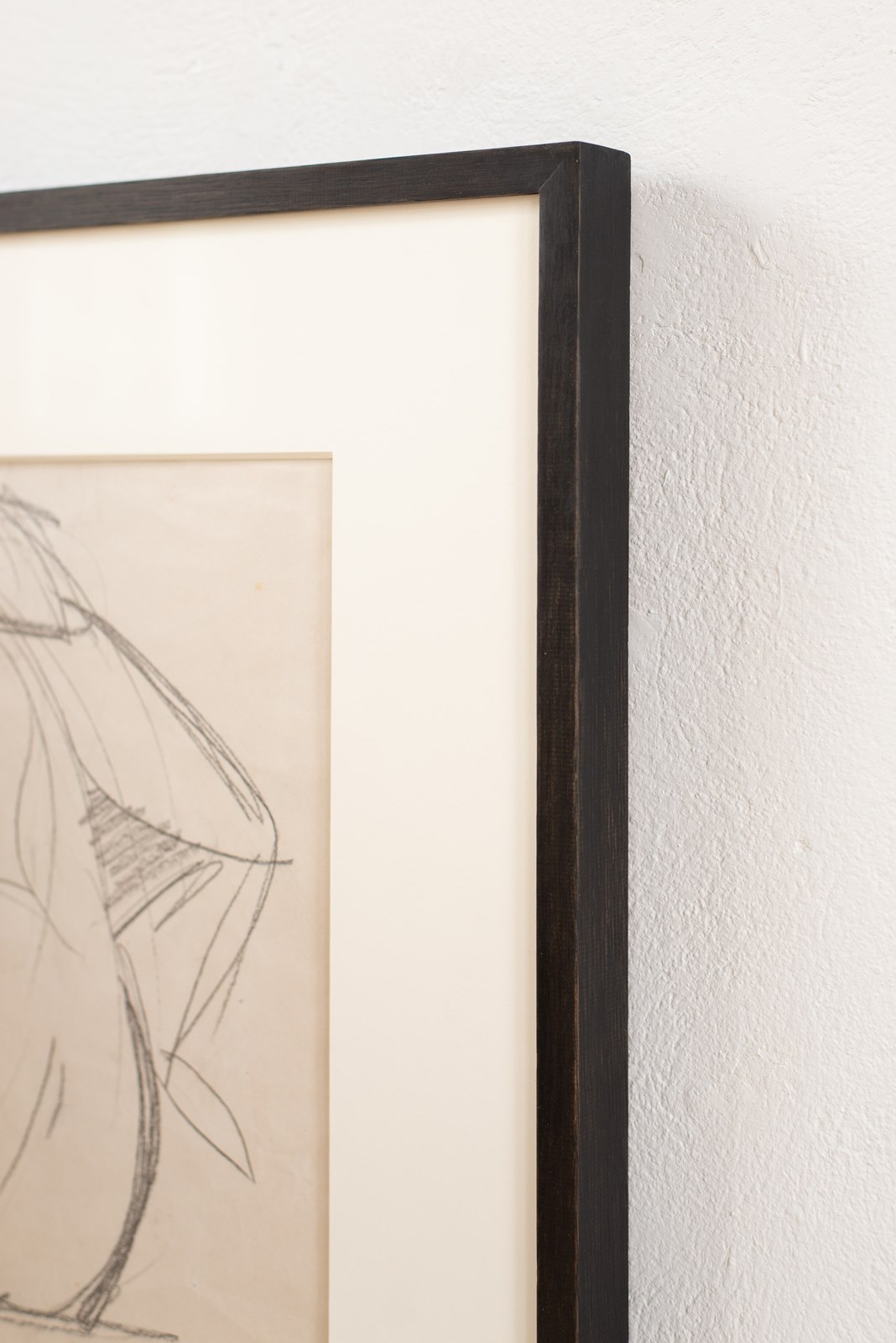 An original modernist Italian line drawing of a nude on paper.  Using bold pencil marks, accentuating the silhouette.  Mounted underneath protective glass, within a hand-painted black-washed wooden frame.