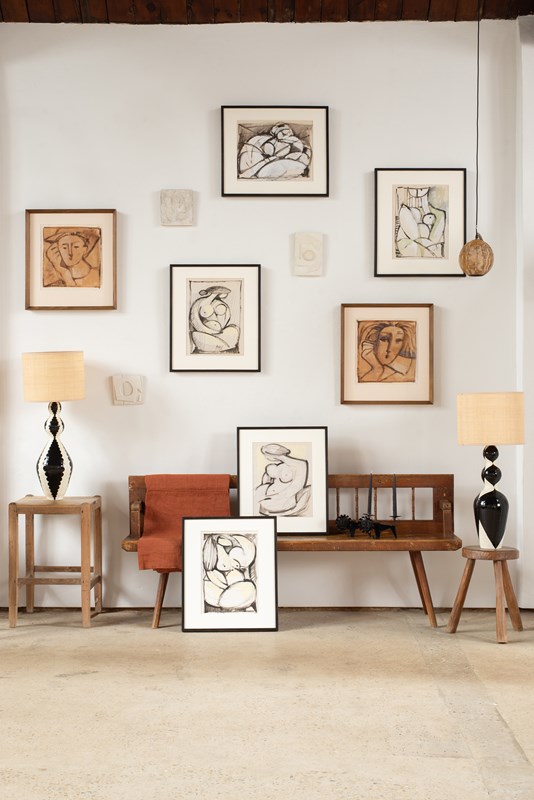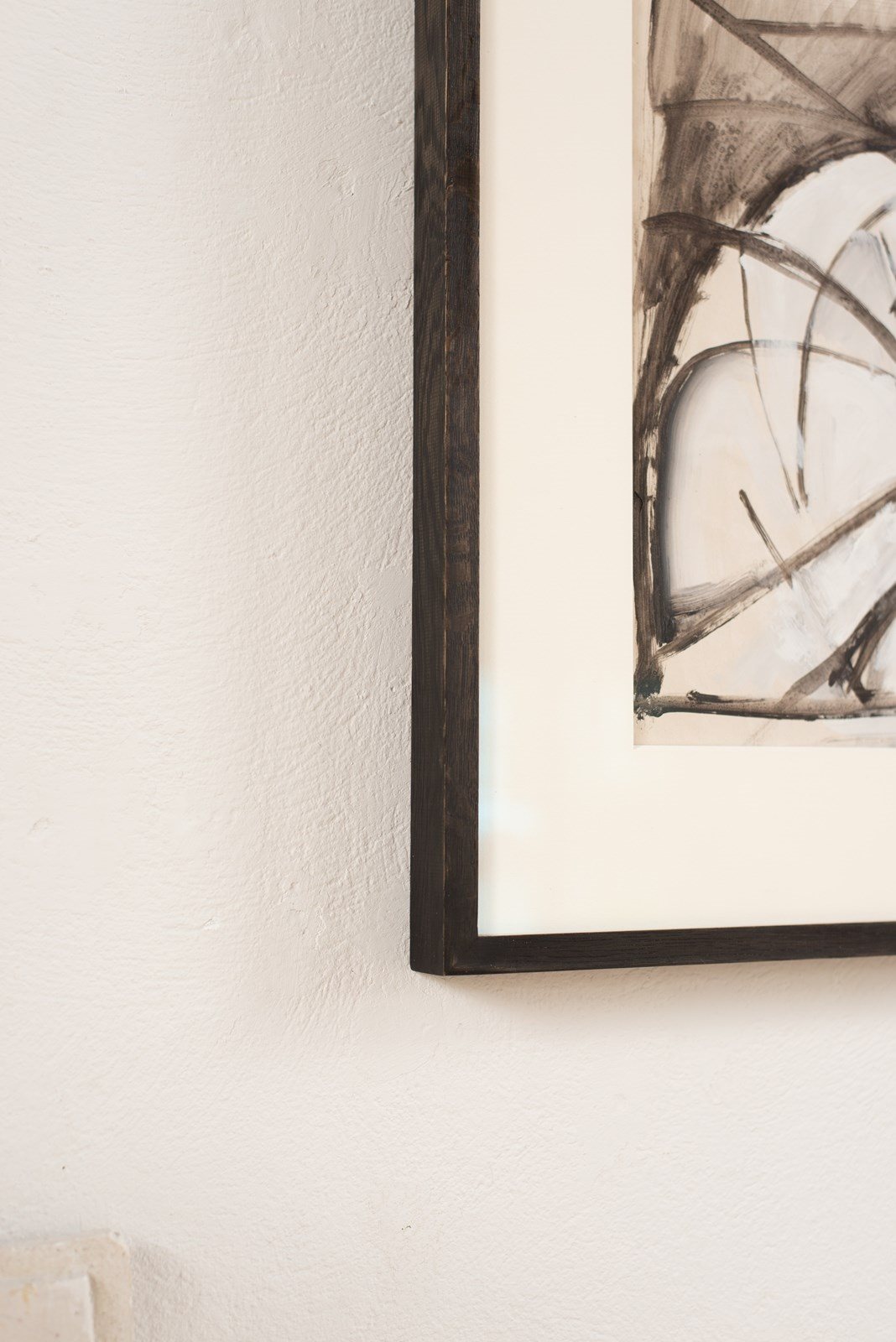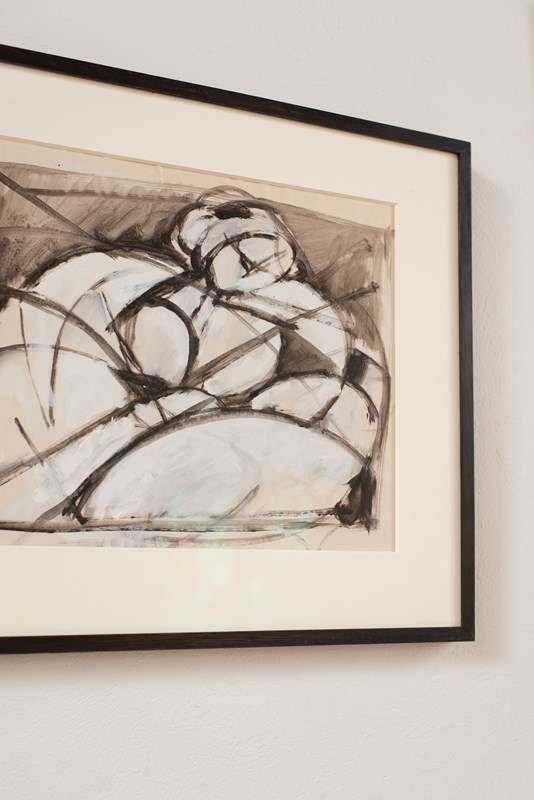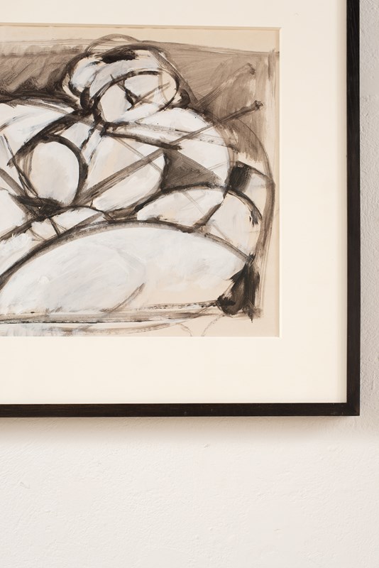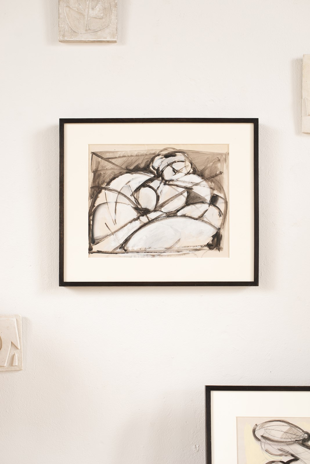 An original modernist Italian painting of a nude in graphic black and white watercolour on paper.  Using bold brush strokes, accentuating the silhouette.  Mounted underneath protective glass, within a hand-painted black-washed wooden frame.