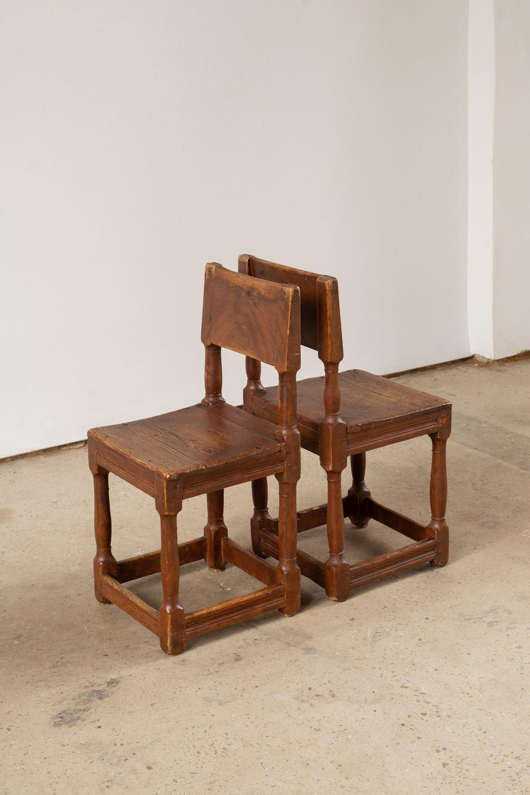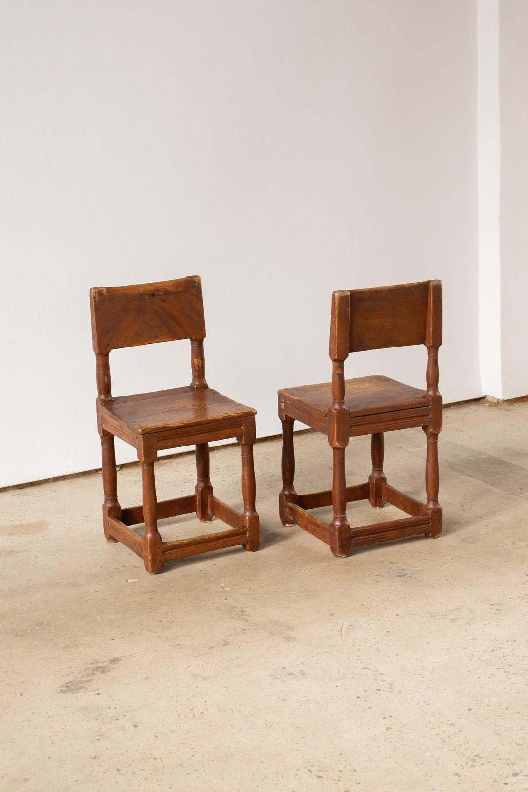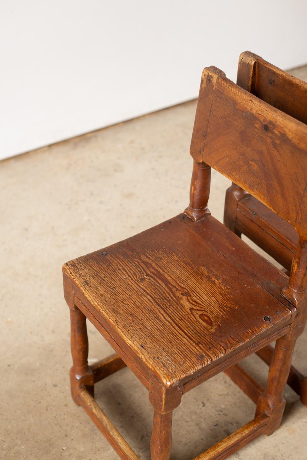 A pair of 19th-century Swedish oak hall chairs, with remnants of their original reddish-brown painted surface evident.  Both are structurally sound and could be used as occasional seating.  Wonderful on either side of a console.