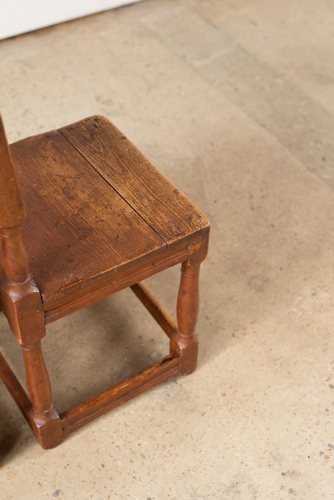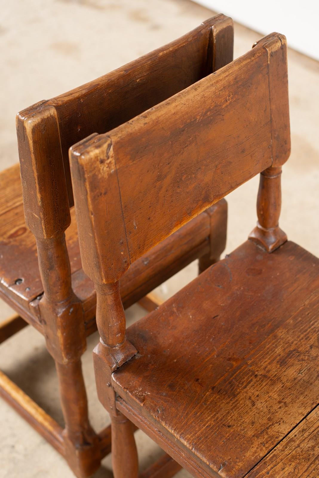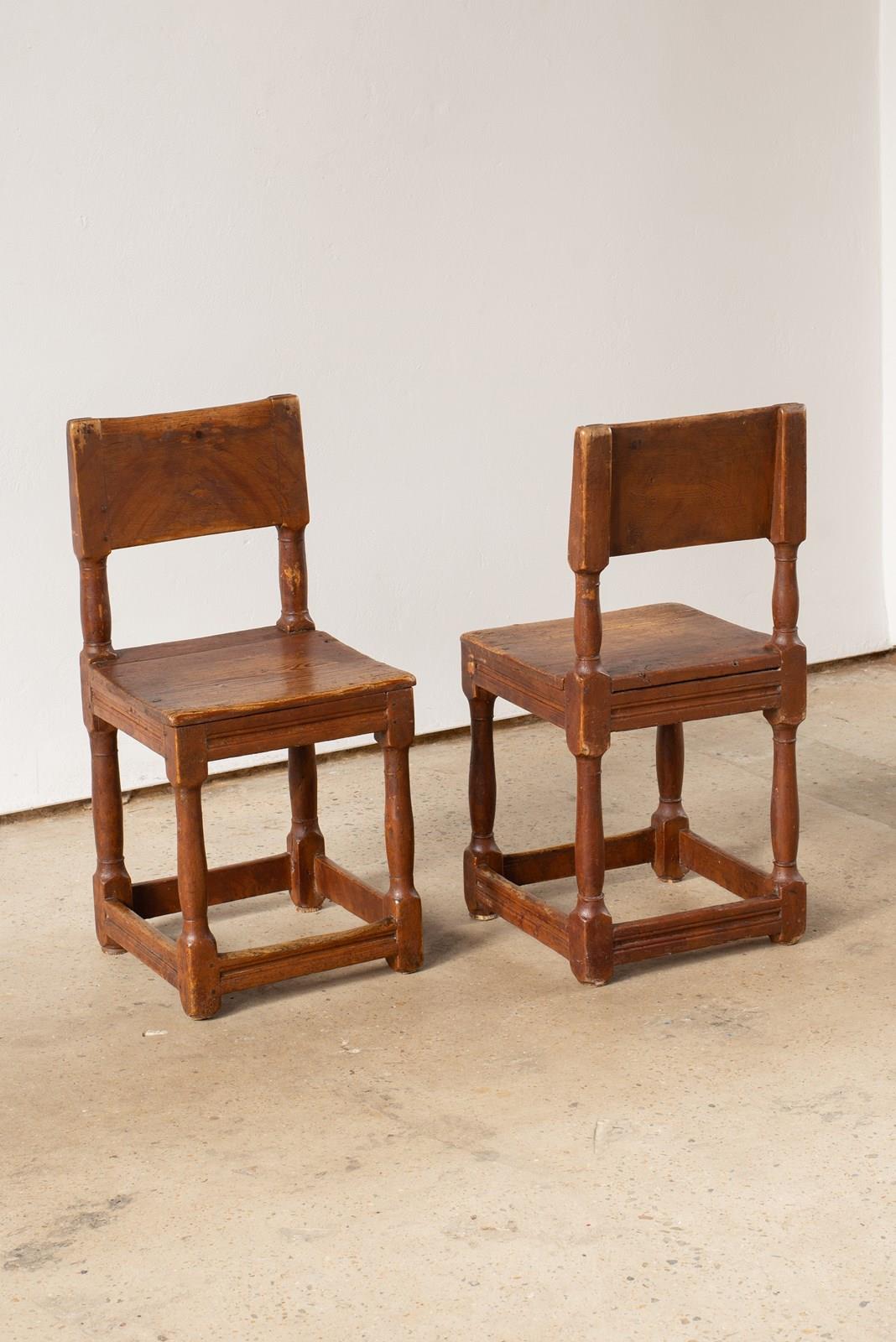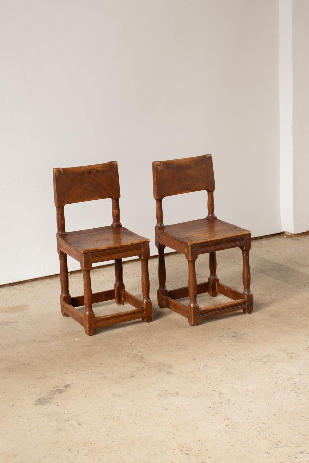 A pair of 19th-century Swedish oak hall chairs, with remnants of their original reddish-brown painted surface evident.  Both are structurally sound and could be used as occasional seating.  Wonderful on either side of a console.