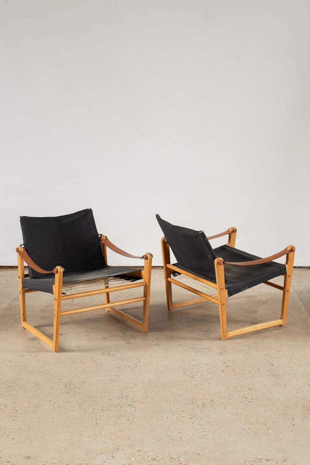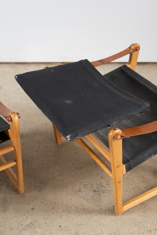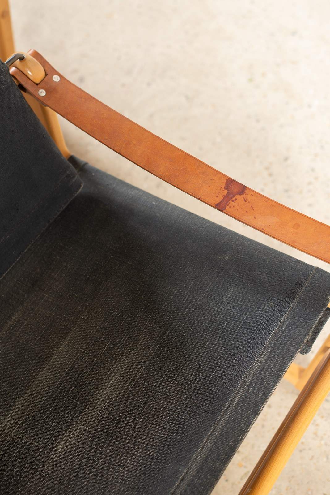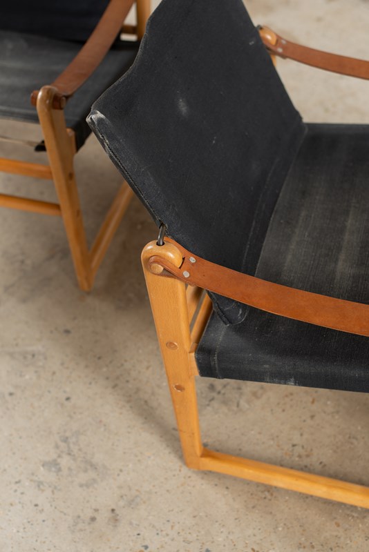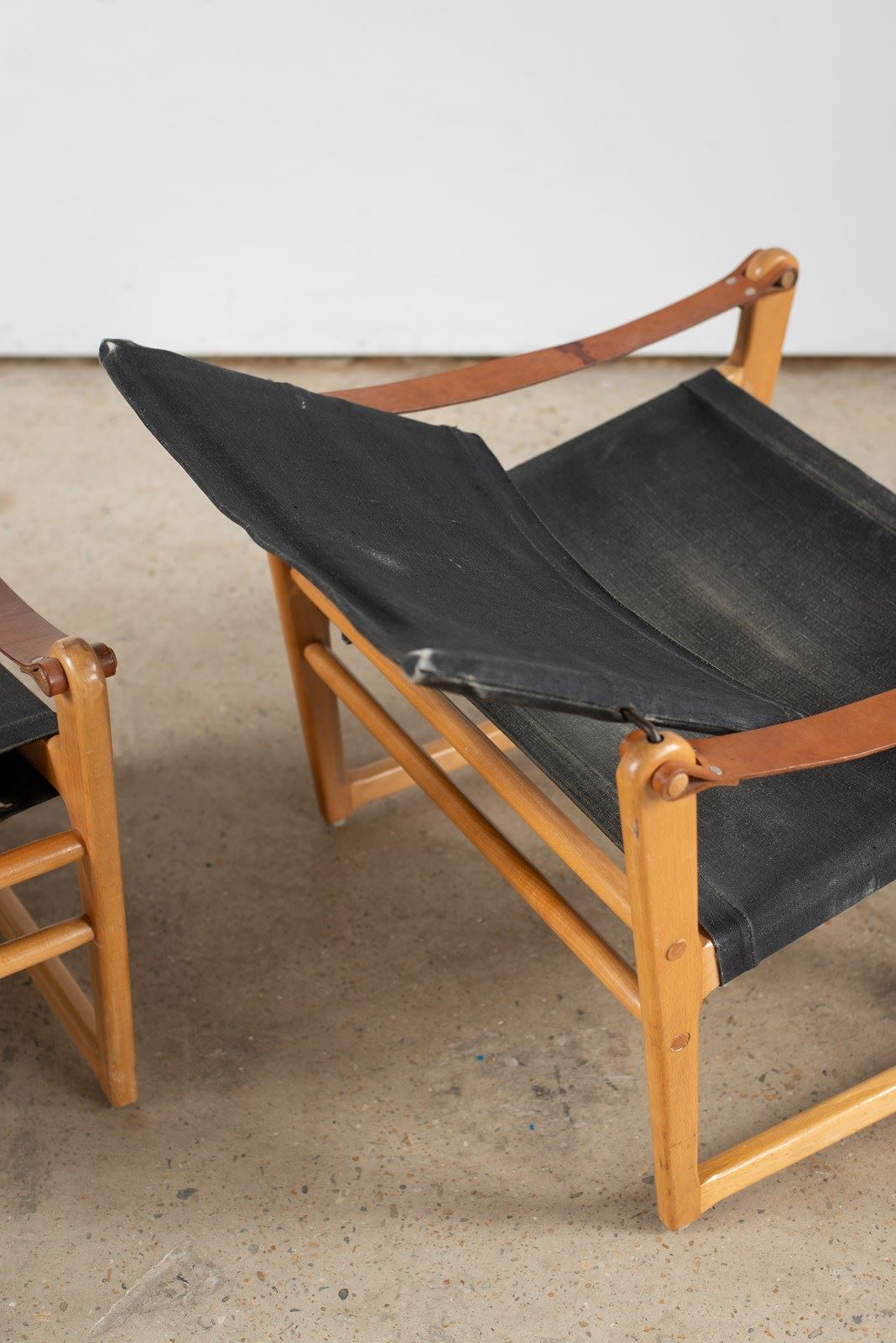 A pair of original Cikada safari chairs, designed by Bengt Ruda (1918-1999) for Swedish company Möbel Ikea, C1960. Made from beech wood with tan leather armrests. They have their original black canvas covers intact, which have a wonderful 'denim-like' patina to the surface.