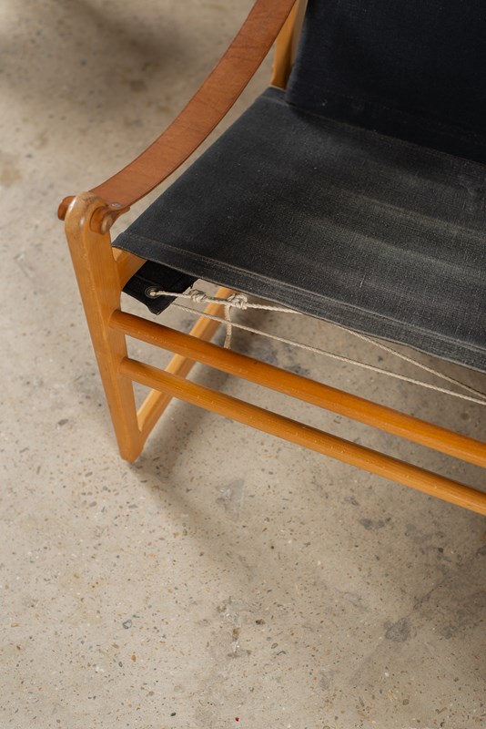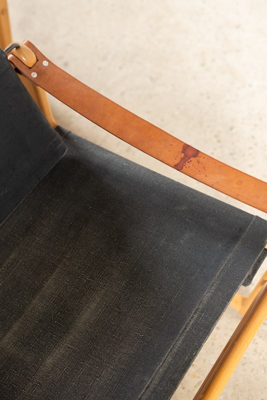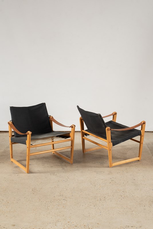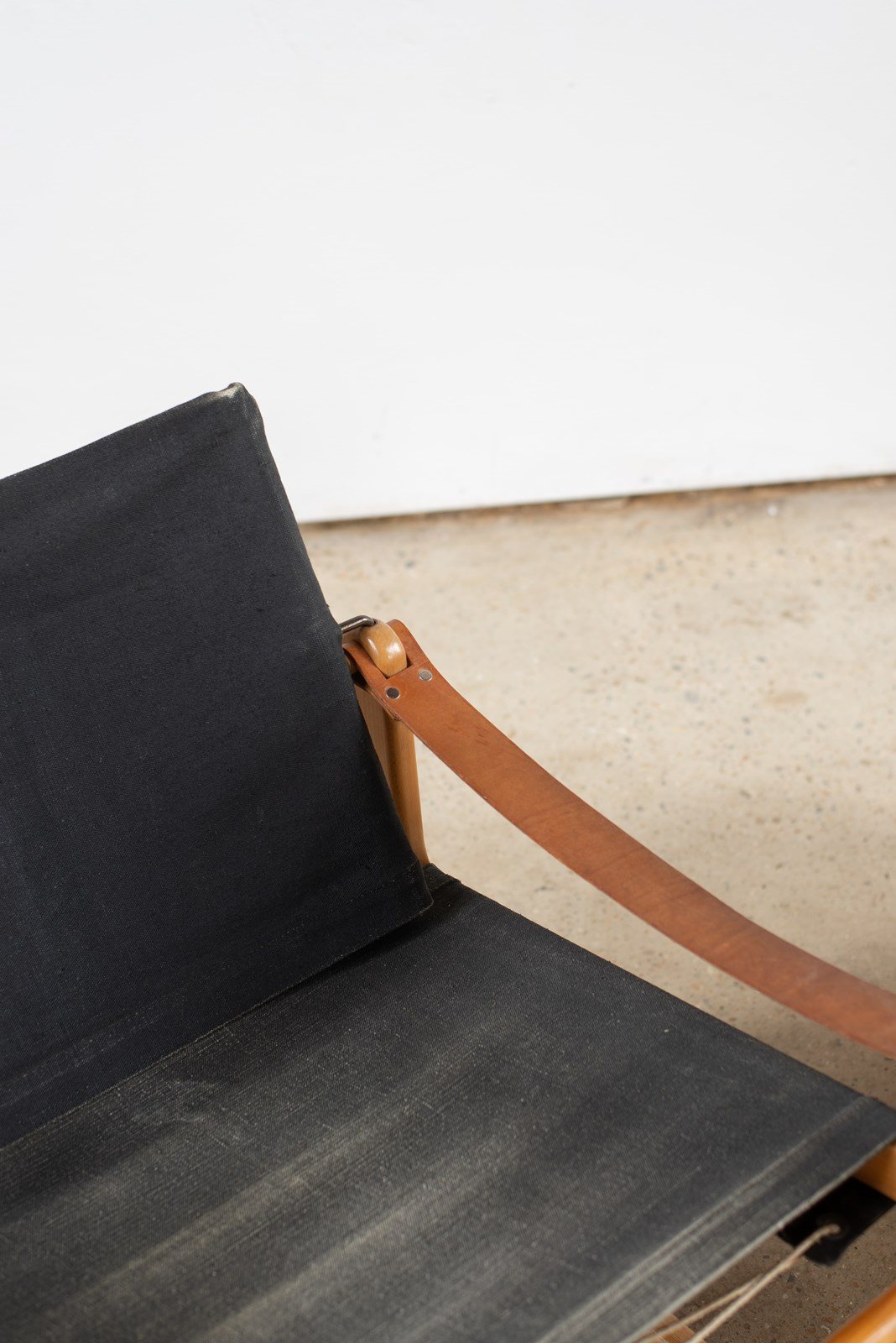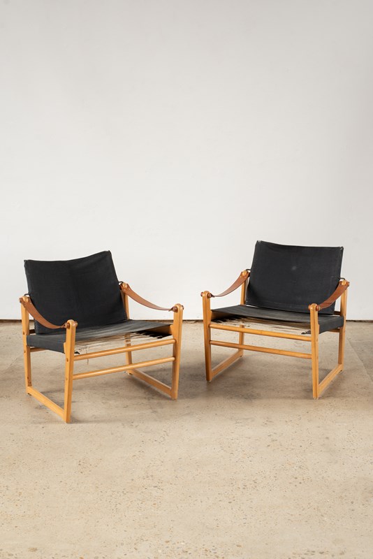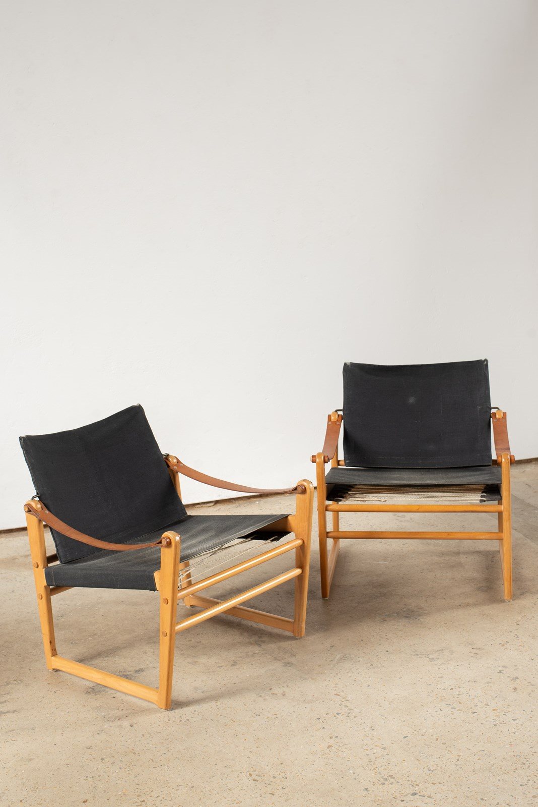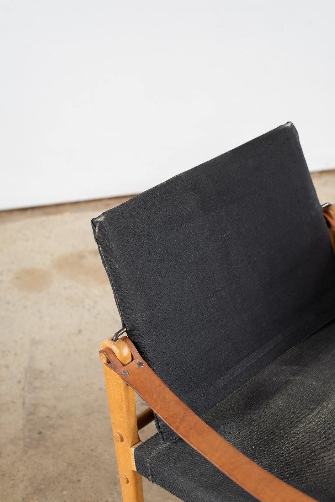 A pair of original Cikada safari chairs, designed by Bengt Ruda (1918-1999) for Swedish company Möbel Ikea, C1960. Made from beech wood with tan leather armrests. They have their original black canvas covers intact, which have a wonderful 'denim-like' patina to the surface.