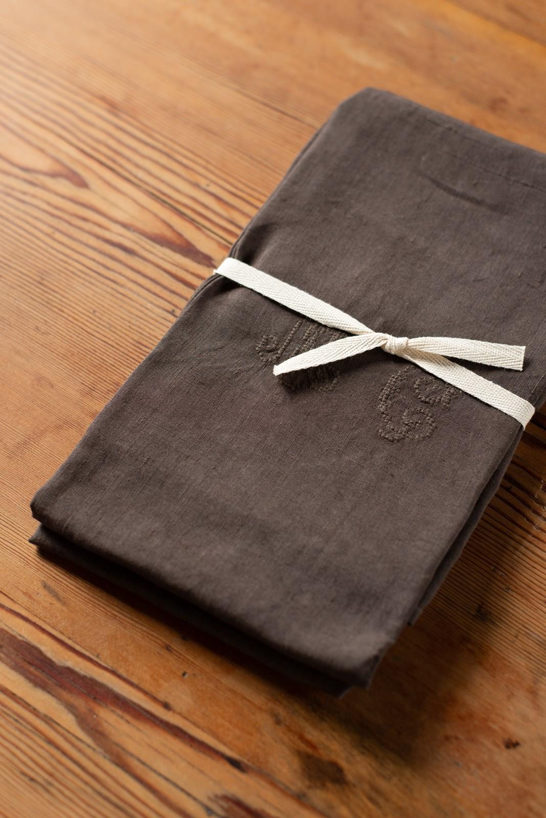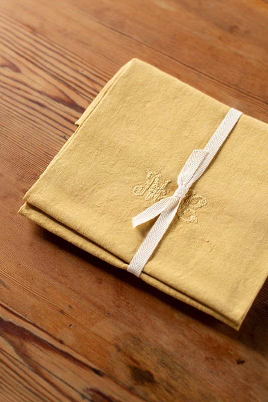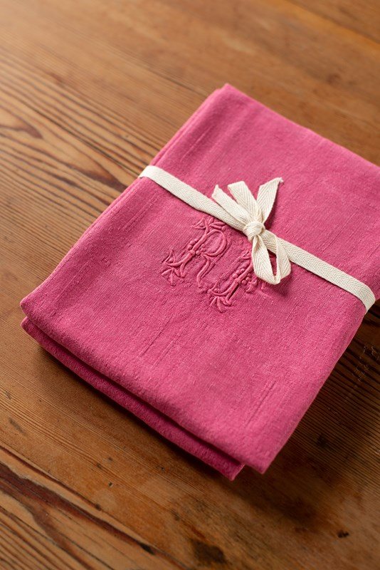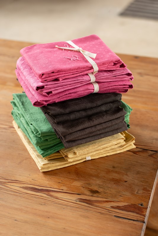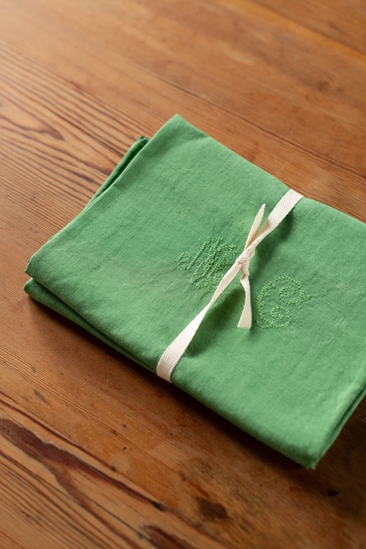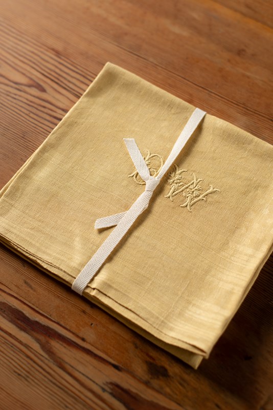 We have some wonderful large antique linen napkins which have been hand-dyed for us in shades of rose pink, verdant green, deep brown and yellow ochre. Each set is a matching pair; some are plain linen, whilst others have a jacquard pattern within the weave. All are beautifully hand-embroidered with monograms.