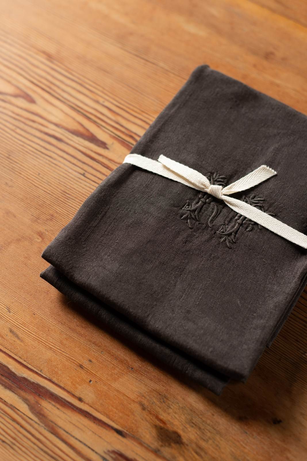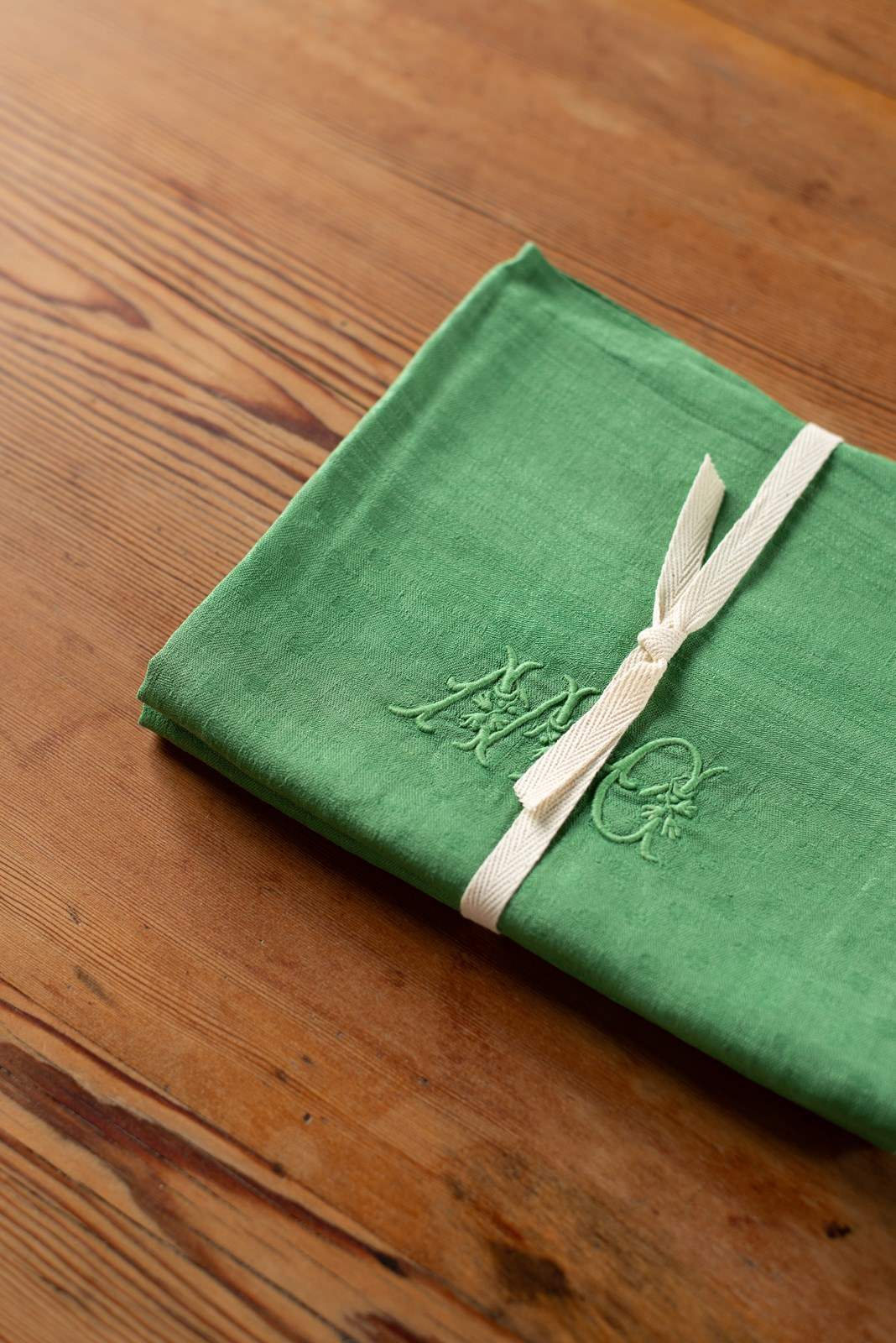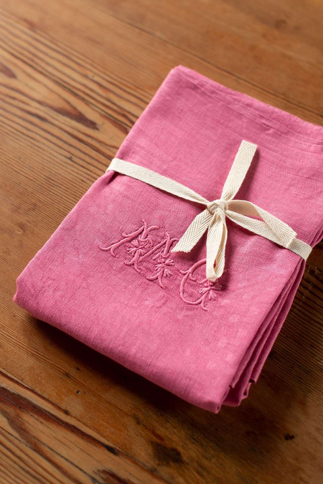 We have some wonderful large antique linen napkins which have been hand-dyed for us in shades of rose pink, verdant green, deep brown and yellow ochre. Each set is a matching pair; some are plain linen, whilst others have a jacquard pattern within the weave. All are beautifully hand-embroidered with monograms.