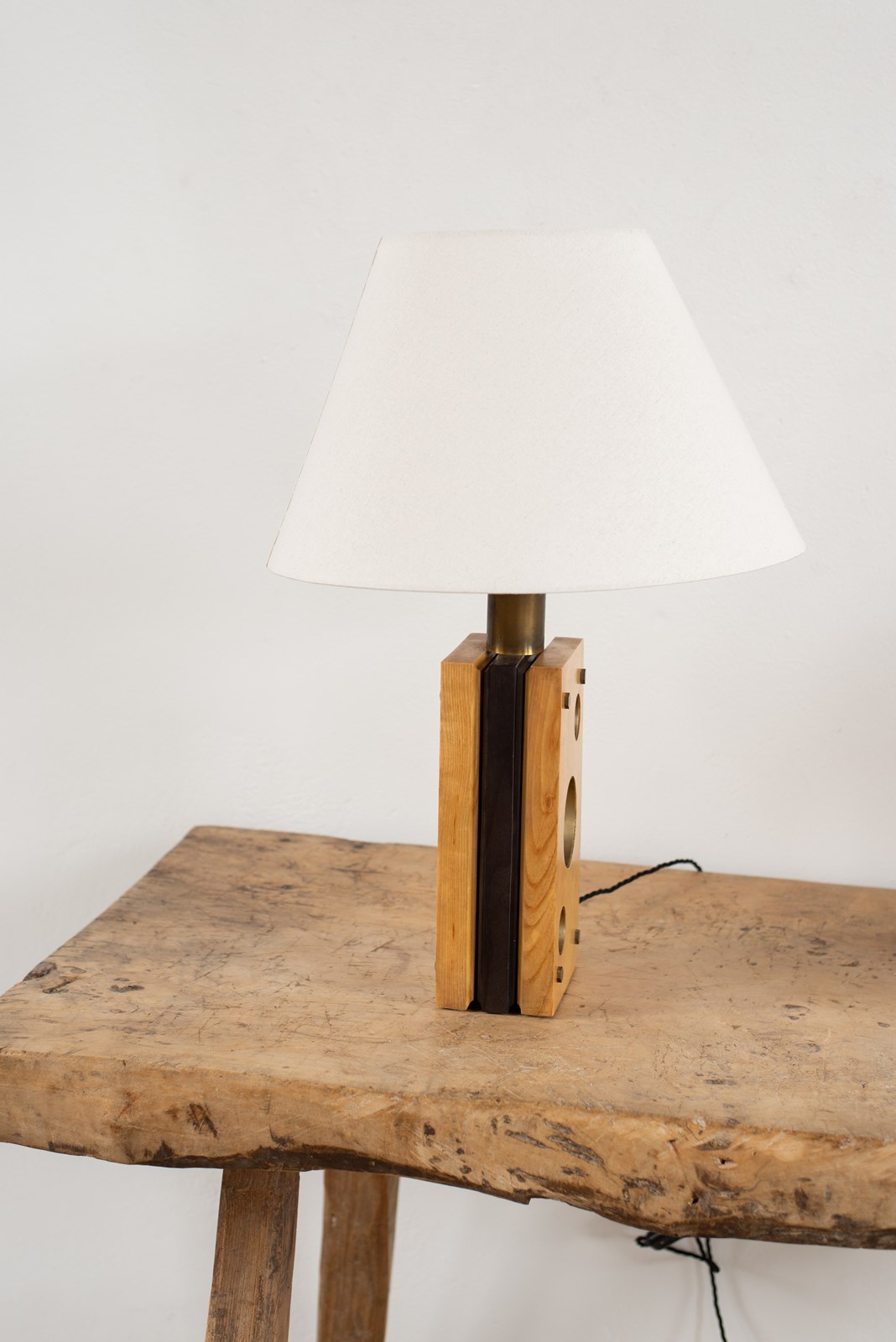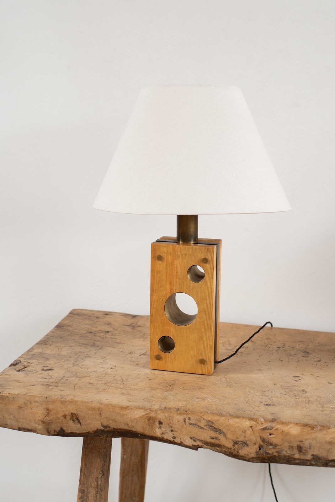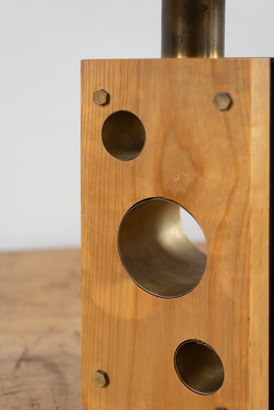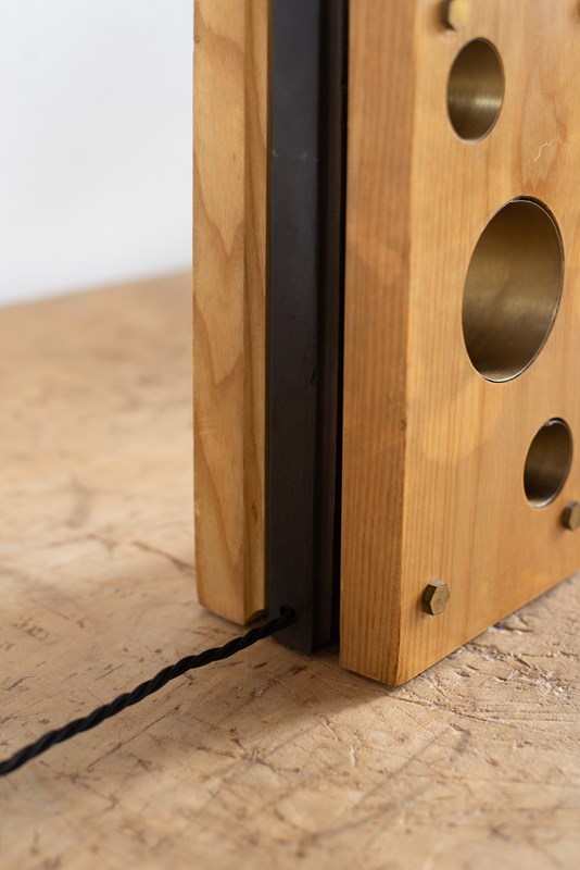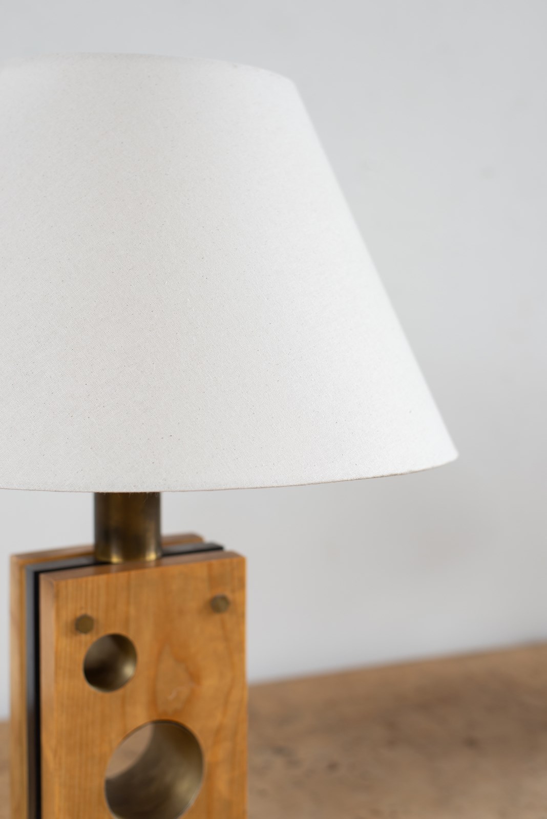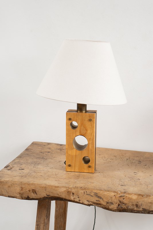 A tall, rectangular block wooden table lamp, with circular brass-lined apertures.  From Italy, C1970, and in very good vintage condition. Finished with a bespoke off-white linen shade, with a hand stitch to the seam. This piece has been professionally rewired and PAT tested.