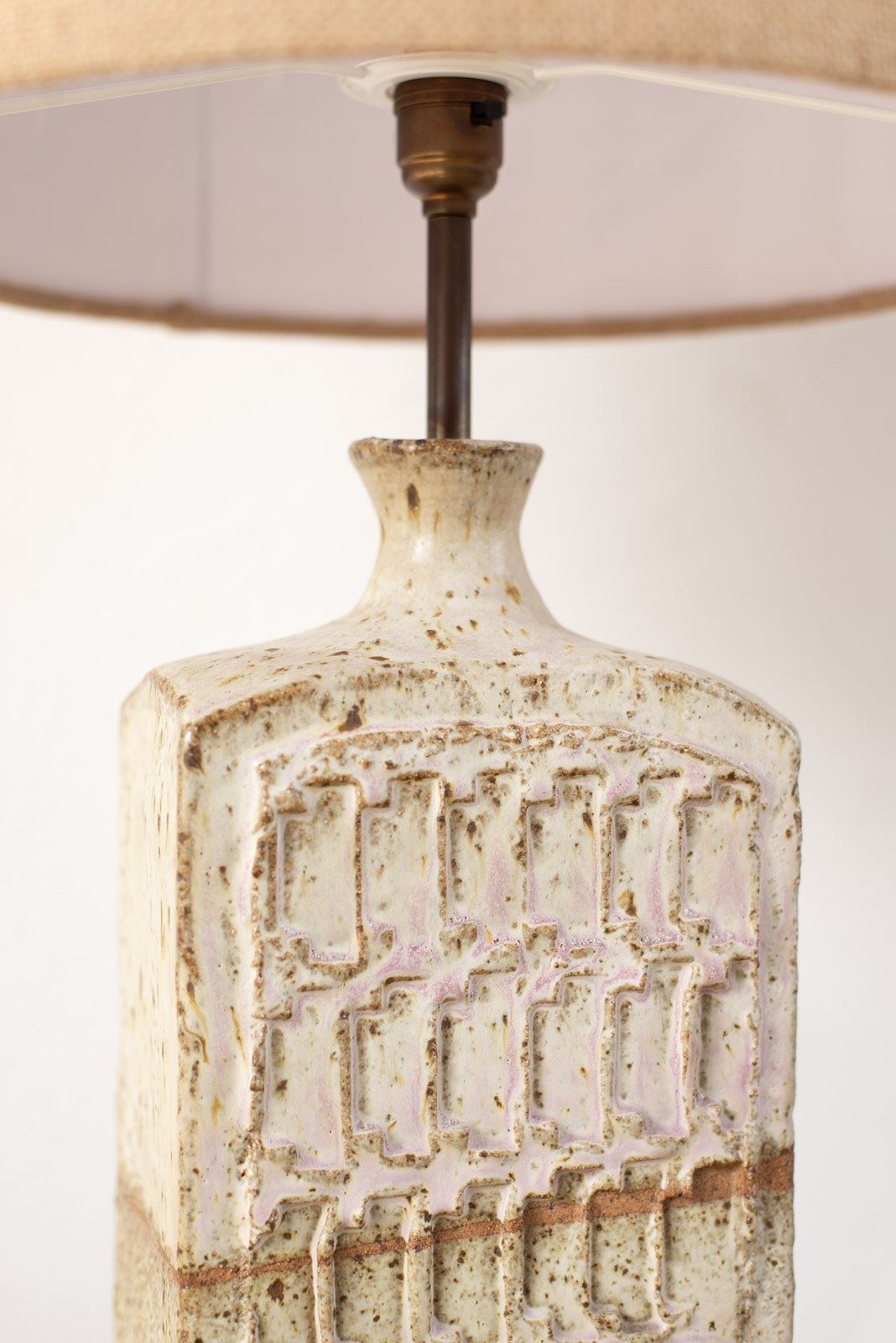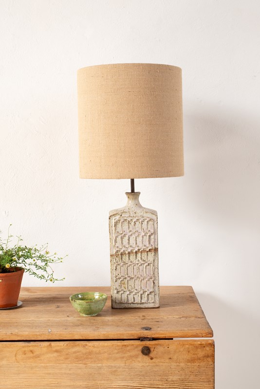 An English earthenware studio pottery lamp base, with a textured surface glazed in bone with a very soft pink highlight, C1970.  Hand-built in a softened rectangular shape, and finished with a bespoke natural hessian shade.   This piece is in excellent vintage condition and has been professionally rewired and PAT tested.
