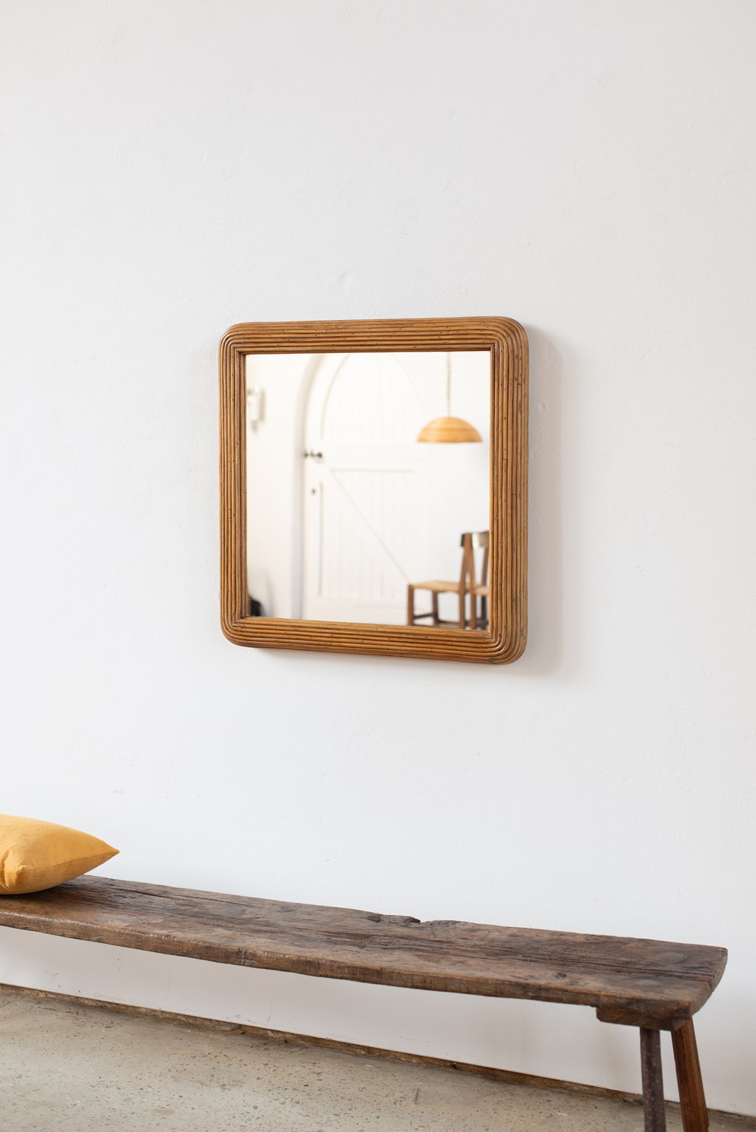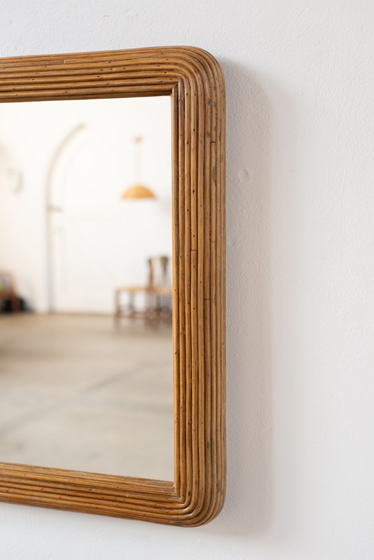 A generous reeded cane mirror by the renowned Italian company Vivai Del Sud.  Created using closely pinned sticks of cane, which have been steamed and bent to make a substantial cushion-style square frame, C1960/70.