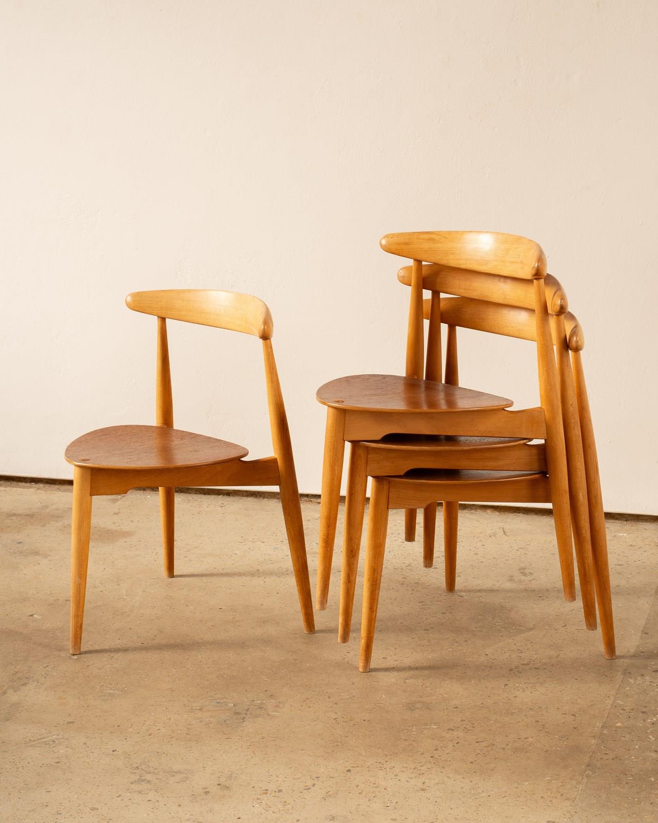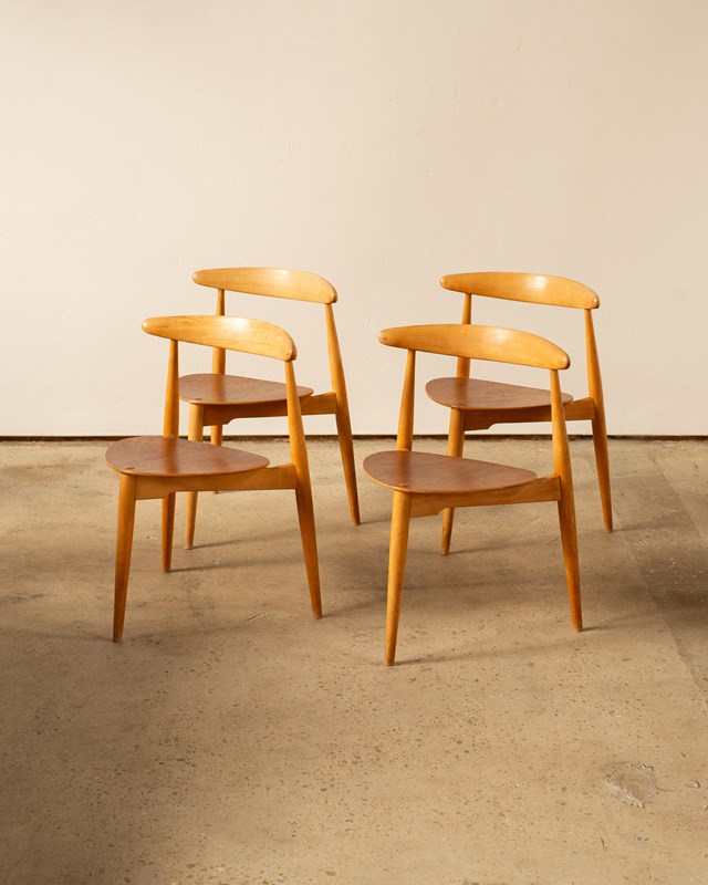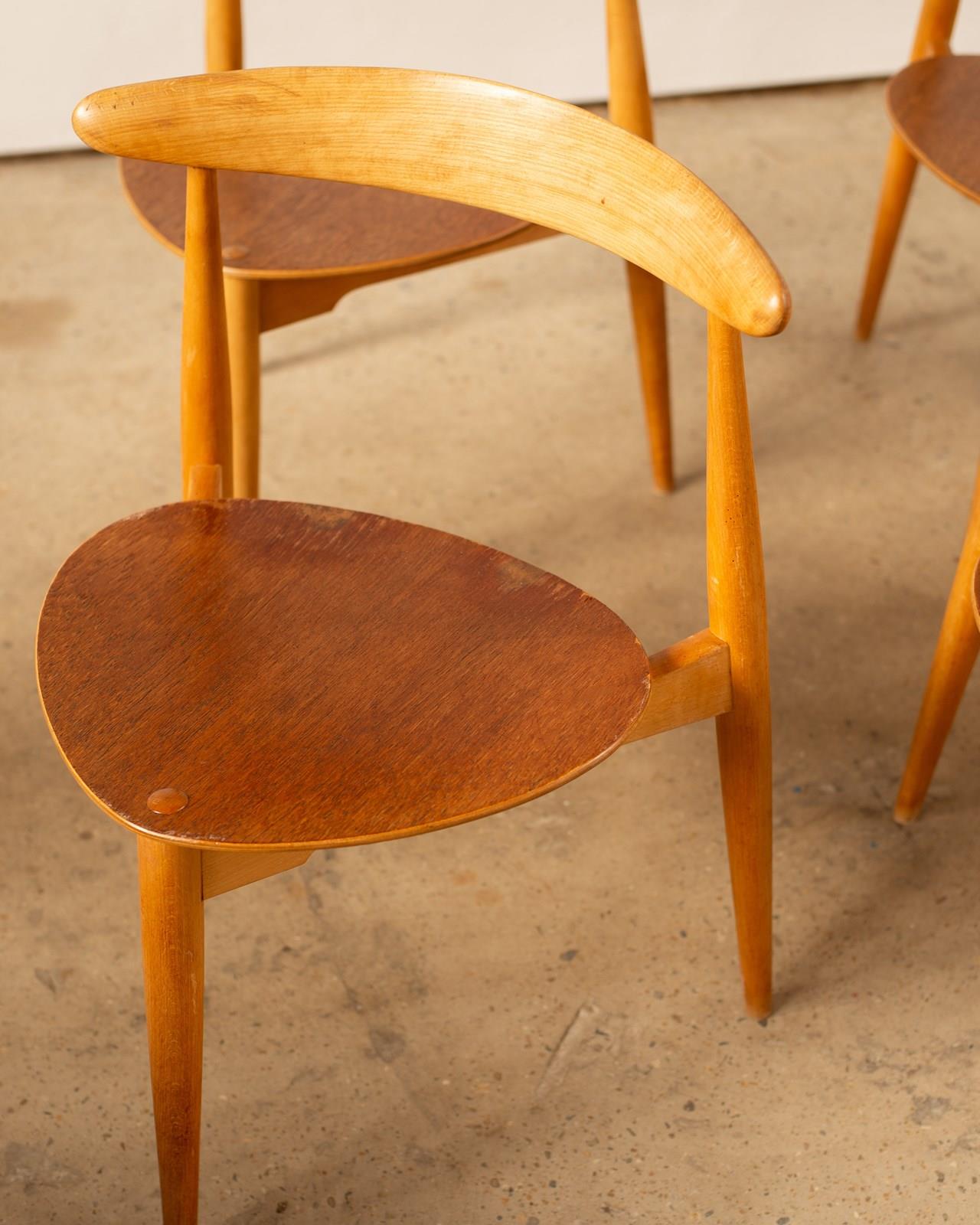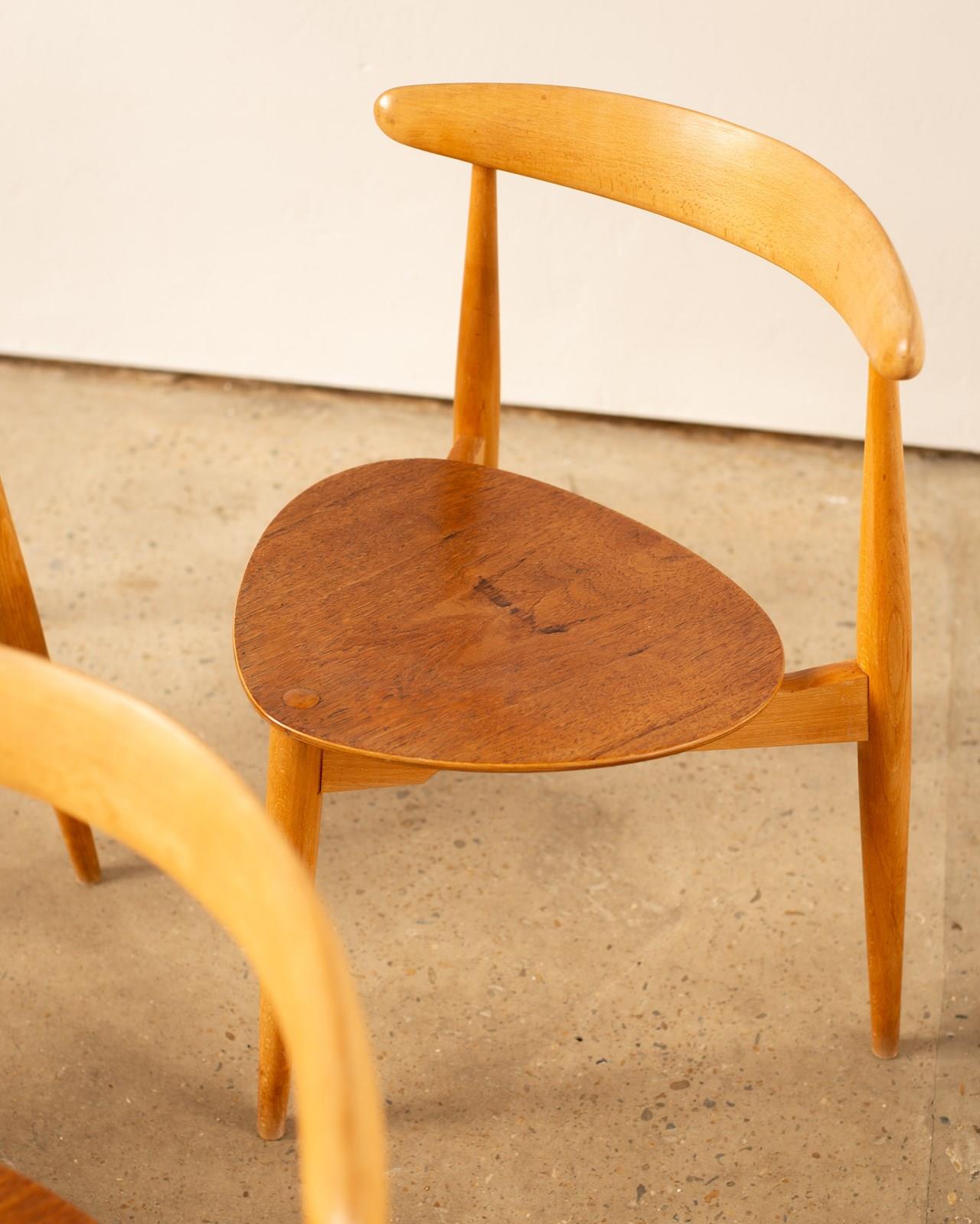 A set of 4 Hans Wegner Heart Chairs, model FH4103.  These were designed in 1952,  and constructed with a beech frame and teak plywood seat.   This combination of materials was unusual for Wegner, but desired by the manufacturer Fritz Hansen who were responsible for producing these chairs.   Completely original and in good vintage condition, with some wear to the  edges of the seats.