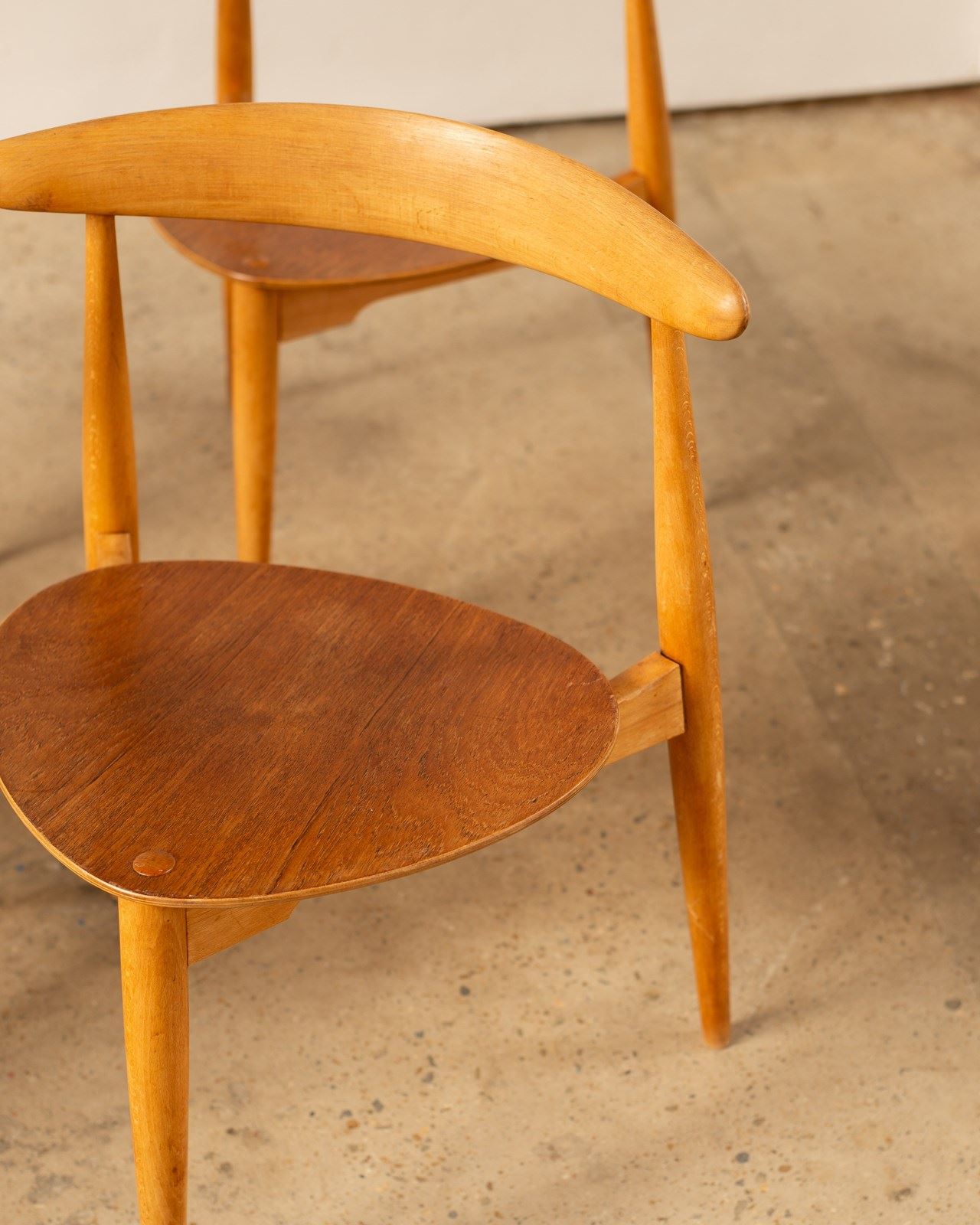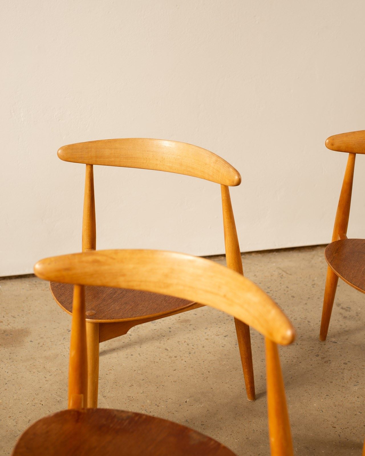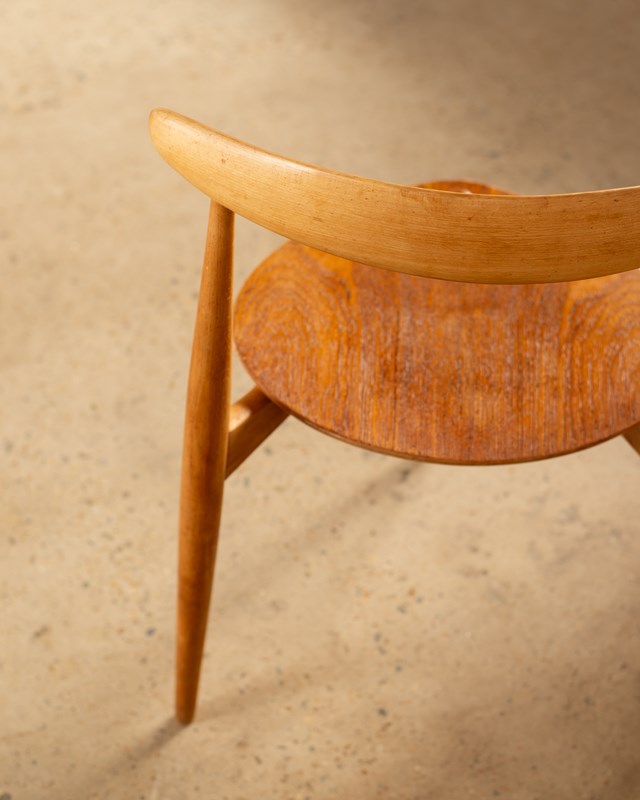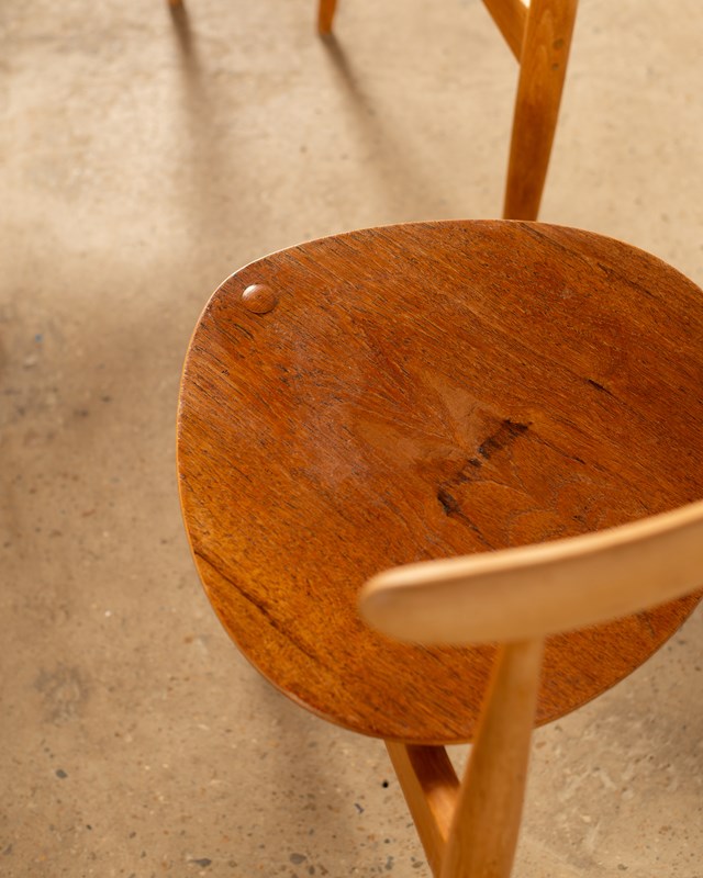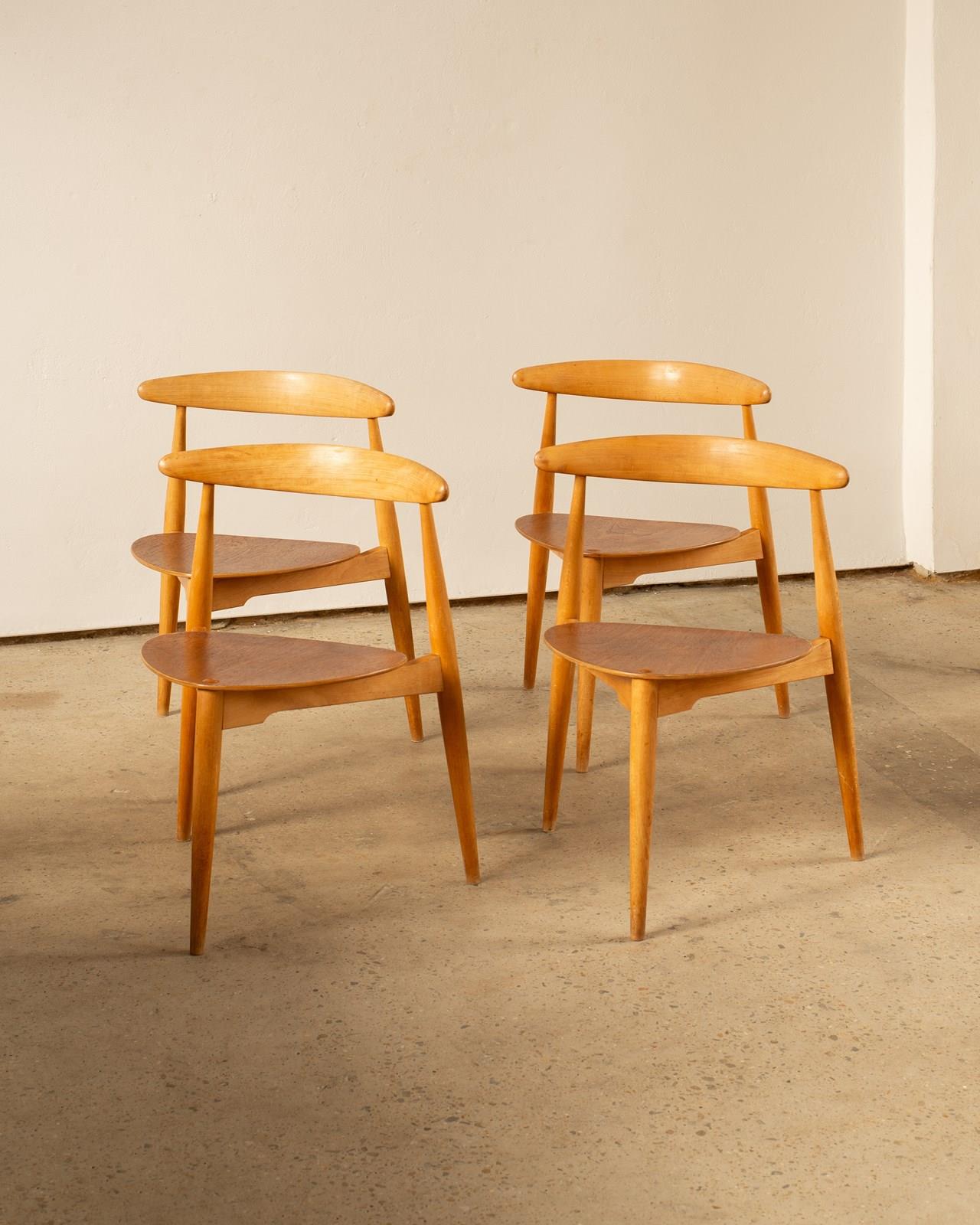 A set of 4 Hans Wegner Heart Chairs, model FH4103.  These were designed in 1952,  and constructed with a beech frame and teak plywood seat.   This combination of materials was unusual for Wegner, but desired by the manufacturer Fritz Hansen who were responsible for producing these chairs.   Completely original and in good vintage condition, with some wear to the  edges of the seats.