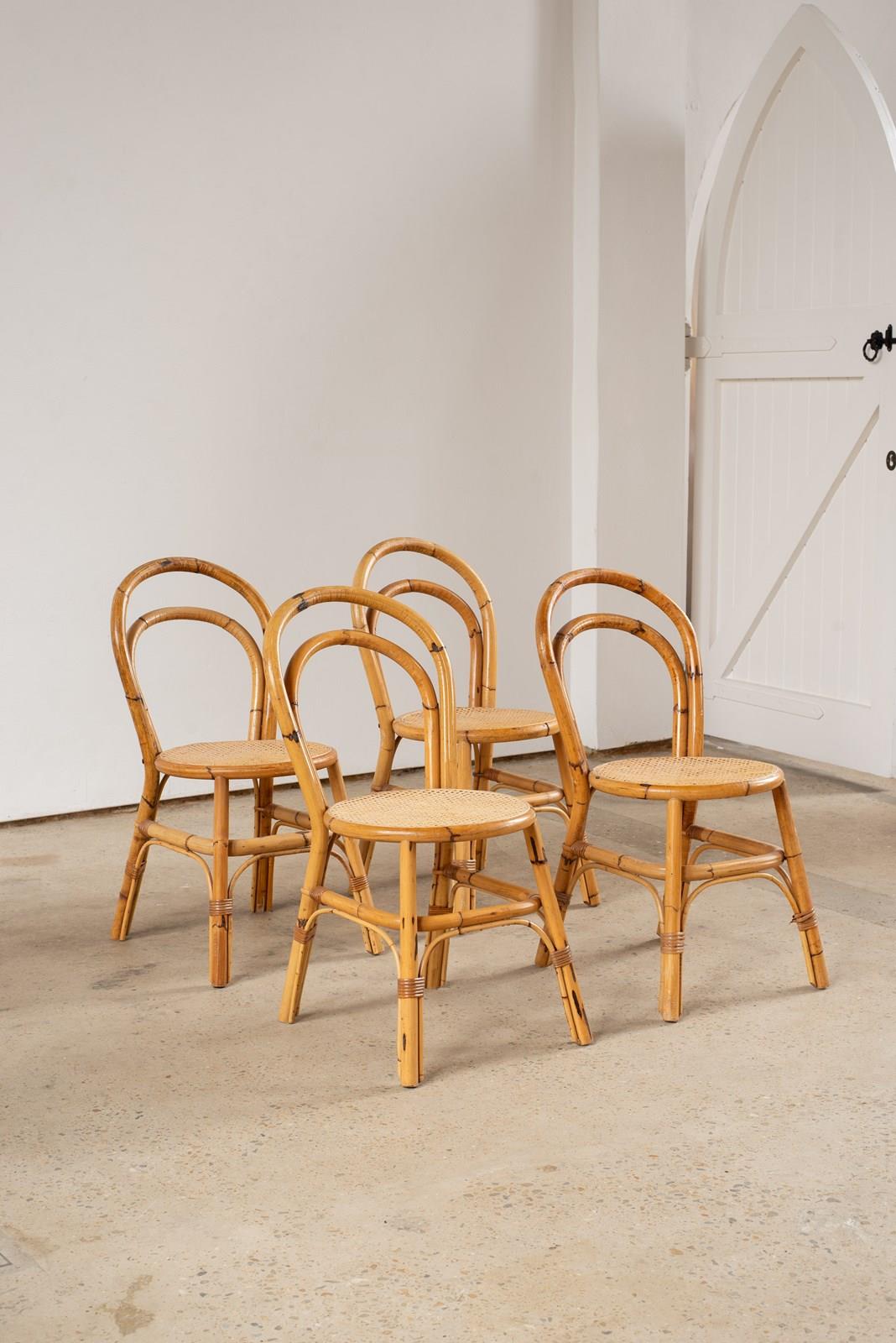 A set of four chairs constructed in bamboo and woven split cane, with a generous and comfortable balloon-shaped back.  From Italy, C1970, they are a rare find and are in very good vintage condition.