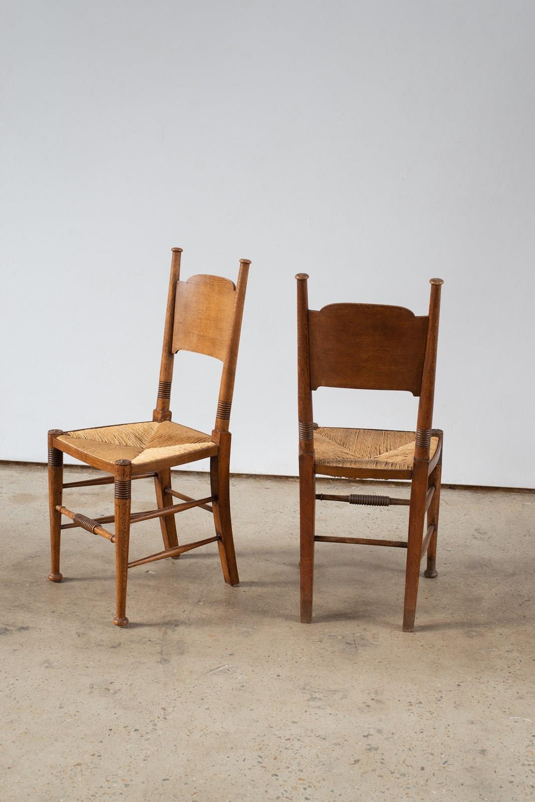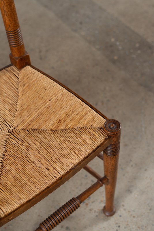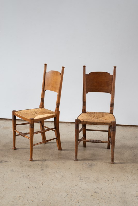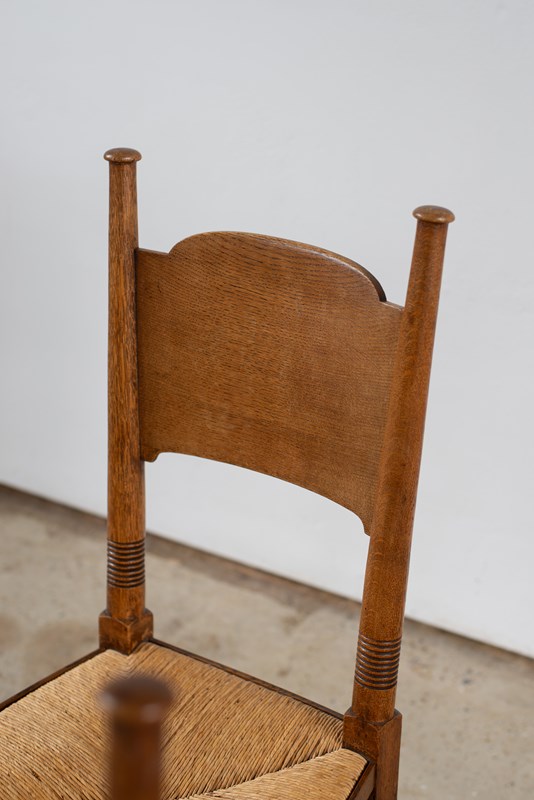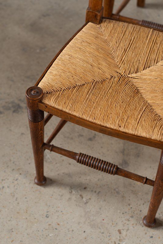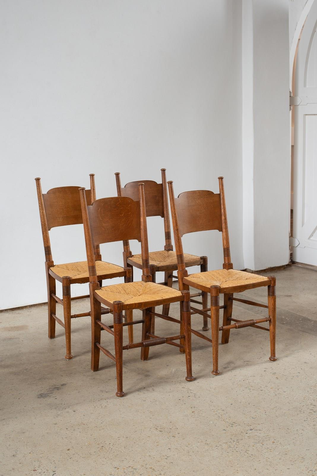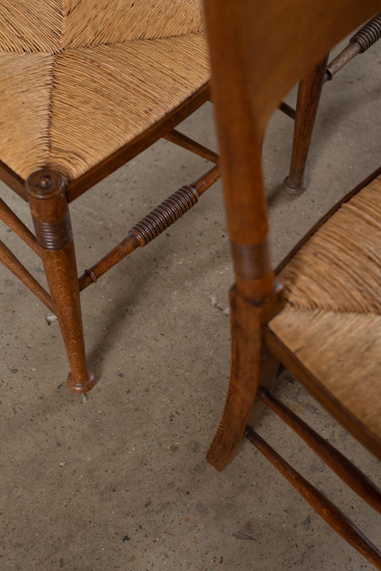 A set of 4 Arts and Crafts oak and rush chairs, C1900.  Created by the renowned British furniture makers William Birch, who were based in High Wycombe, a place synonymous with chair-making at that time.   This set has been historically re-rushed and is in very good antique condition.
