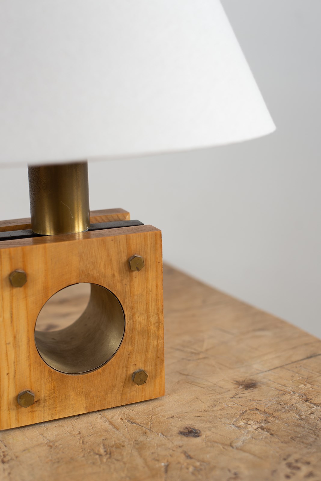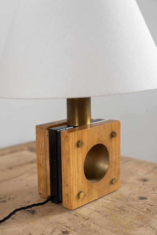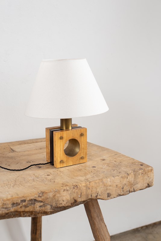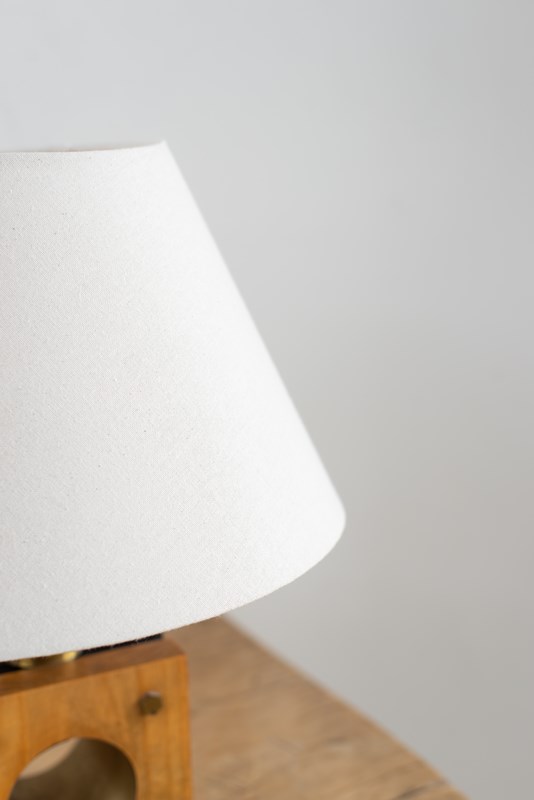 A square block wooden table lamp, with circular brass-lined apertures.  From Italy, C1970, and in very good vintage condition. Finished with a bespoke off-white linen shade, with a hand stitch to the seam. This piece has been professionally rewired and PAT tested.