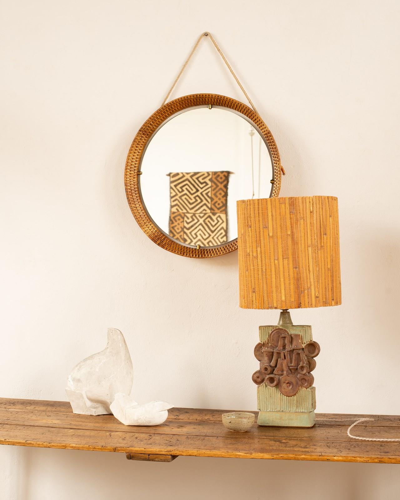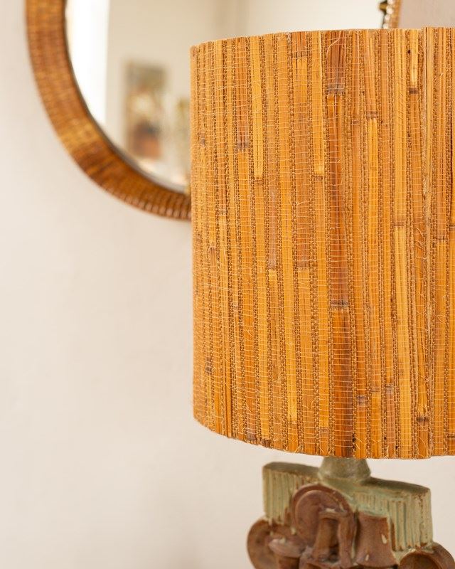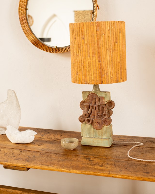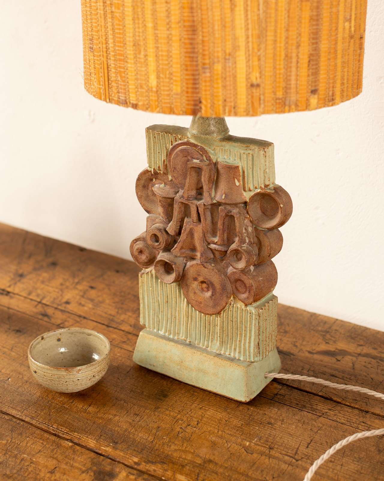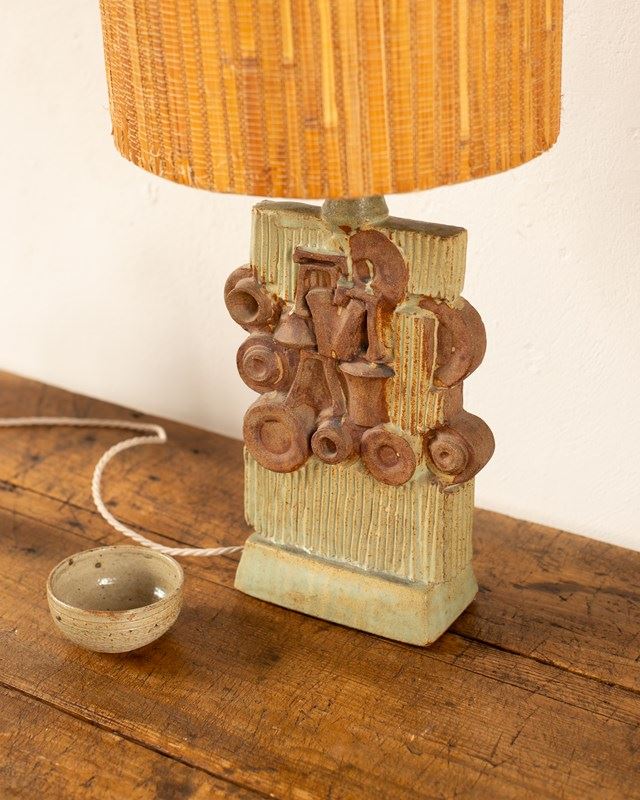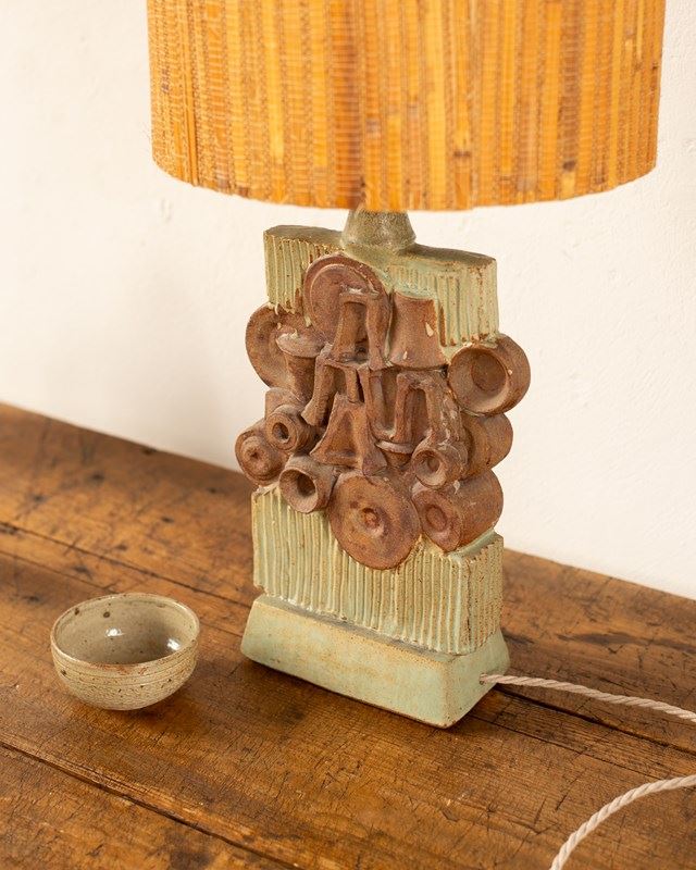 A  brutalist studio pottery lamp base by British ceramicist Bernard Rooke, complete with its original shade C1970.  The lamp base is wonderfully detailed, glazed in a soft green-grey which constrasts beautifully with the matt reddish brown clay.  It is in excellent condition.  The original shade is constructed using multiple strips of cane. It has a little loss in parts and some wear to the stitching but is in good order and wonderful to have intact.