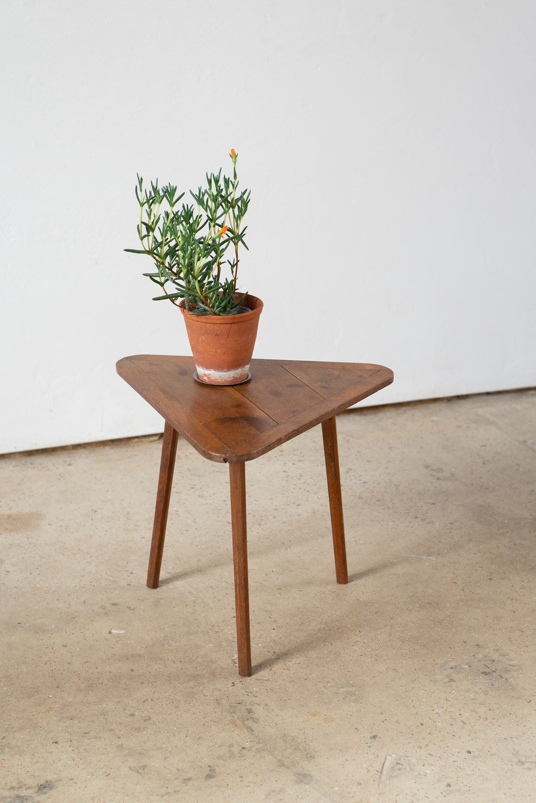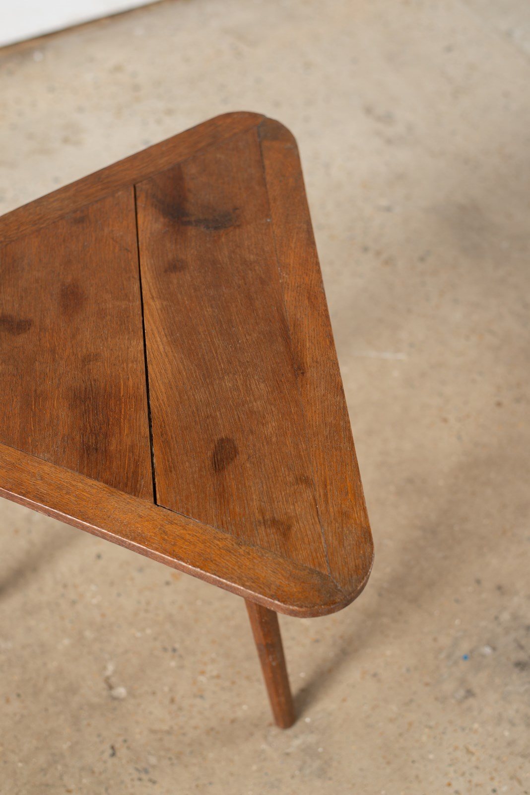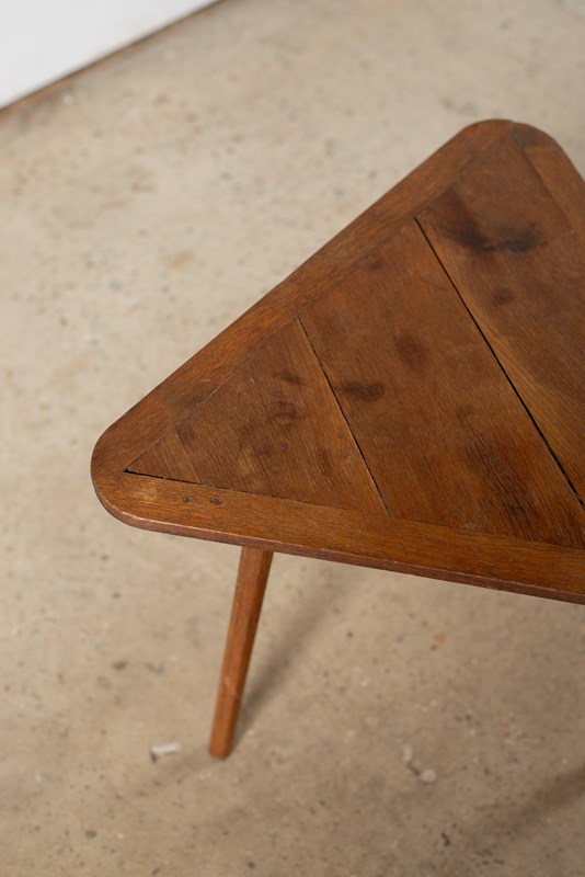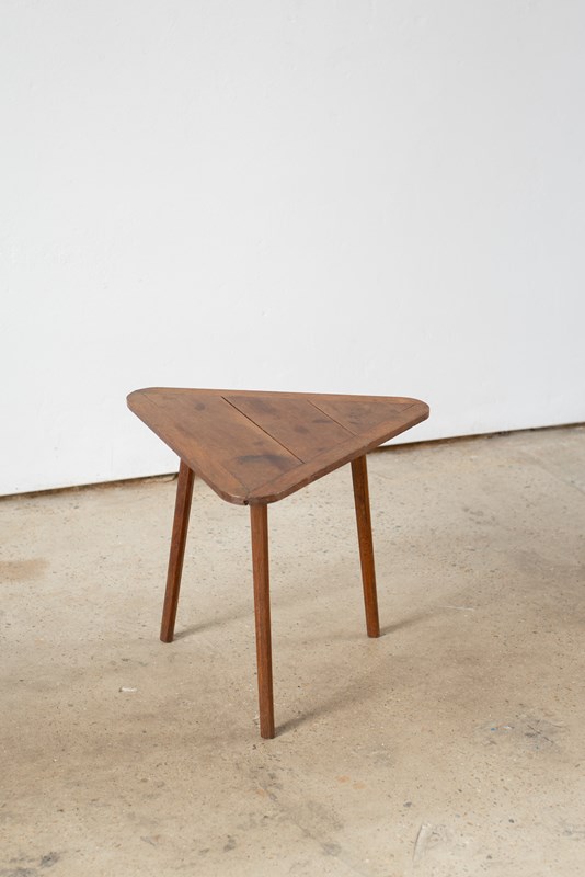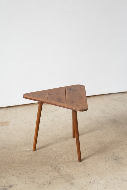A triangular wooden side table, with softly curved corners, C1930.  From France, this piece has fine stick legs and a beautifully designed,  wide plank top surface.  In good vintage condition.