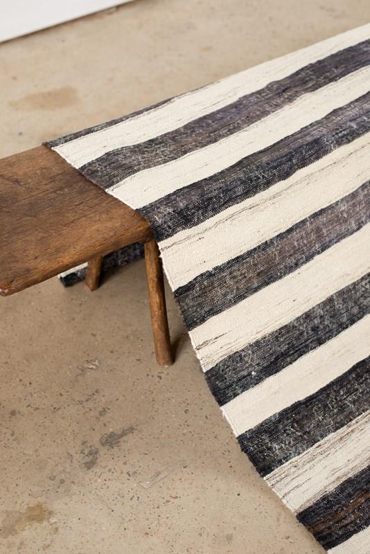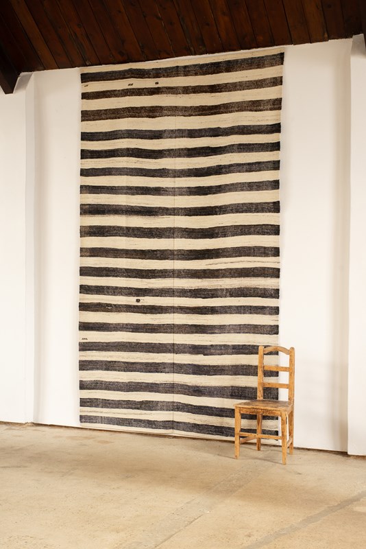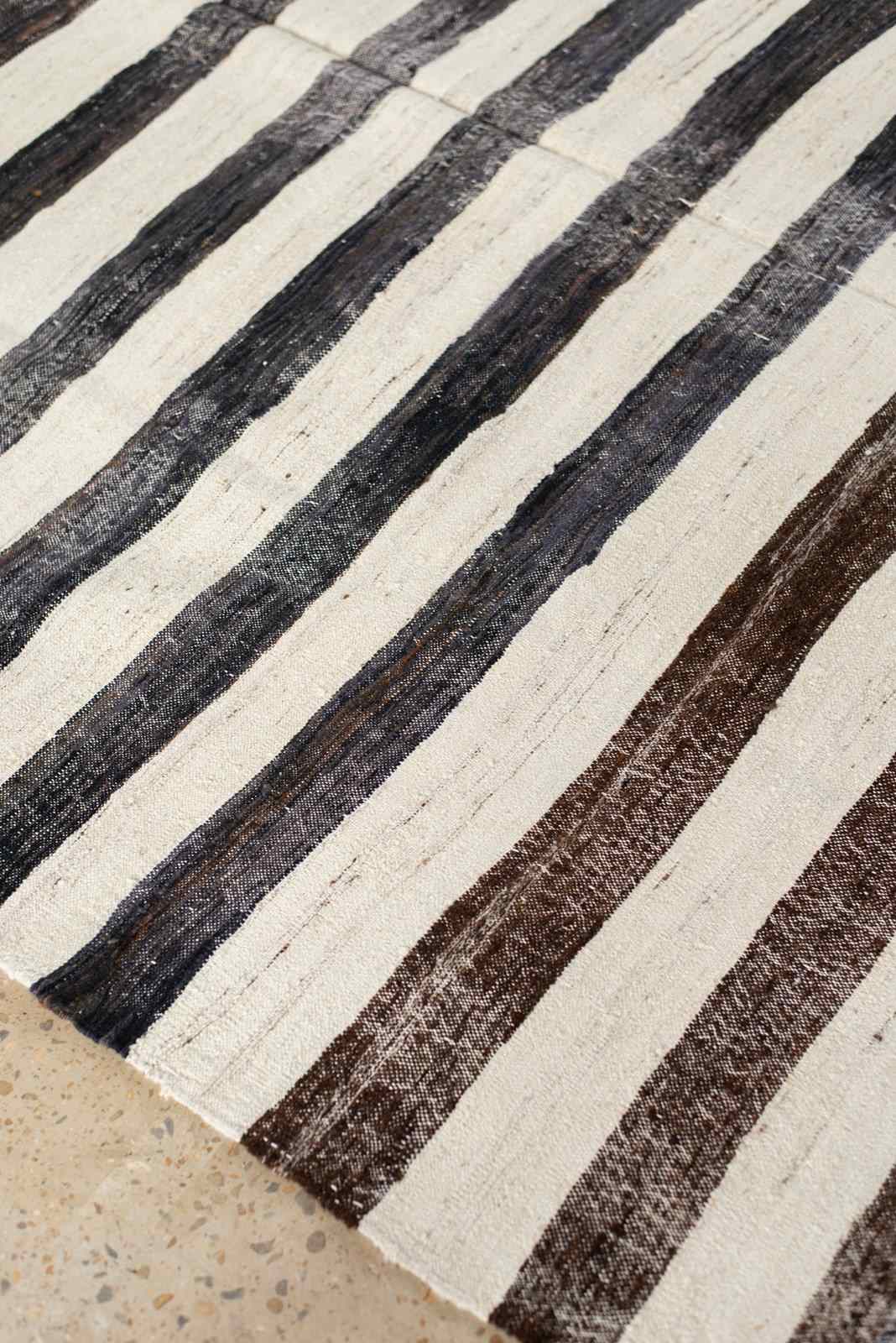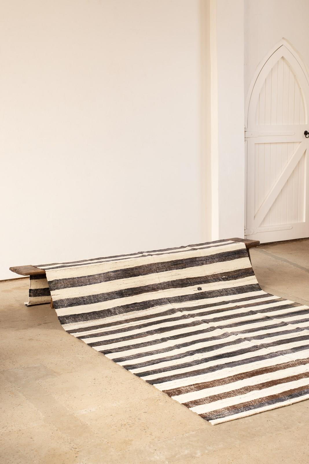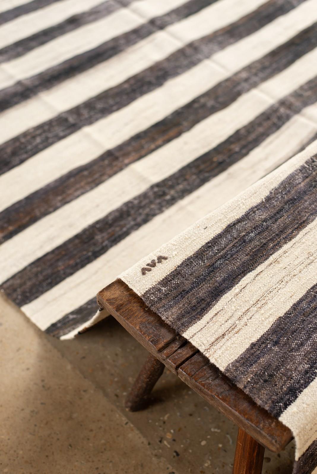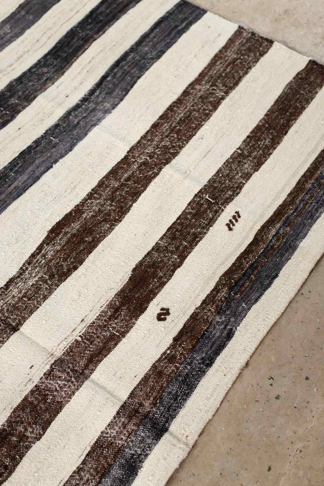 A large flat-weave Kilim from Turkey, in stripes of undyed wool and goat hair in tones of dark to mid chocolate and natural, C1960.   There are small graphic embroidered accents in undyed chocolate wool on some of the natural stripes.  In very good vintage condition.
