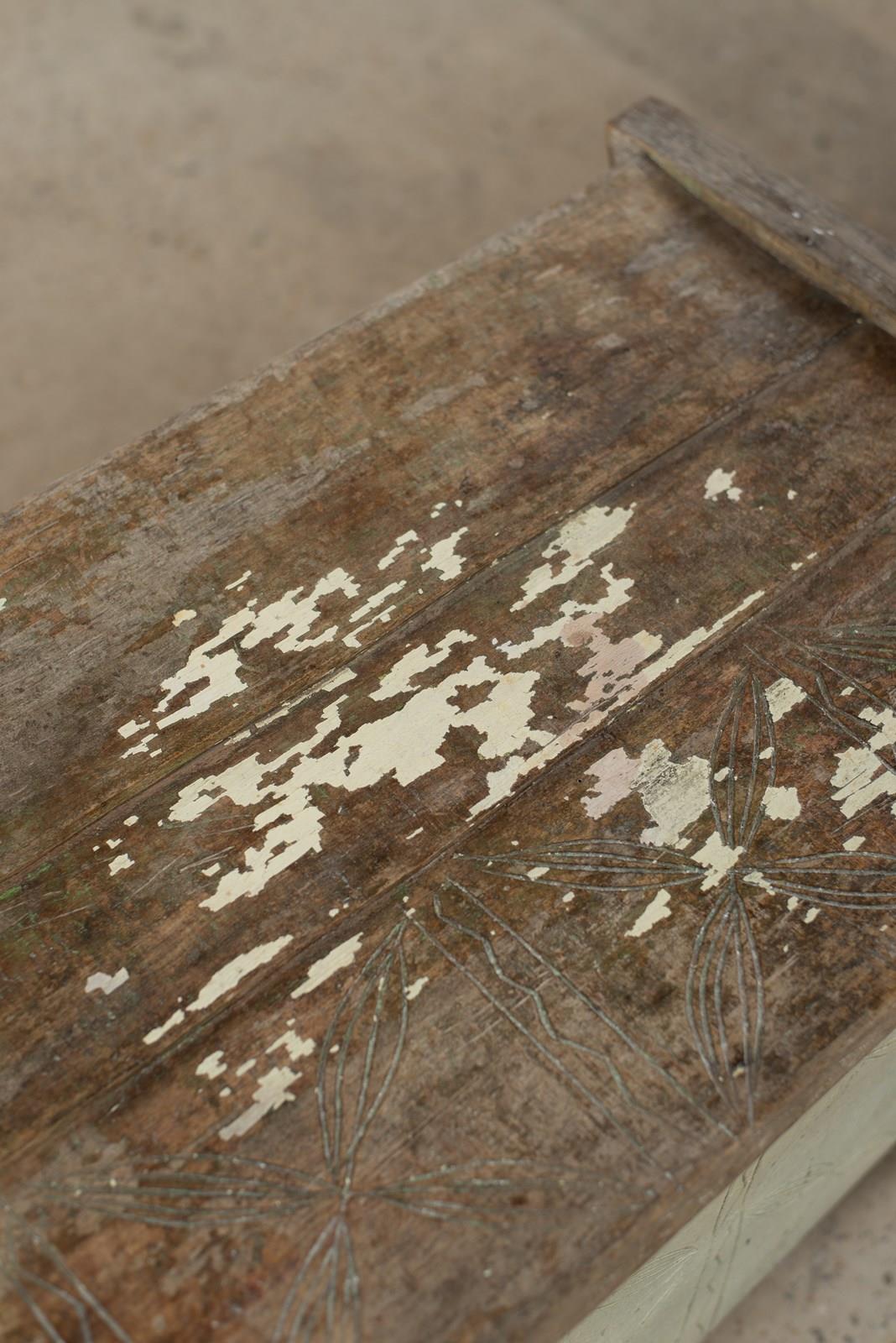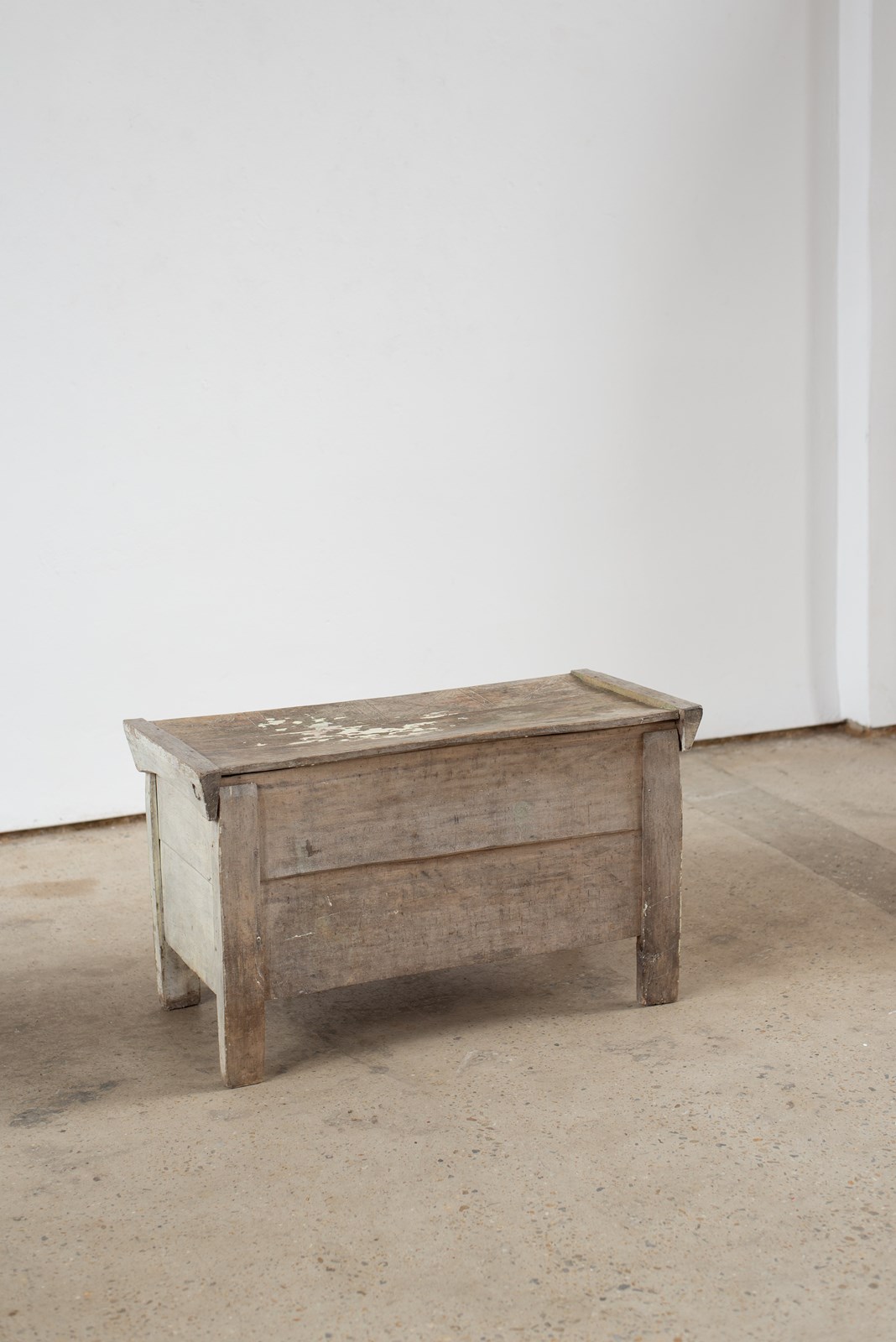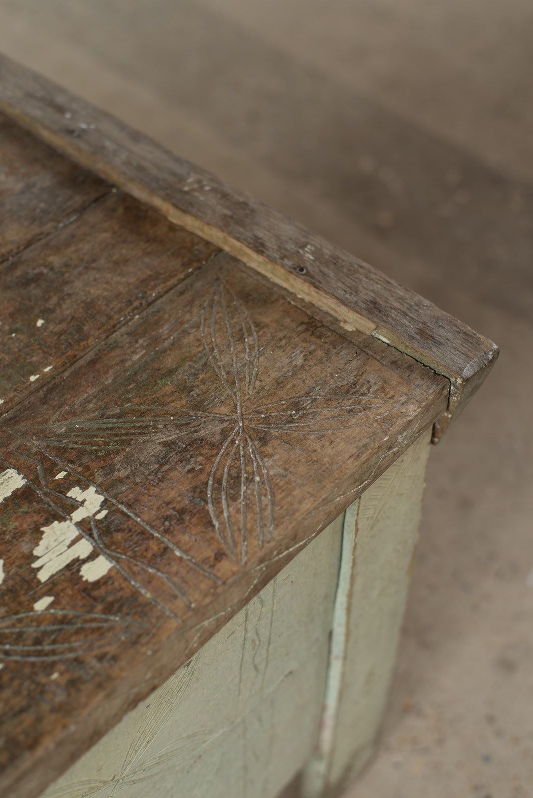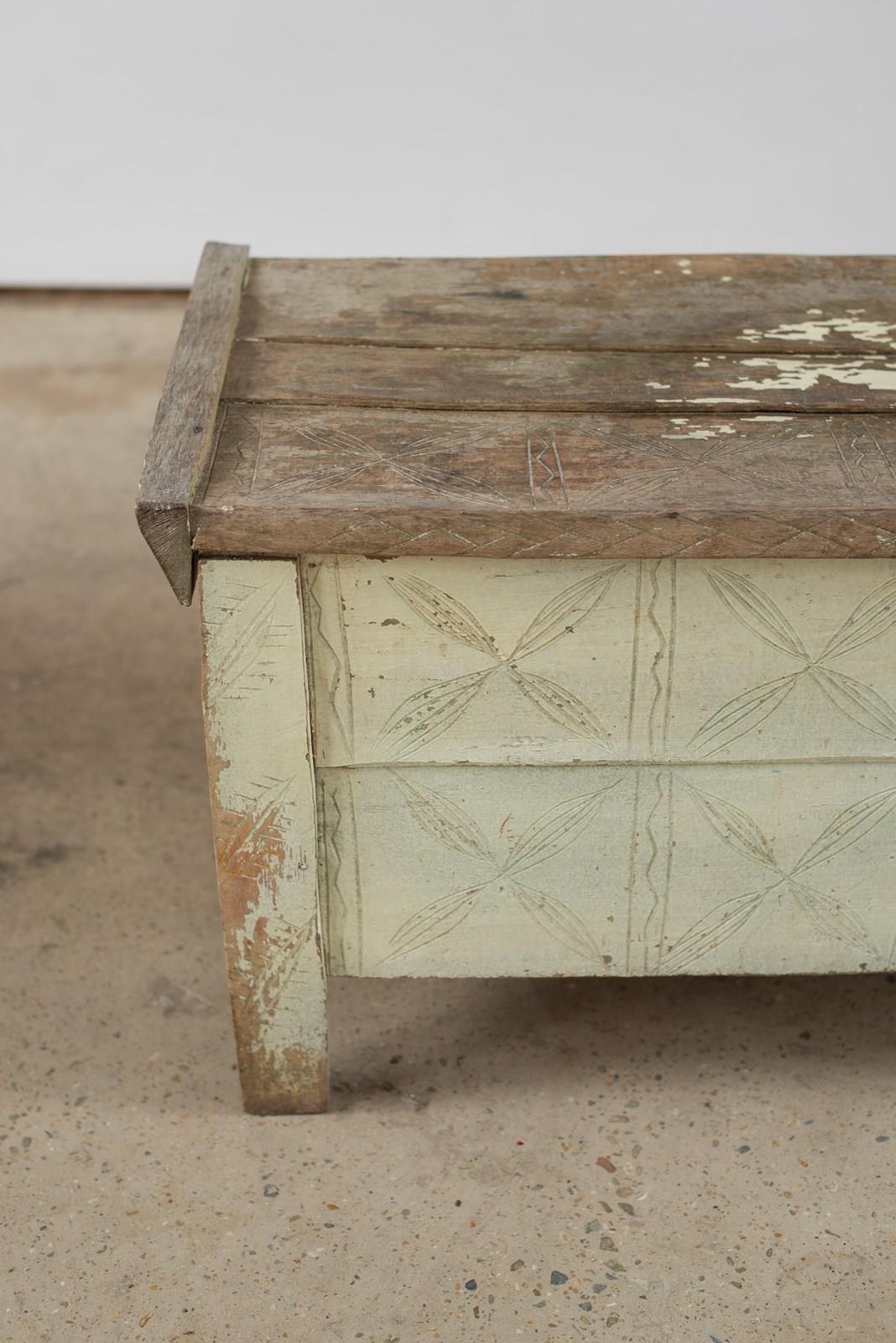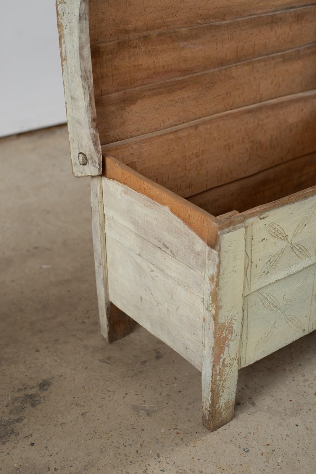 A rustic wooden coffer from the Carpathian Mountains, C1880, with its original chalk white paint. Handcrafted using layered planks of wood and decorated with naive carvings. There is a wonderful depth of age and history to this piece, as befits its former rural life, with repairs evident to the surface.